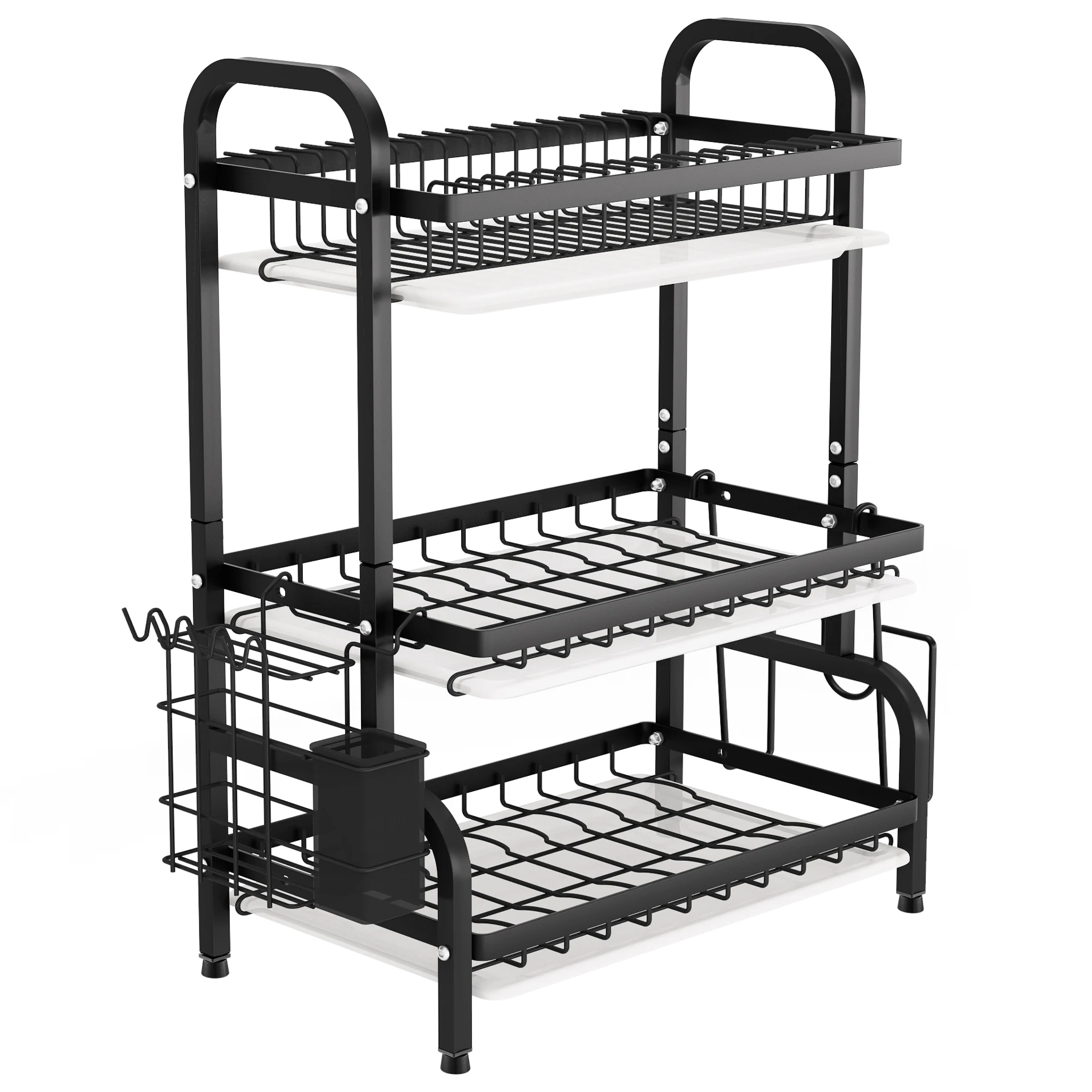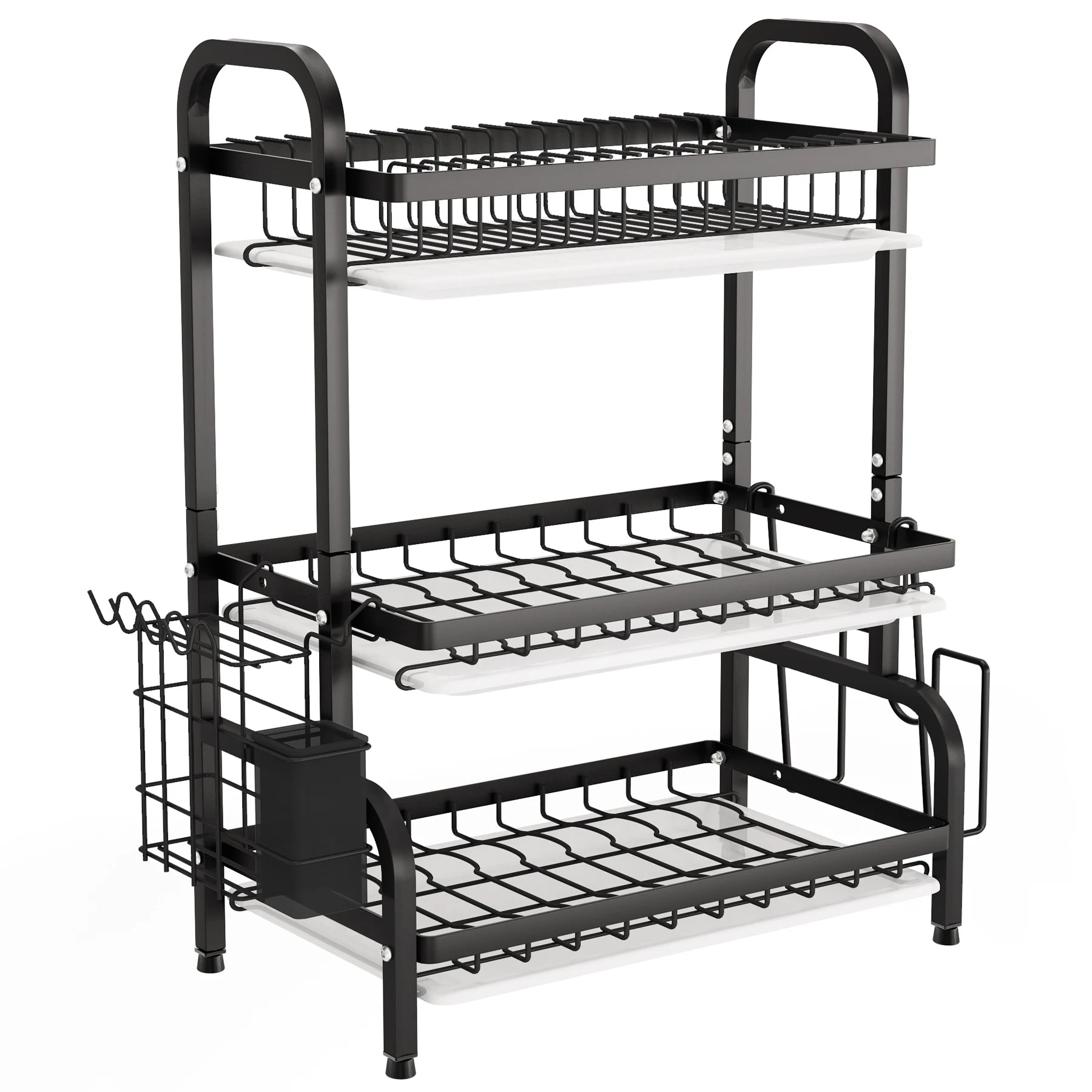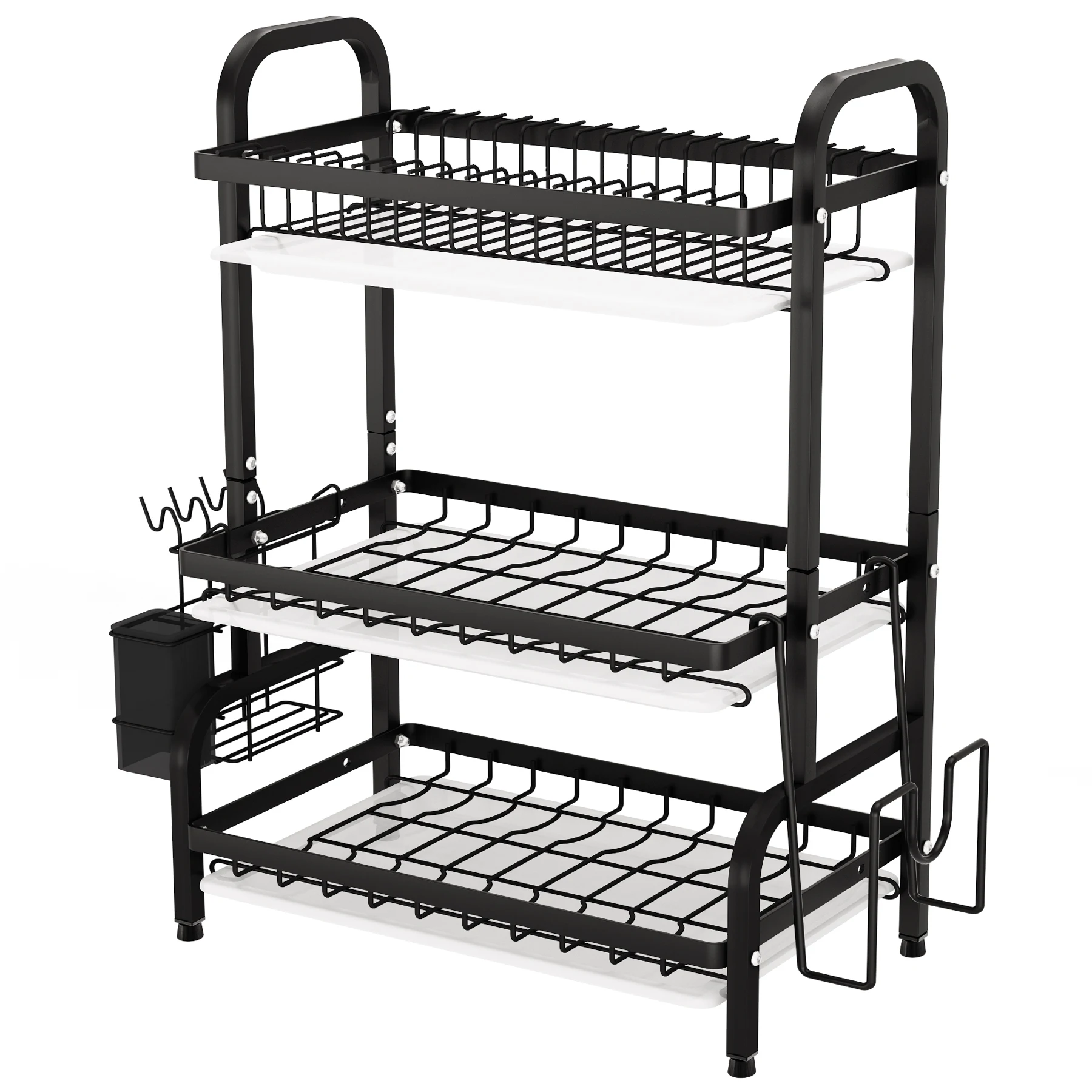 Drying Rack, Metal 3-Tier Large Capacity Dish Rack with Utensil Holder, Cutting Board Holder, Drain Board Tray for Kitchen