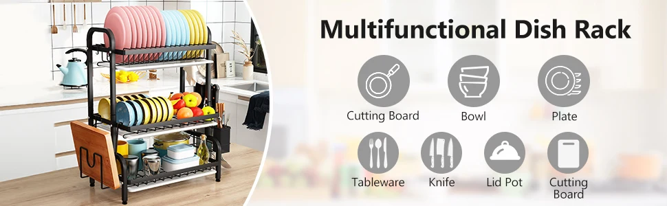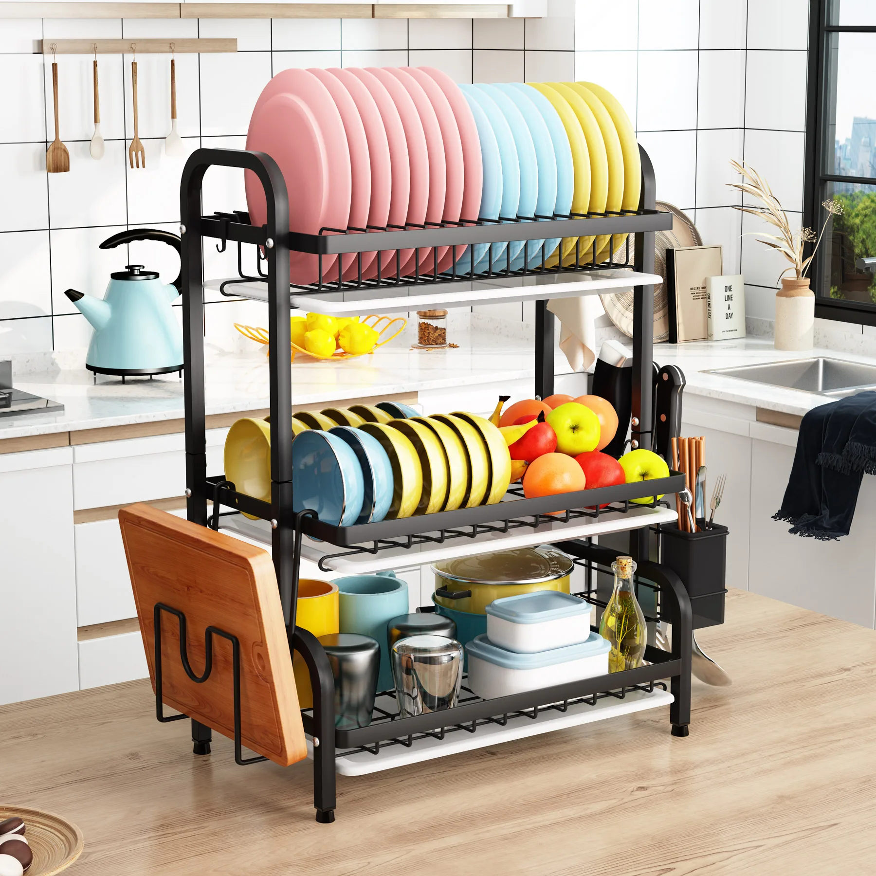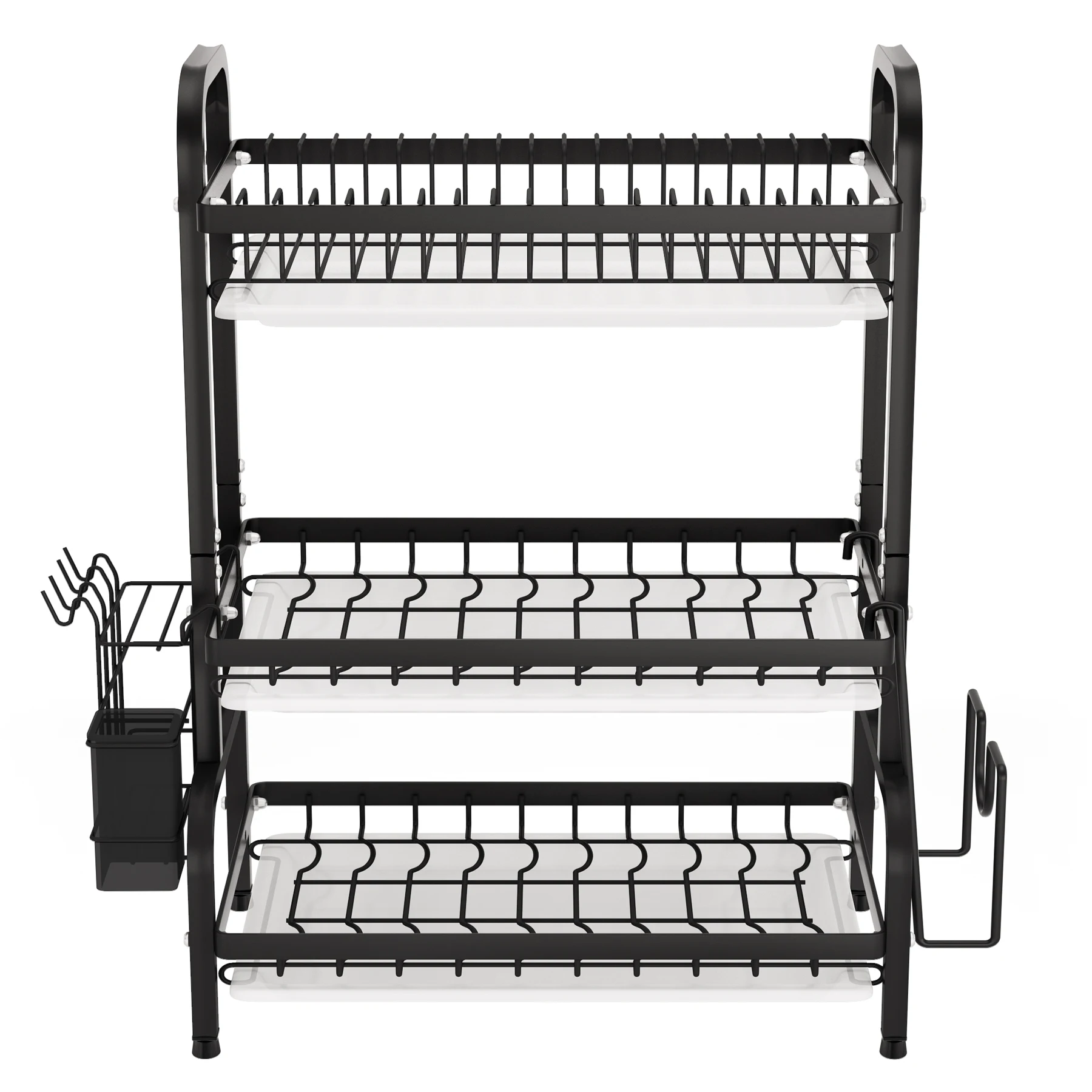Drying Rack, Metal 3-Tier Large Capacity Dish Rack with Utensil Holder, Cutting Board Holder, Drain Board Tray for Kitchen