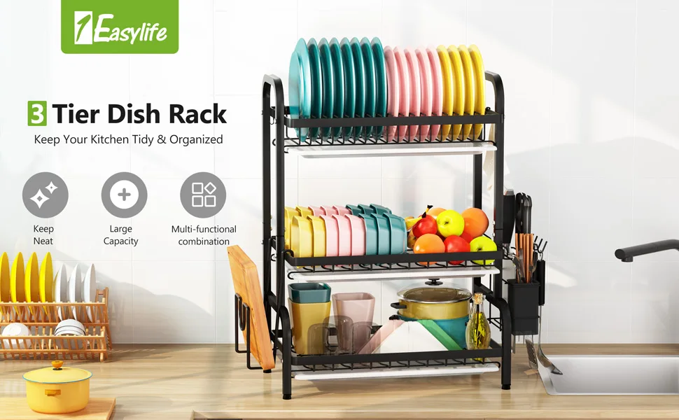 3 TIER LARGE CAPACITY - The 1Easylife 3 tier dish drying rack can hold more tableware than the traditional 1 or 2 tier ones. Which includes 1 dish rack, 1 Utensil Holder, 1 knife and cutlery holder, 1 cutting board holder, and 3 Removable Drain Board. On the third tier, it can put about 17 plates, and the other two tiers to put bowls, cups, pans, pots, bottles, etc. The sides are equipped with a utensil holder and a cutting board holder, practical to dry all the silverware.