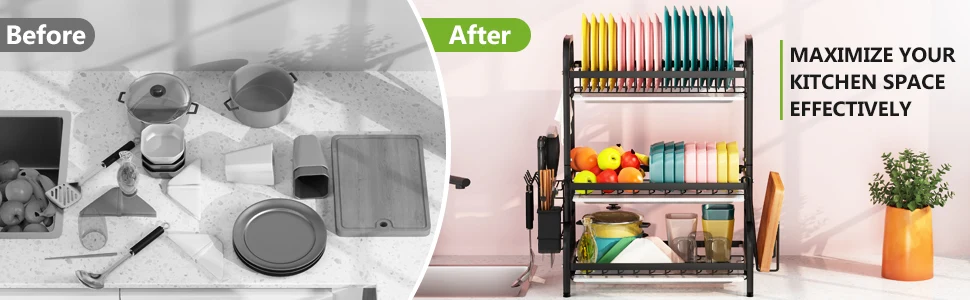 TAKES UP LESS SPACE - 3-tier vertical design dish rack takes up little horizontal space. Size of 16.54 "L * 9.84" W * 24.8 "H, the dish drainer for kitchen with 3 tier design meets the family's basic needs. Reasonable space organizes to give a feeling of a more open countertop. Please carefully measure the height between the cabinet and the countertop before making a choice, especially reserve space for the height of the plate.