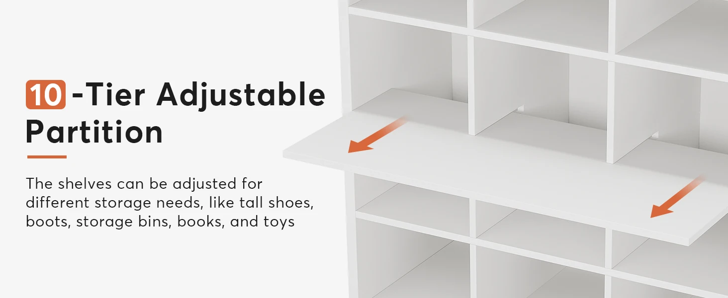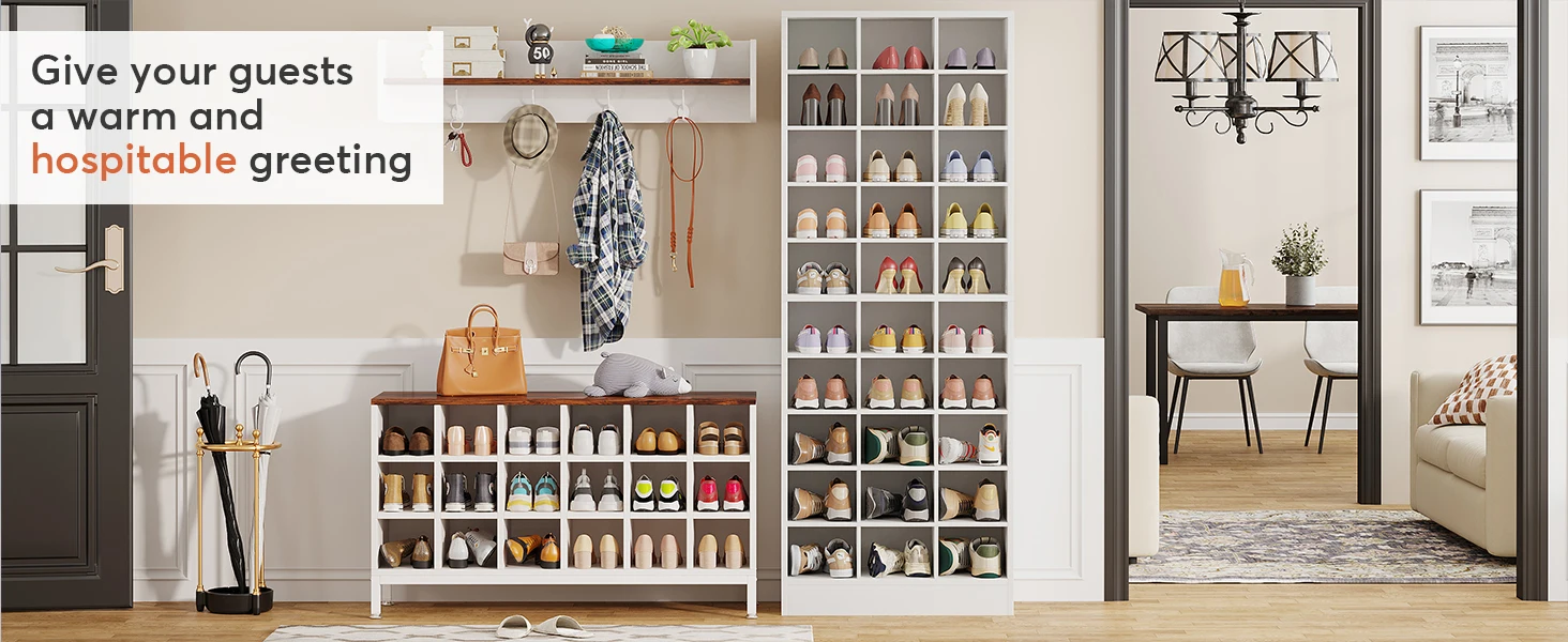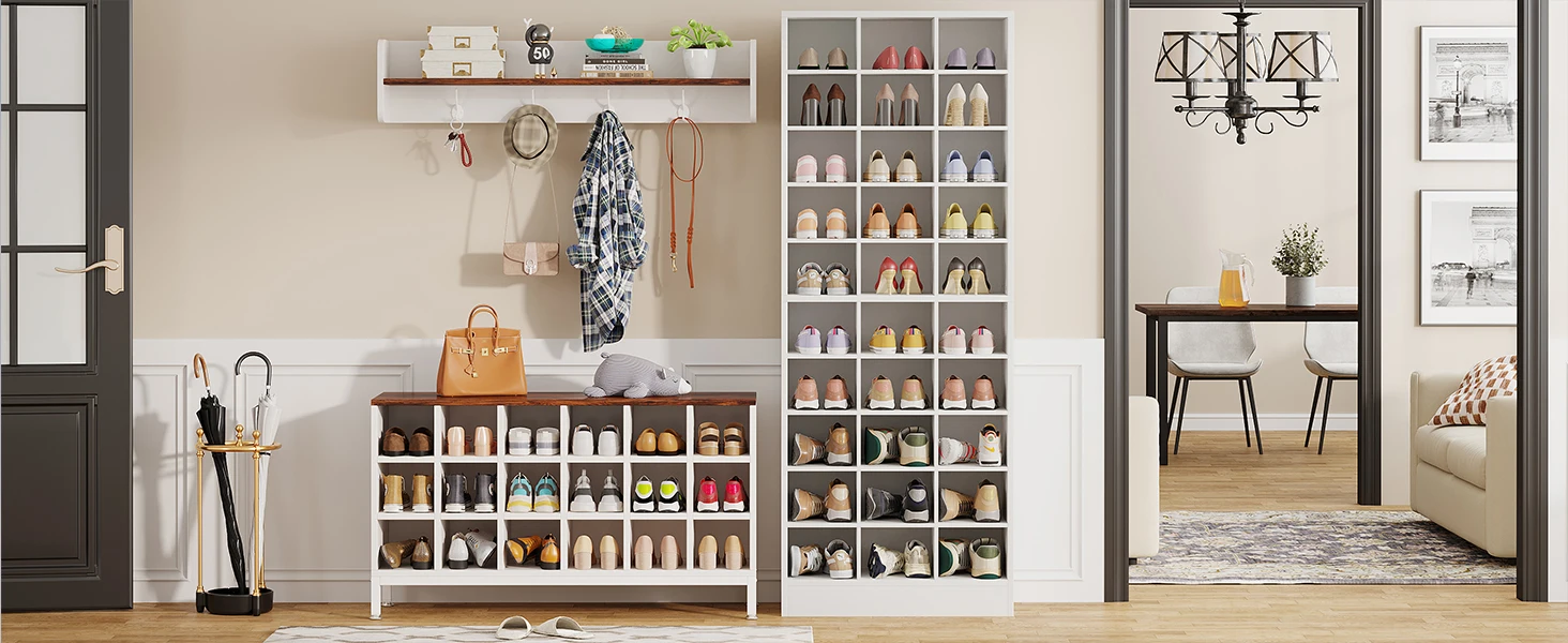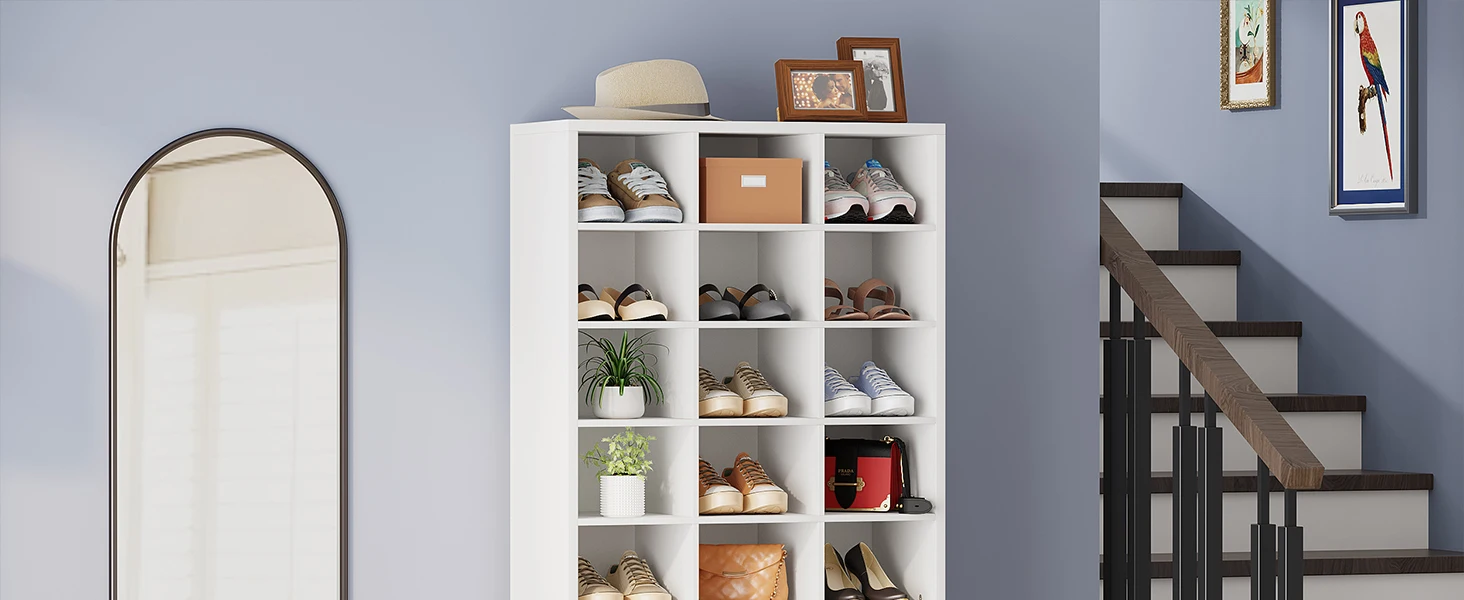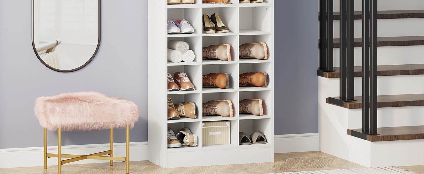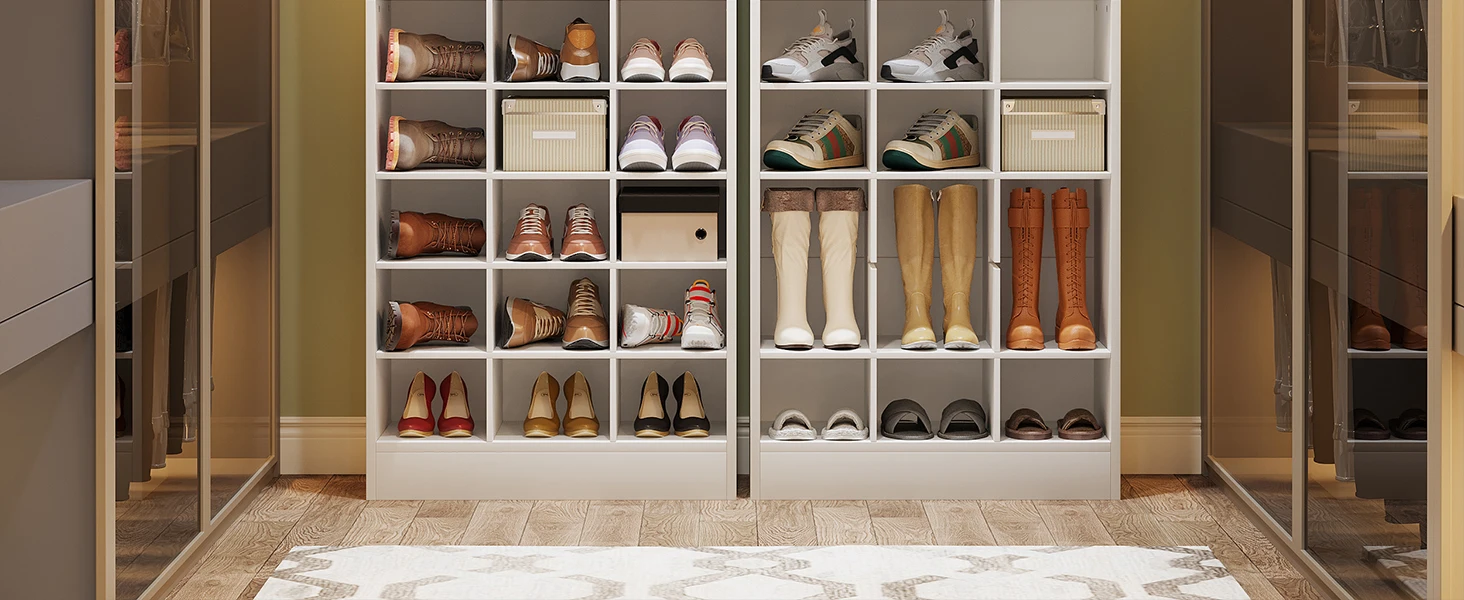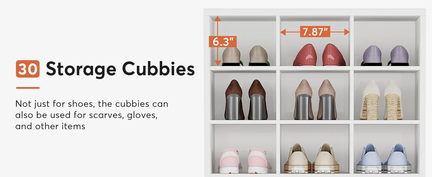 【Flexible Structure to Fit Shoes】This tall shoe cabinet with 30 cubbies is sufficient to store flats, sneakers, and high heels, you can also remove some shelves to store tall boots. Suitable for men's and women's sizes! (Please note that if your shoes are bigger, we recommend one cubby to place one shoe that will be better.)