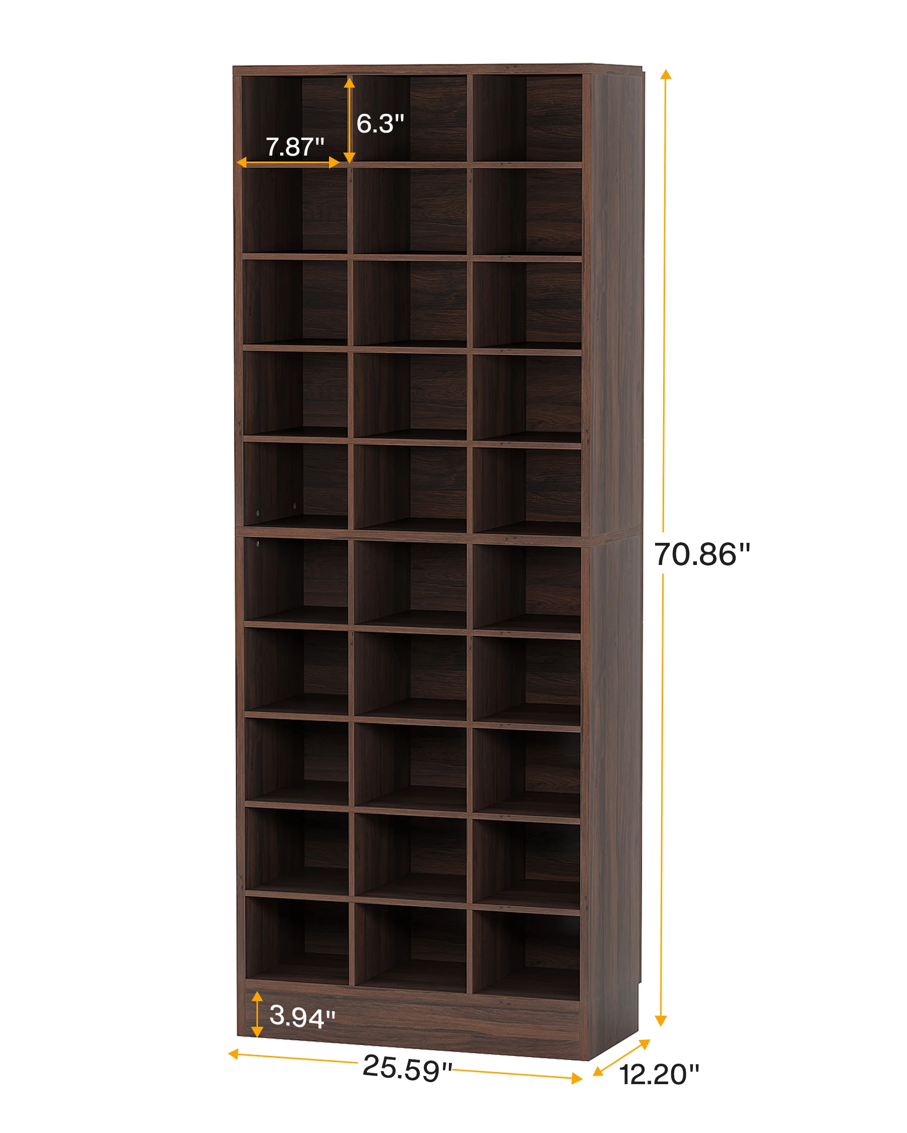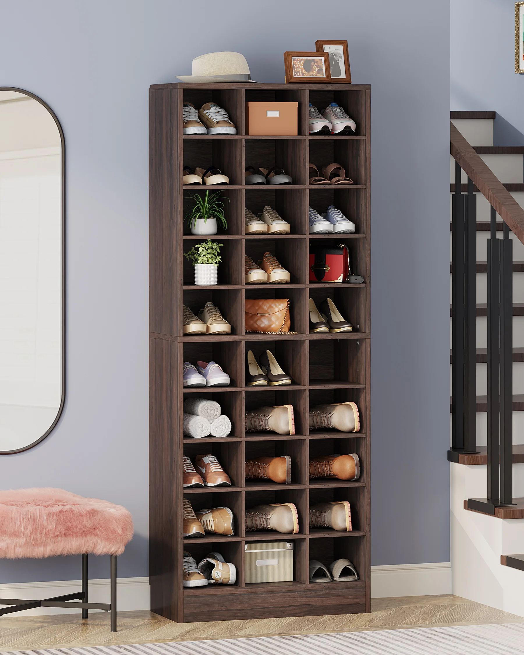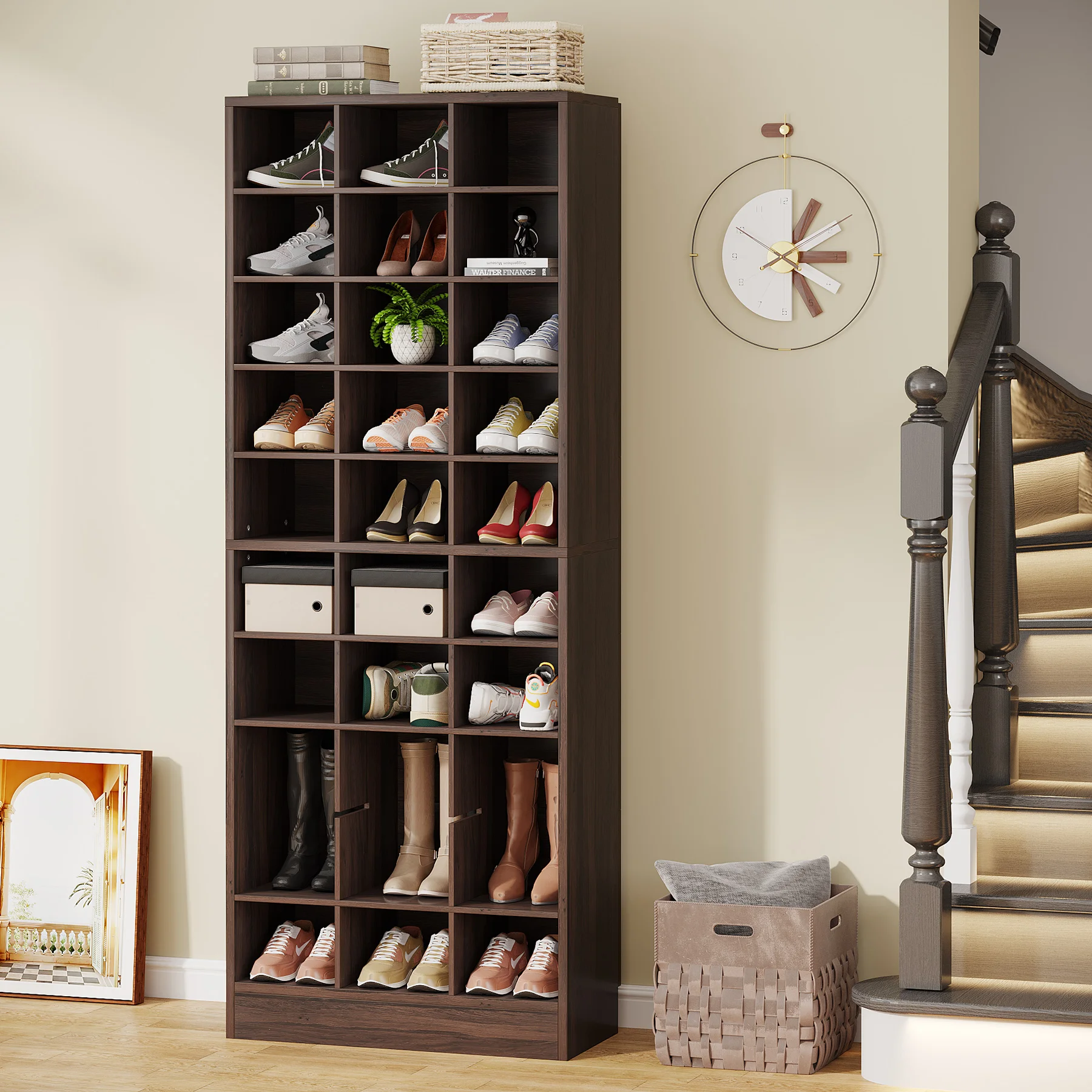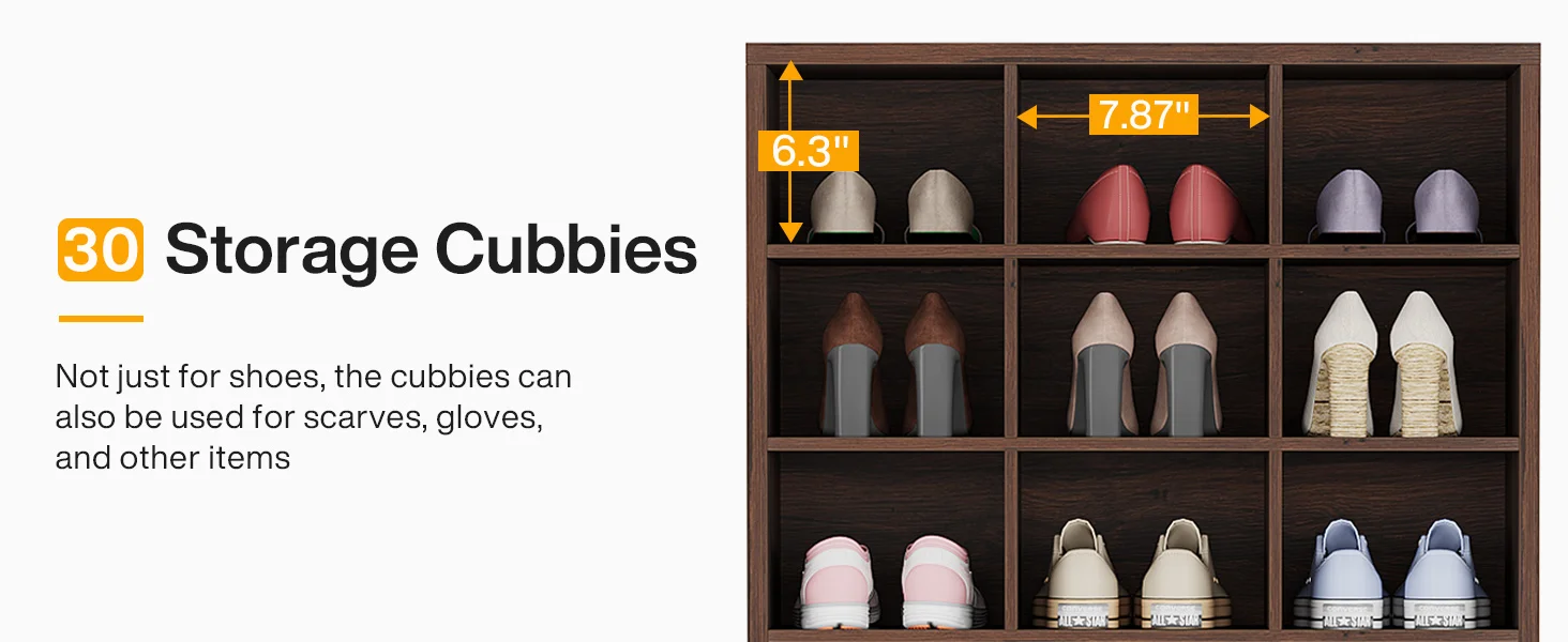 【More Space, Less Bulk】: The shoe storage cabinet is built with 30 cubbies to provide enough storage space for shoes, sneakers, slippers, and high heels. The bottom shelf is enough to store boots, baskets, and other items. Come on! Let your imagination run. It is not only a shoe rack but also your collection racks, such as bags, fabric, hats, and craft supplies.