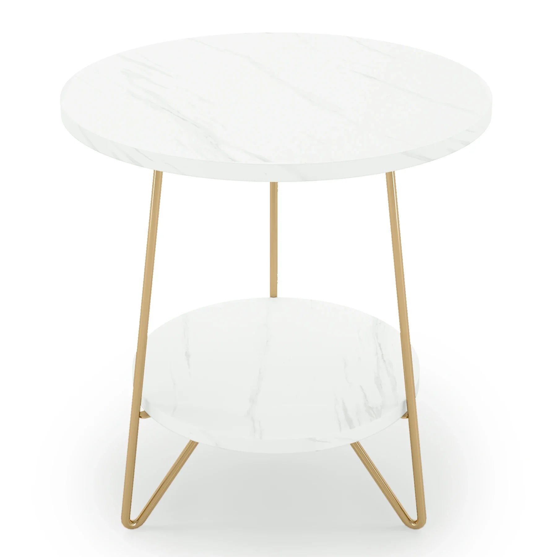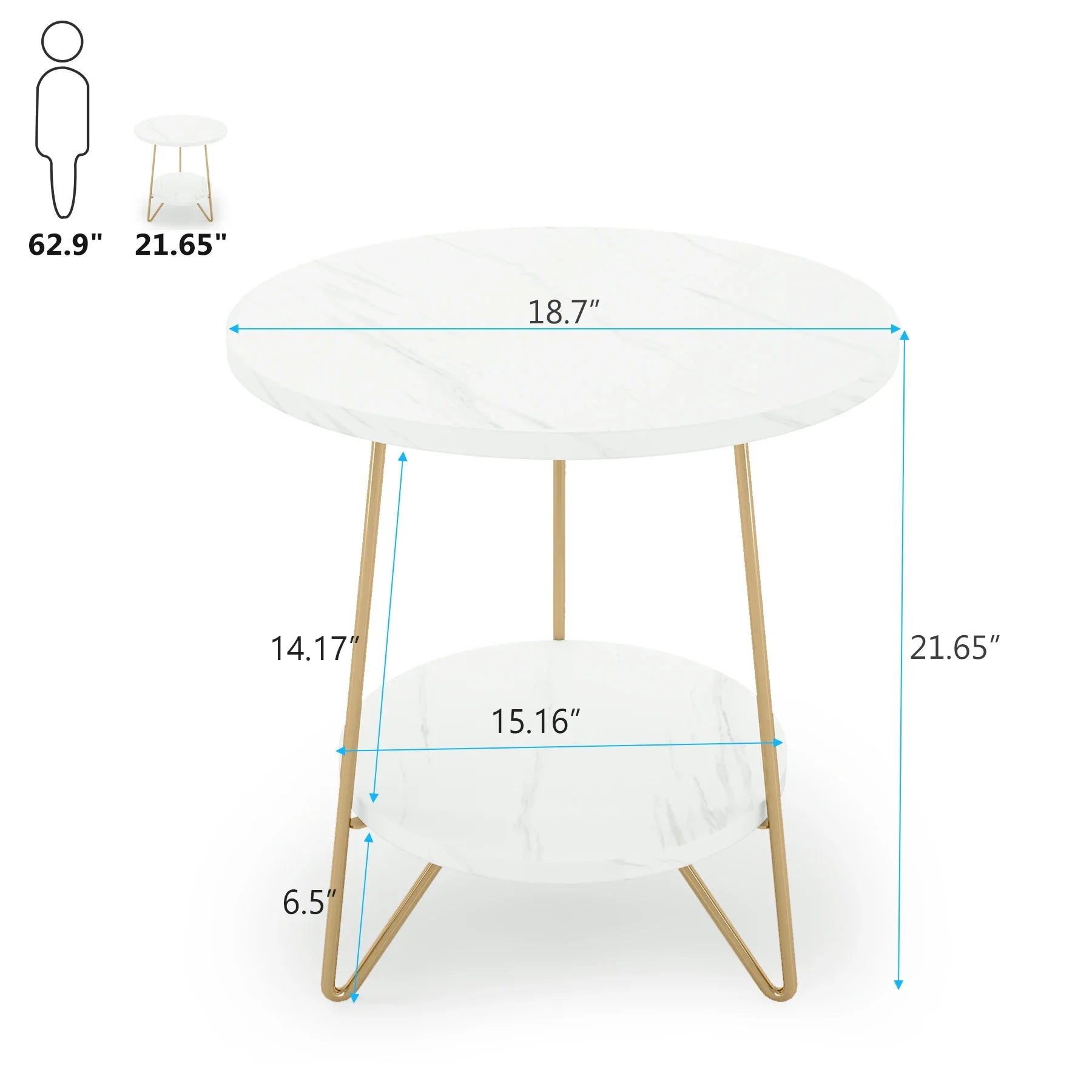MonoWood 2 Tier Faux Marble End Table Round Side Table with Shelves Small Coffee Accent Table for Living Room, White and Gold