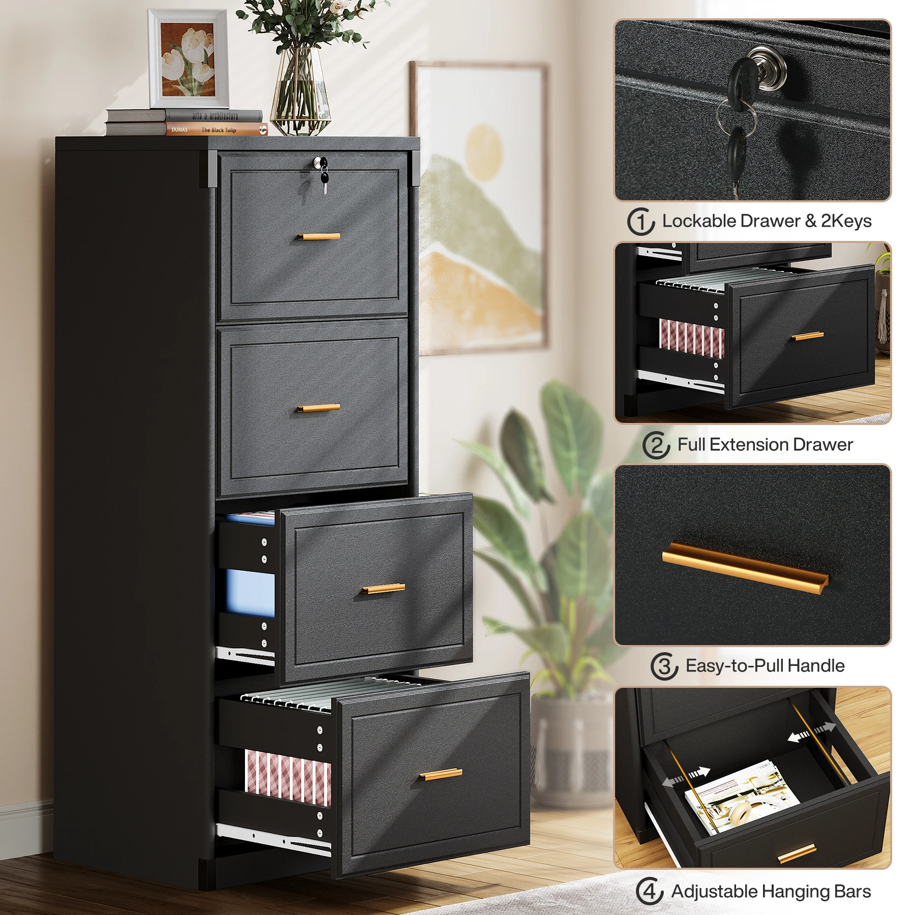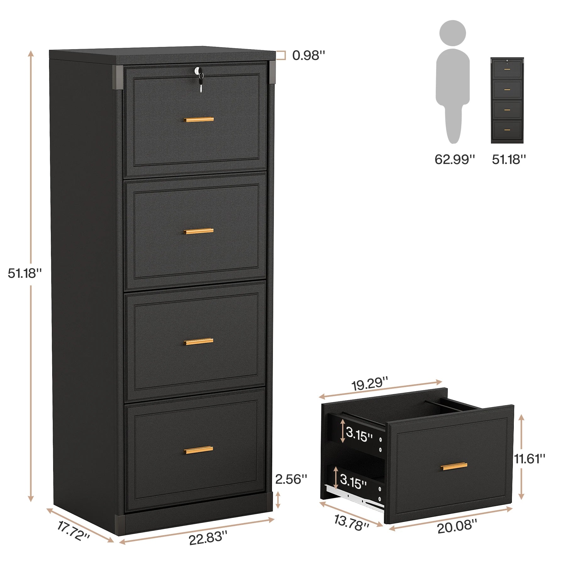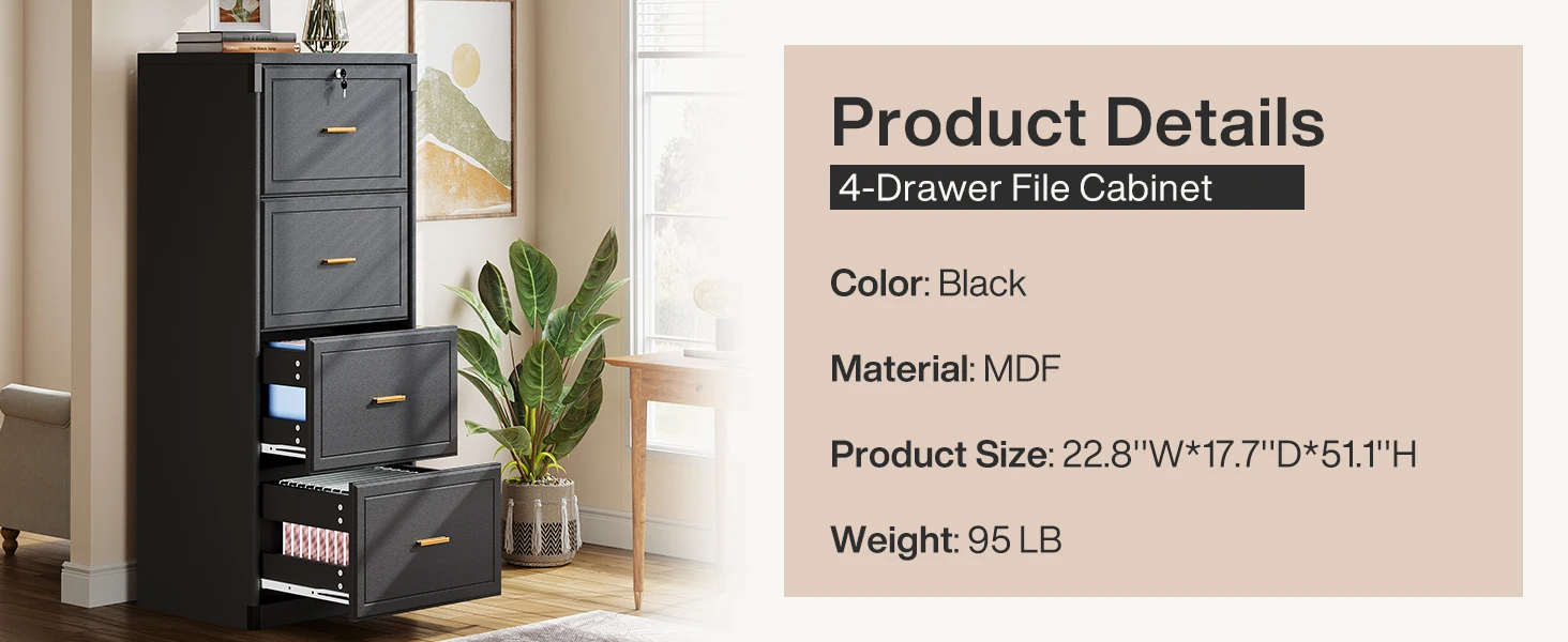 𝐋𝐚𝐫𝐠𝐞 𝐒𝐭𝐨𝐫𝐚𝐠𝐞 𝐒𝐩𝐚𝐜𝐞 𝐅𝐢𝐥𝐞 𝐂𝐚𝐛𝐢𝐧𝐞𝐭: Measuring 51.2'' H x 17.7'' W x 22.8'' L, it features a black linen finish and four drawers. Each drawer also comes with two adjustable hanging rails, making it perfect for storing letter/legal/A4/F4 size documents