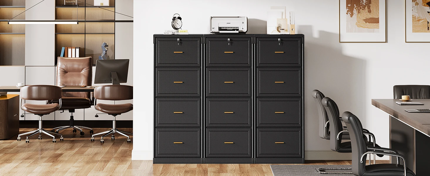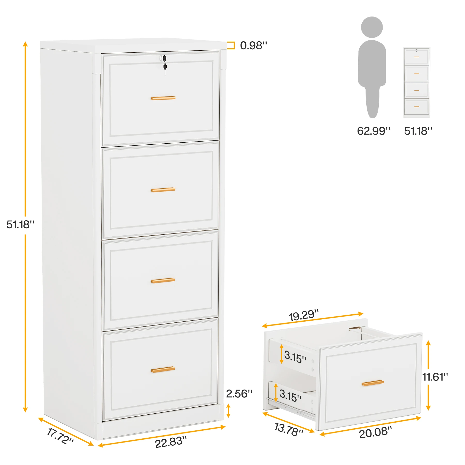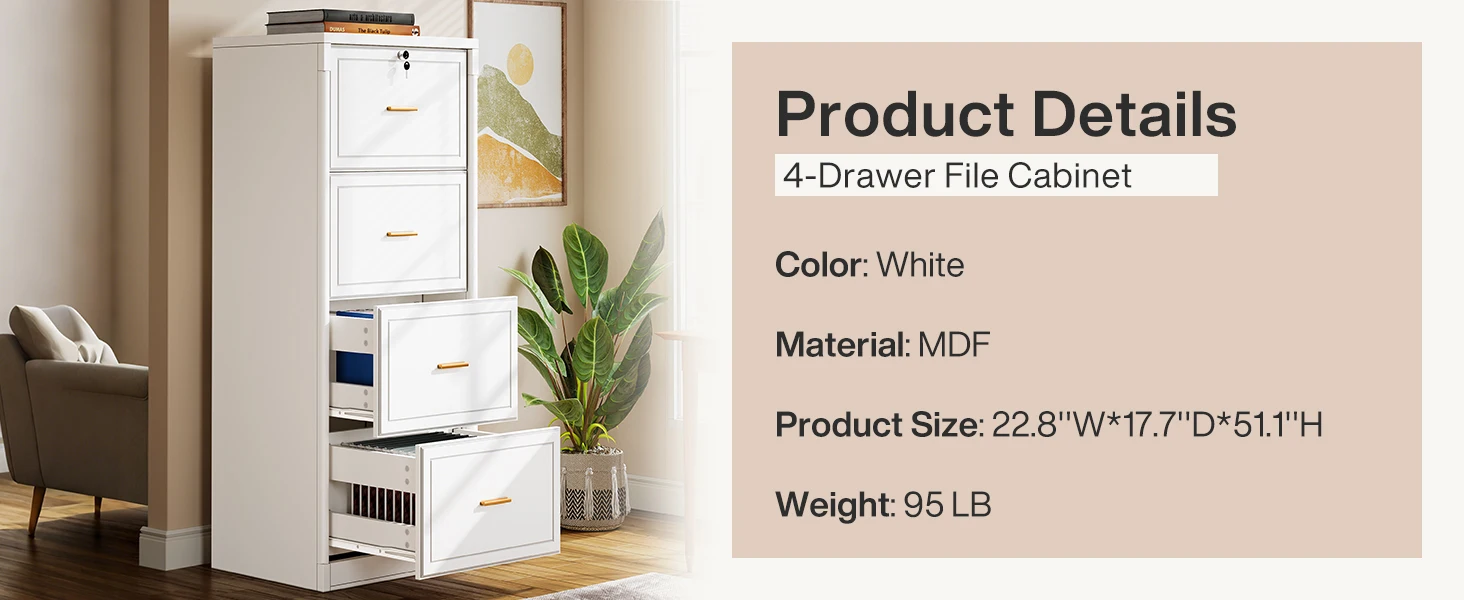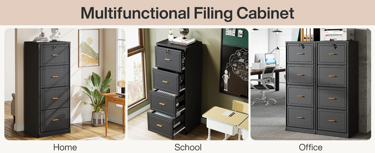 𝐋𝐚𝐫𝐠𝐞 𝐒𝐭𝐨𝐫𝐚𝐠𝐞 𝐒𝐩𝐚𝐜𝐞 𝐅𝐢𝐥𝐞 𝐂𝐚𝐛𝐢𝐧𝐞𝐭: Measuring 51.2'' H x 17.7'' W x 22.8'' L, it features a black linen finish and four drawers. Each drawer also comes with two adjustable hanging rails, making it perfect for storing letter/legal/A4/F4 size documents
