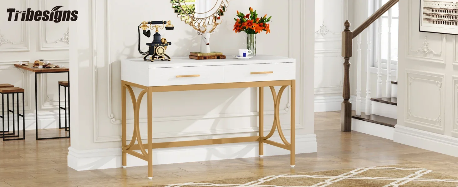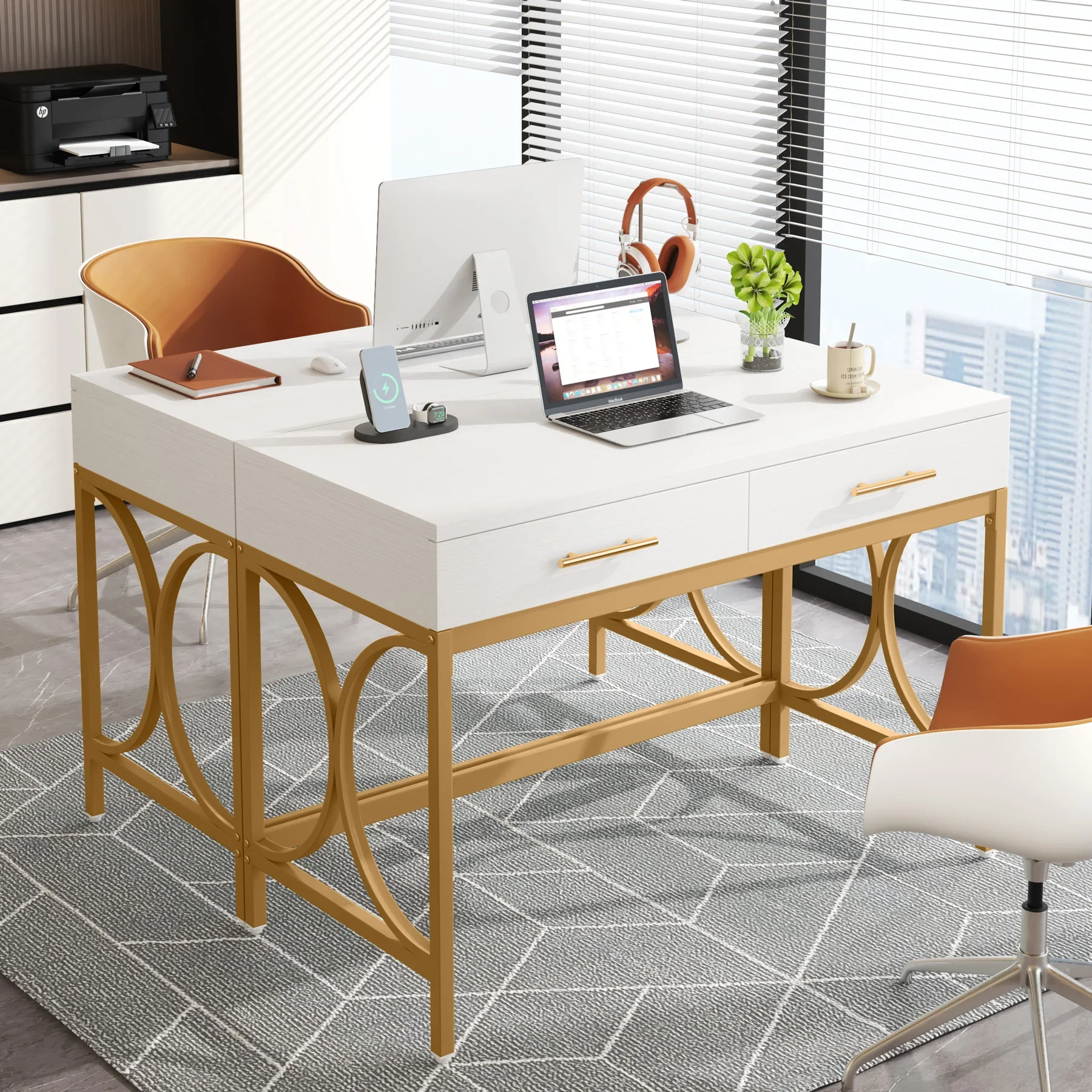 MonoWood 41" Gold Computer Desk with 2 Drawers, Writing Office Desk Modern Makeup Vanity Table Office Desk with Geometric Meta