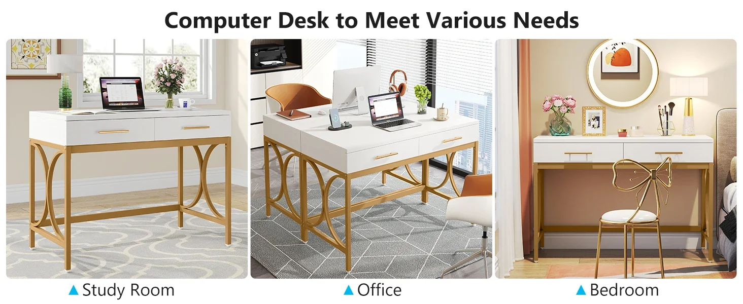 【Contemporary Elegance with a Chic Twist】: With its expansive 41.33’’ W x 19.68’’ D desktop, this office desk is designed to meet all your needs. The sleek white tabletop, complemented by the glamorous gold X-shaped table frames, emanates an air of opulence that effortlessly elevates any home or office decor, seamlessly blending with various furniture styles.