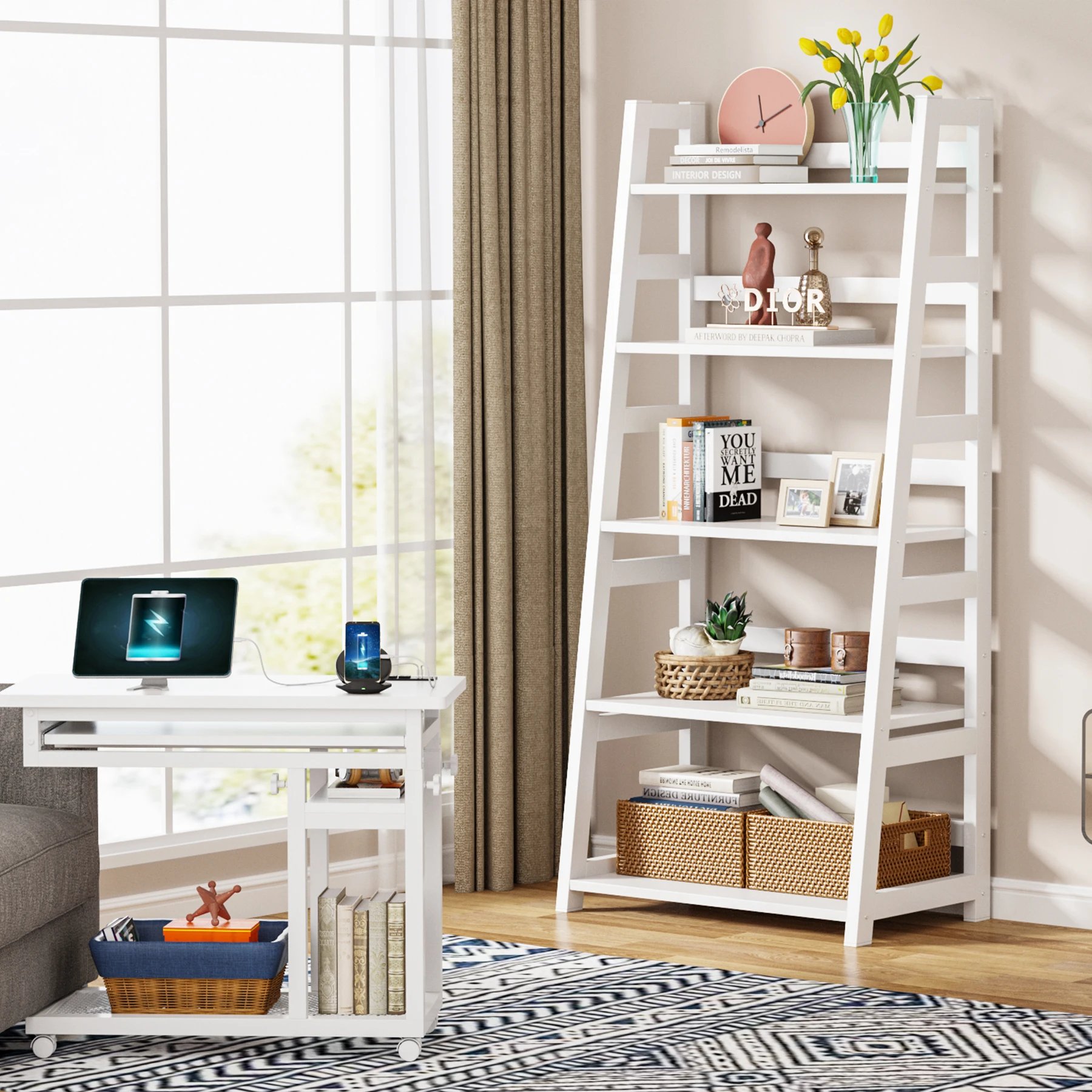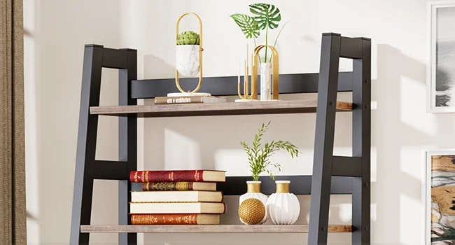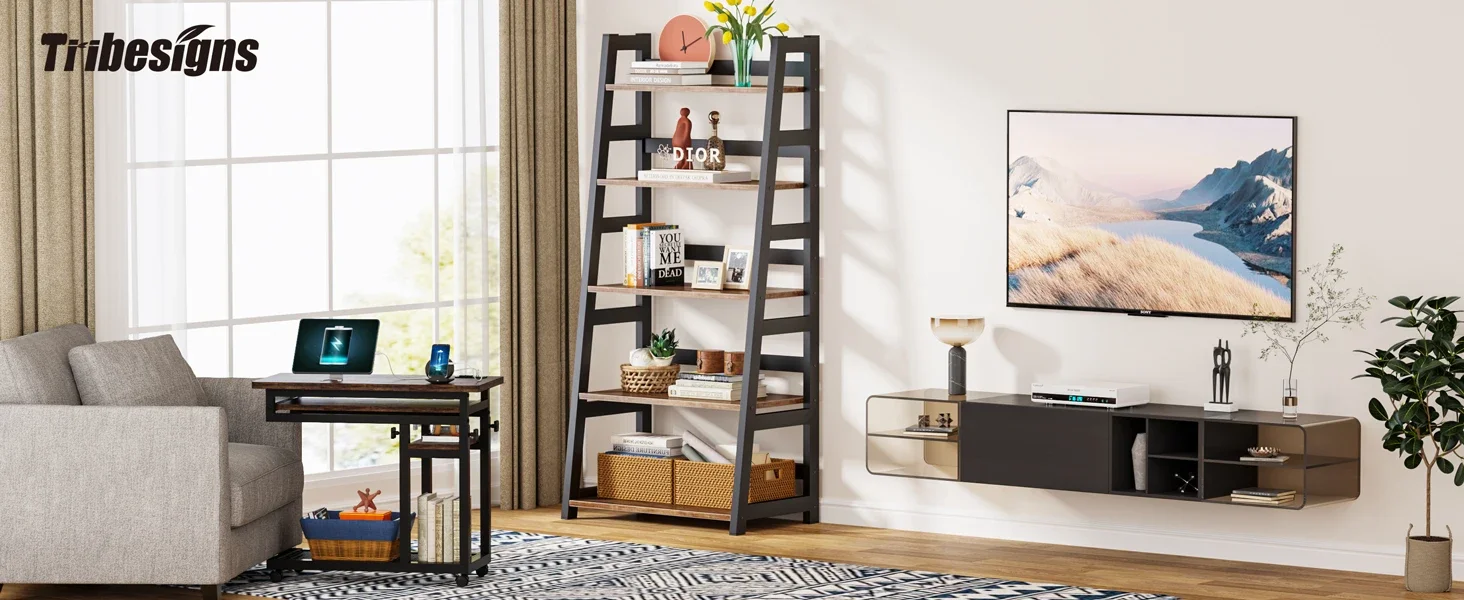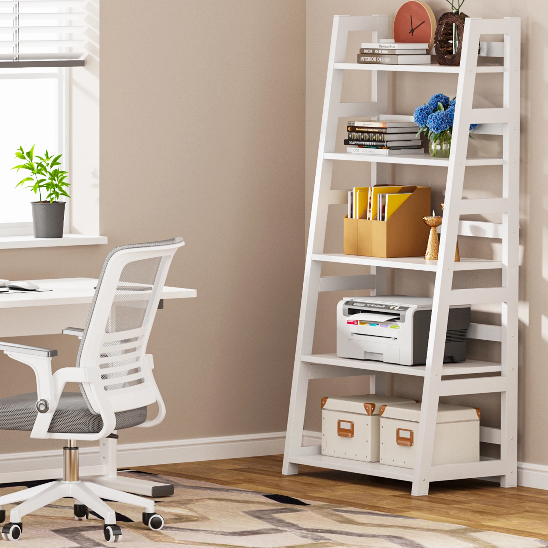 ✔ 【5-Tier Large Storage Capacity】 : Overall size: 23.6”L x 15.7”W x 56.5”H. The ladder storage shelf provides ample storage space for your books, knickknack, family photos, ornaments and more. Bottom shelf is 11inch in high which allows you to put baskets on it