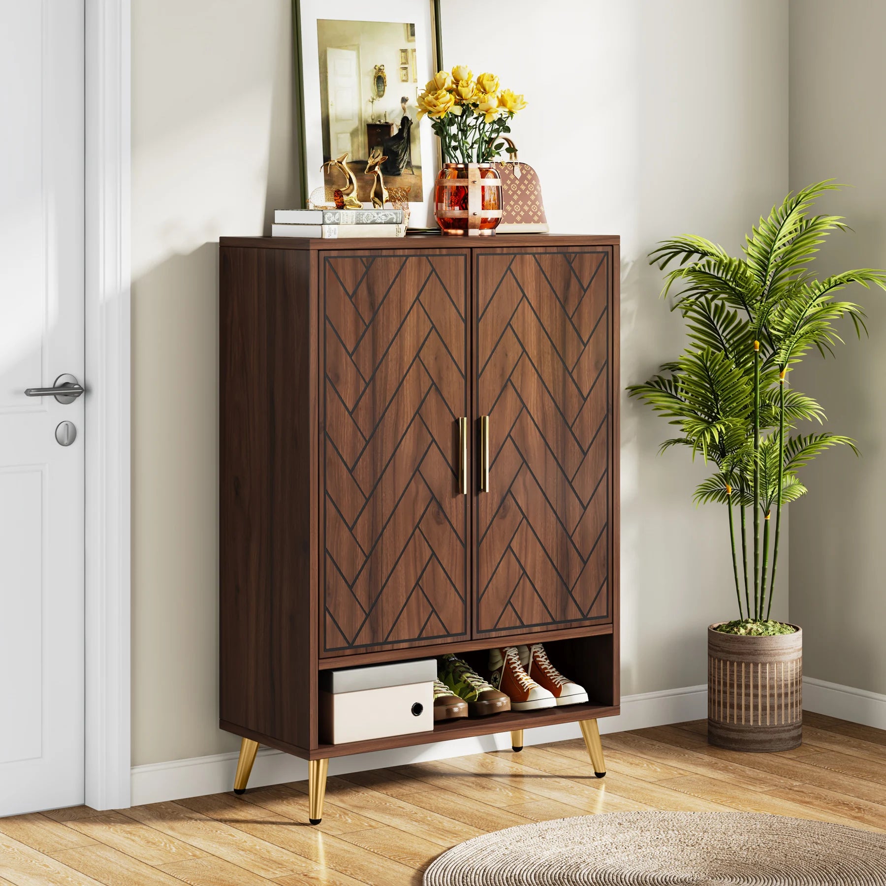 Elegant Design with Gold Legs: The shoe cabinet doesn't just provide practical storage – it also adds an aesthetic touch to your decor. Its sleek walnut finish is a charm, and the golden legs add a glamorous appeal.