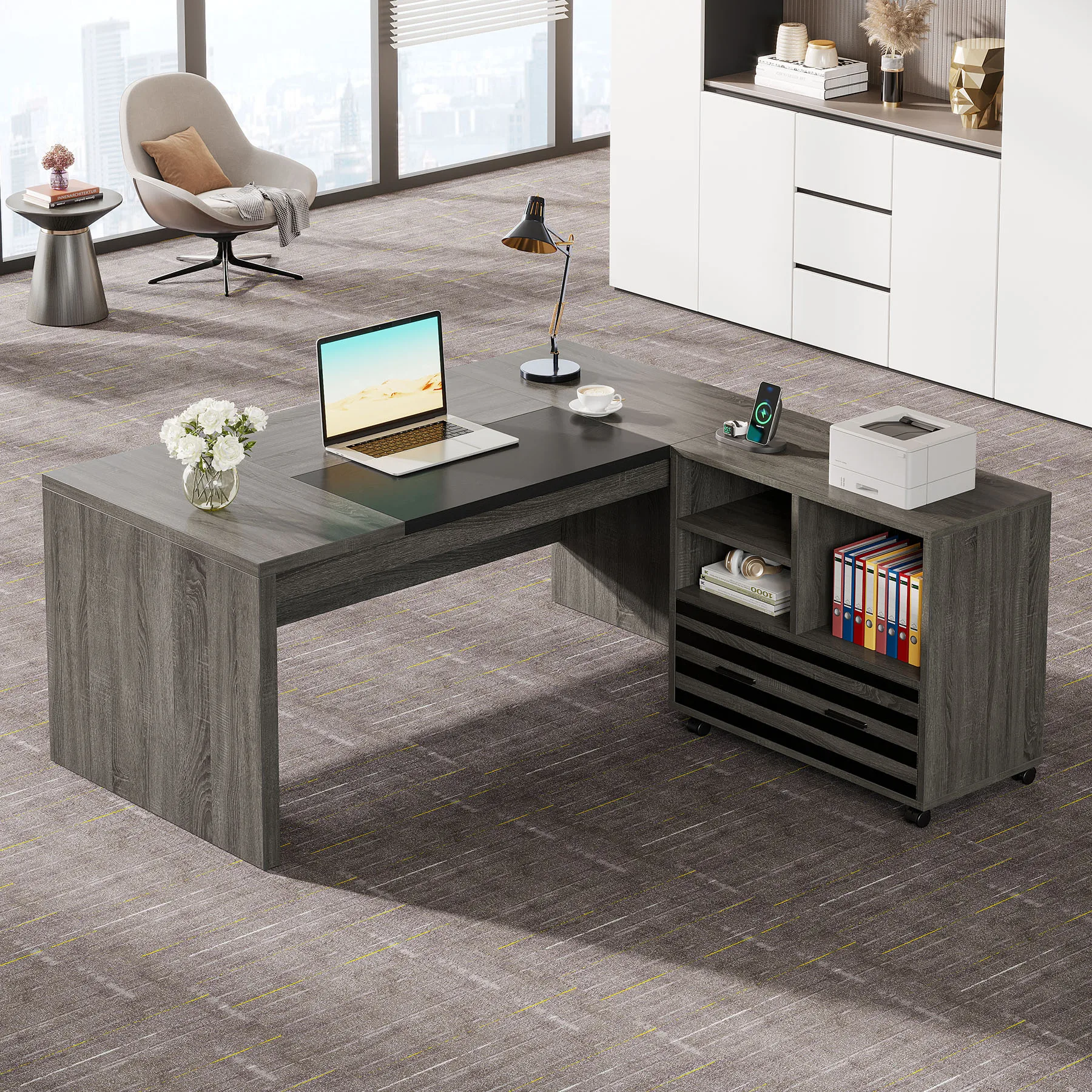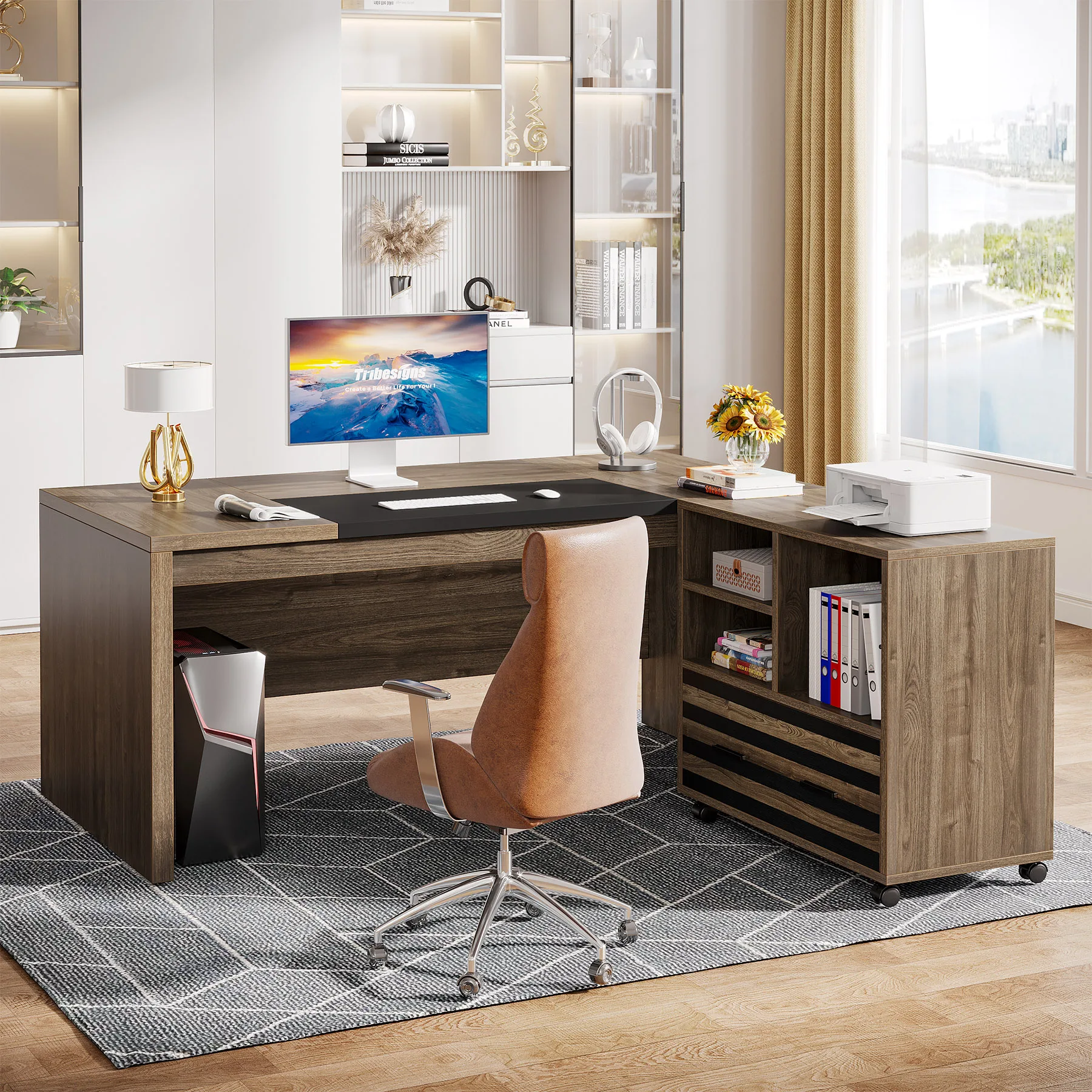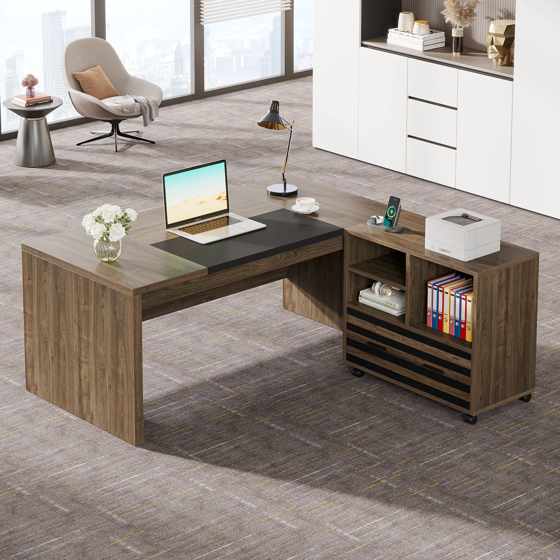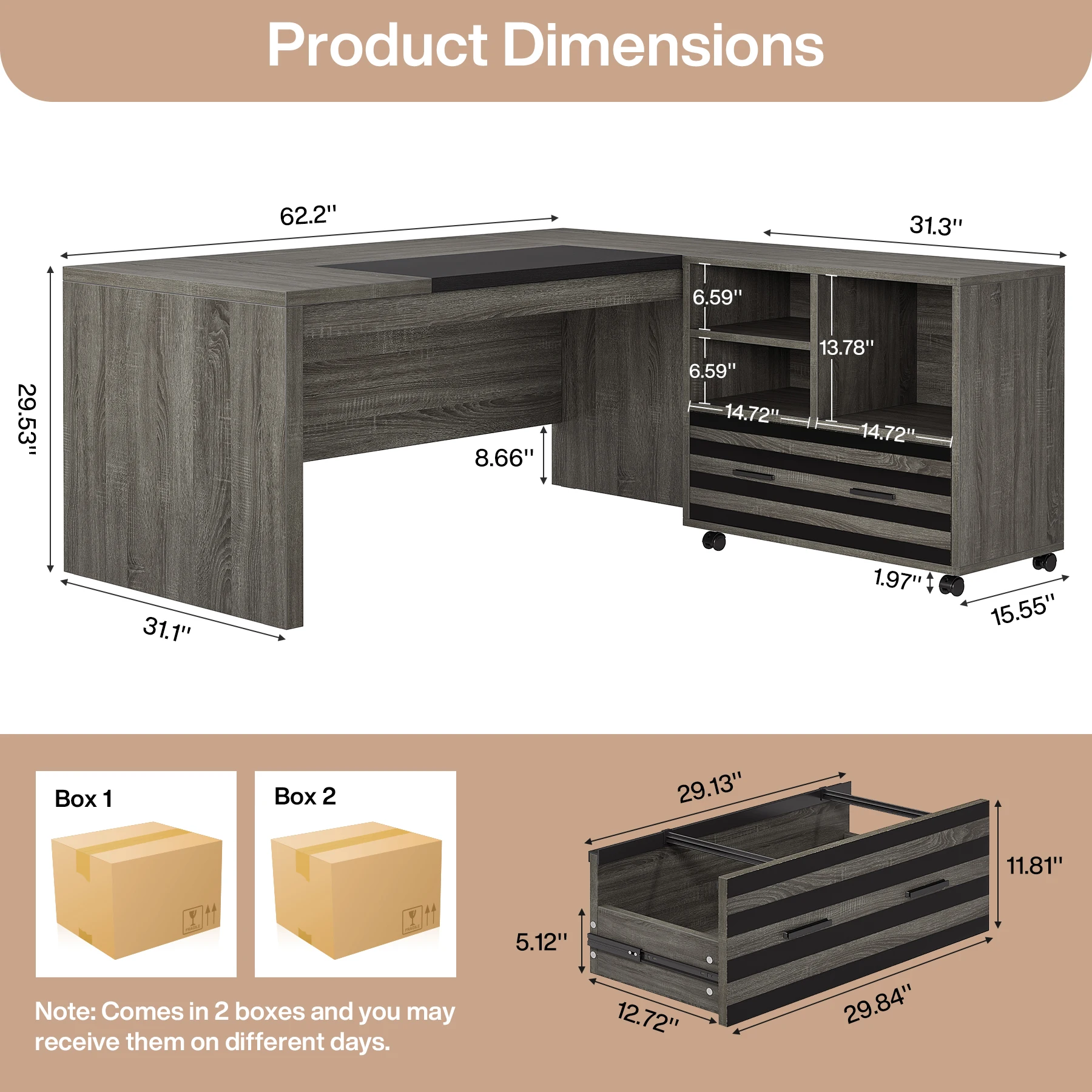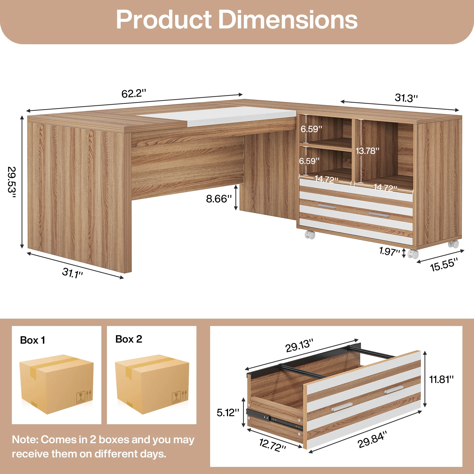 MonoWood 62.2" Executive Desk with Mobile File Cabinet, L-Shaped Office Desk with Storage Shelves, Large Computer Desk