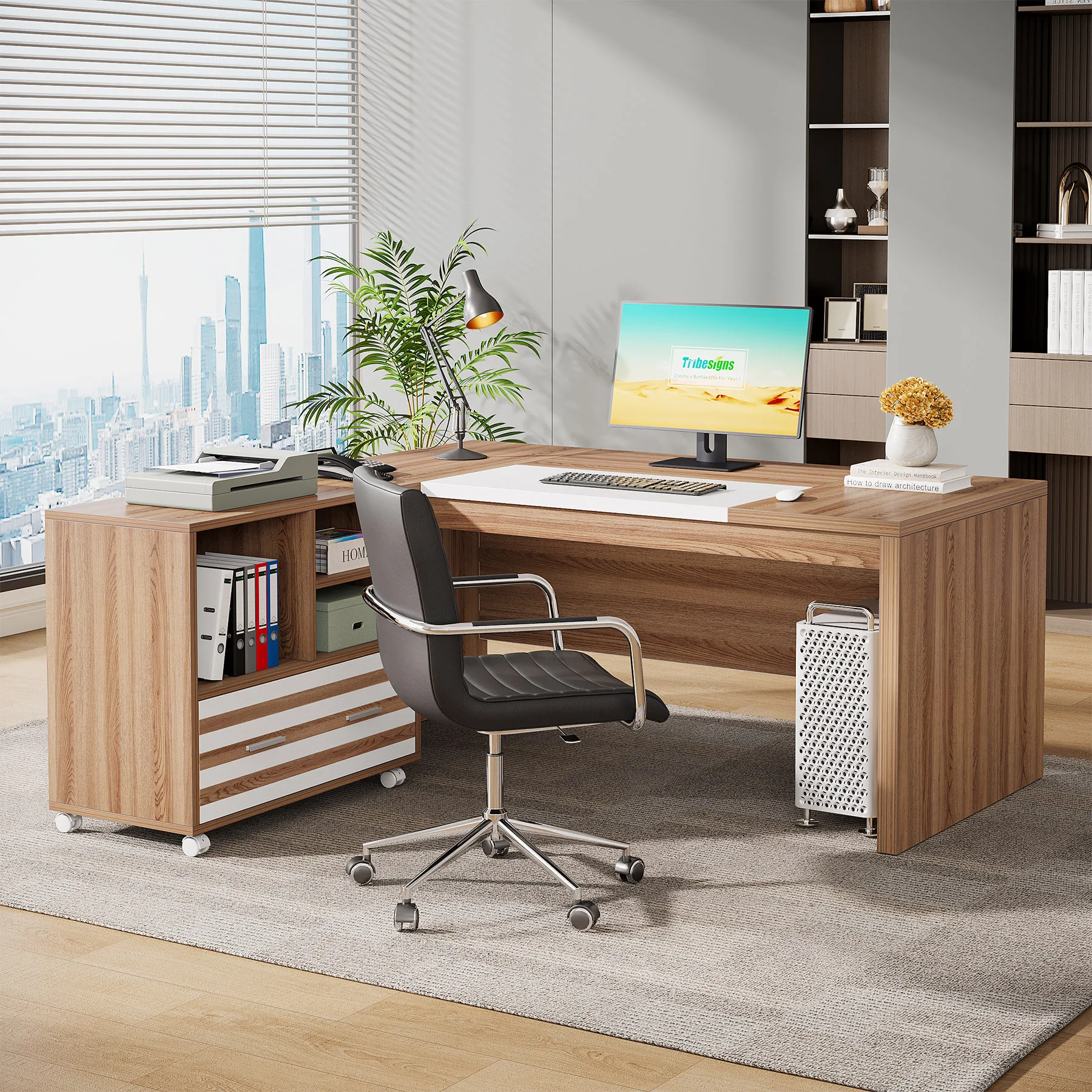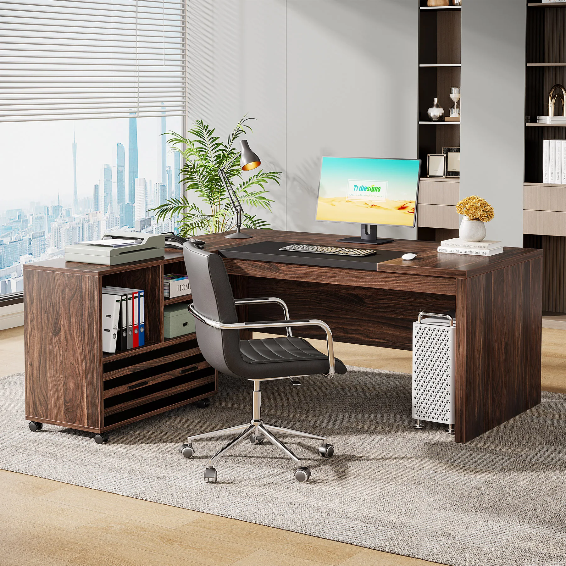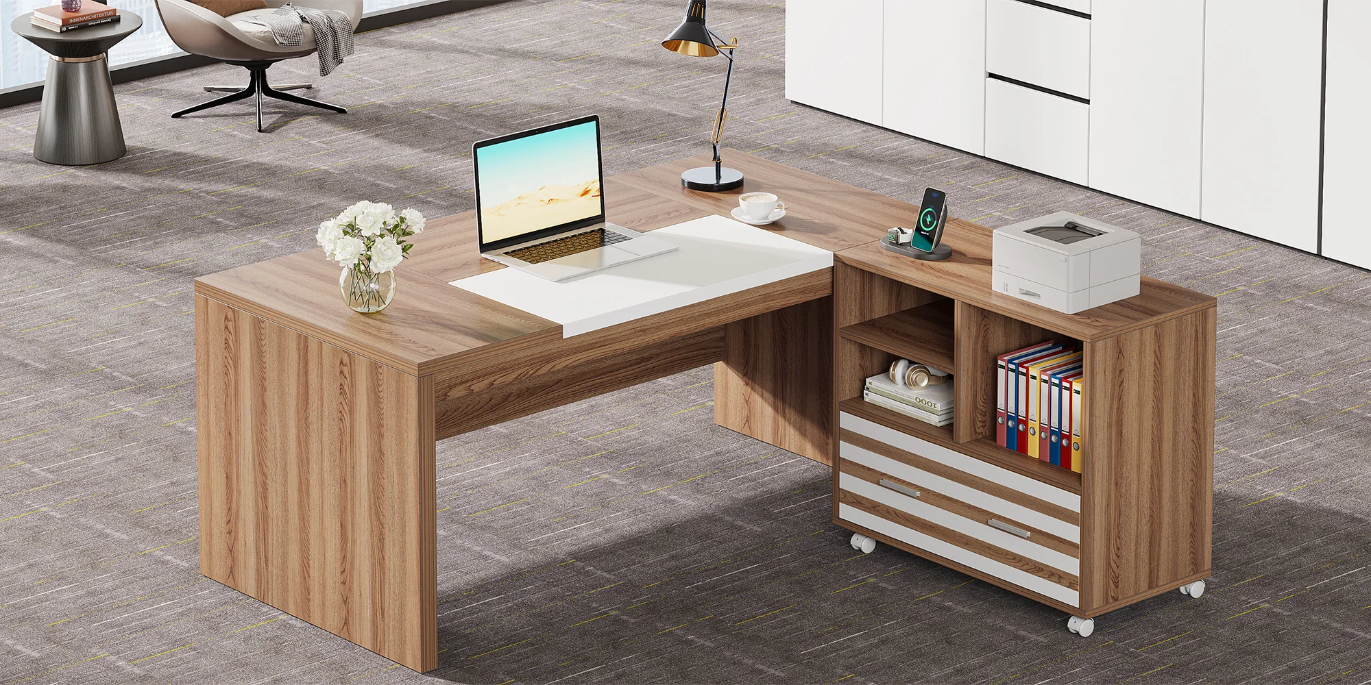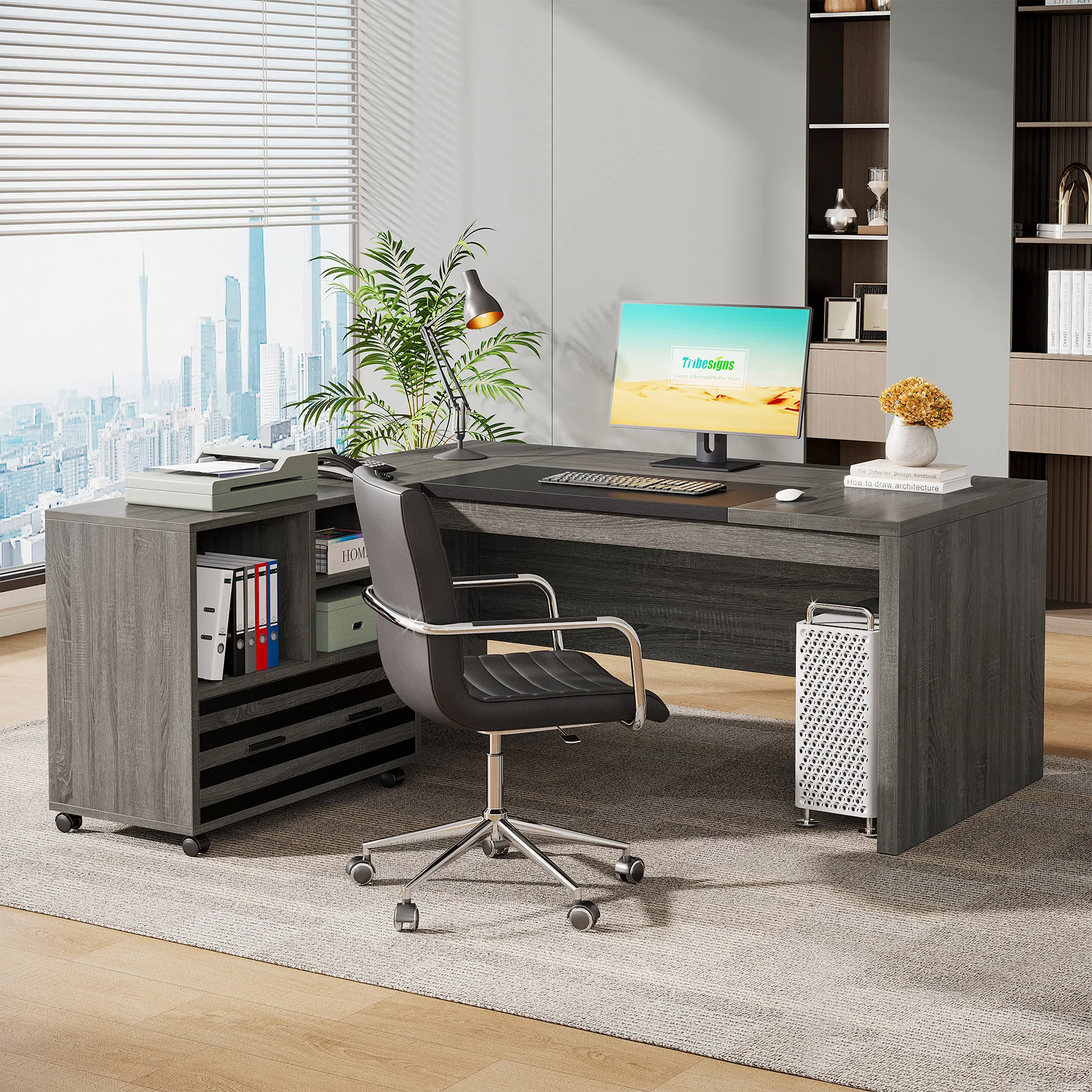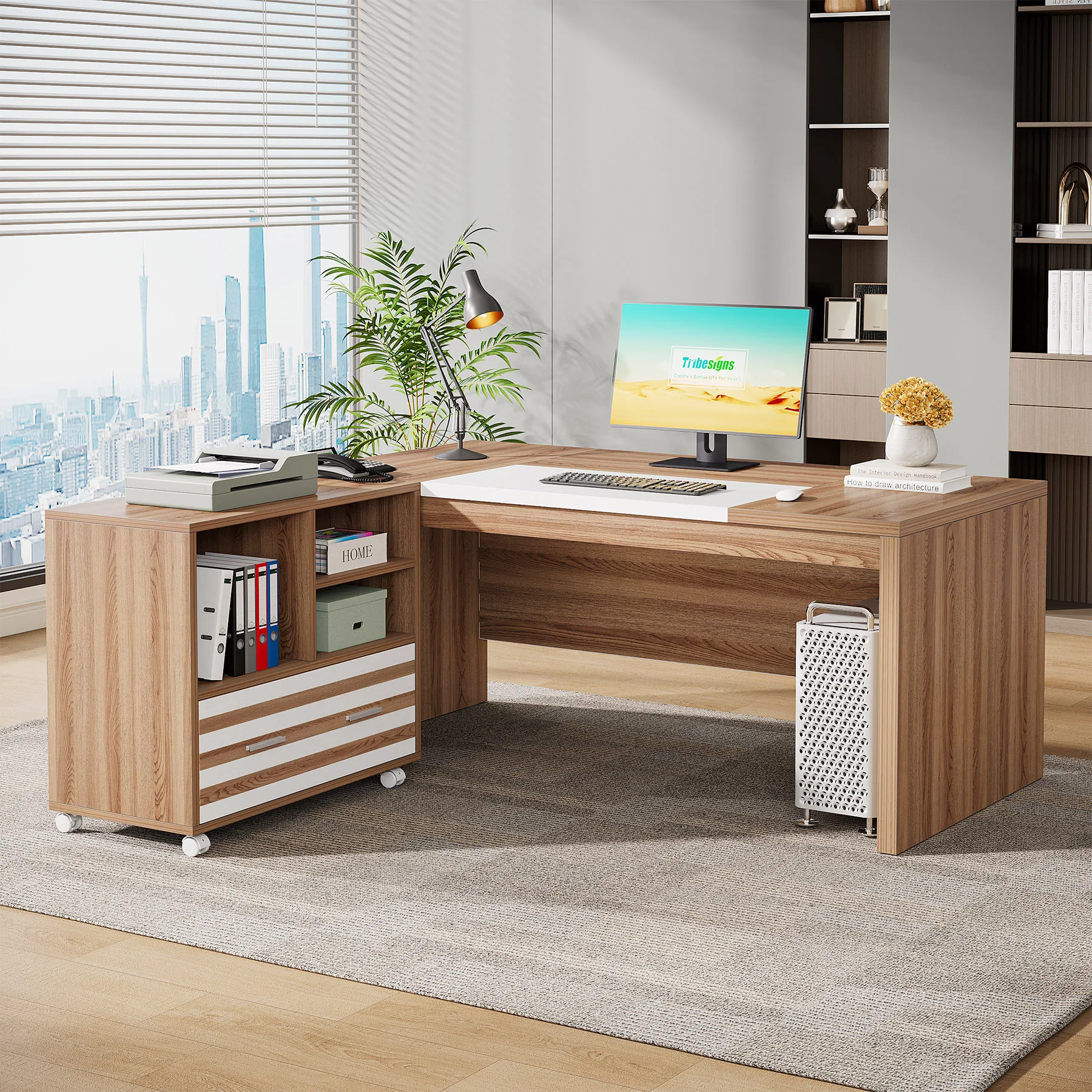 MonoWood 62.2" Executive Desk with Mobile File Cabinet, L-Shaped Office Desk with Storage Shelves, Large Computer Desk