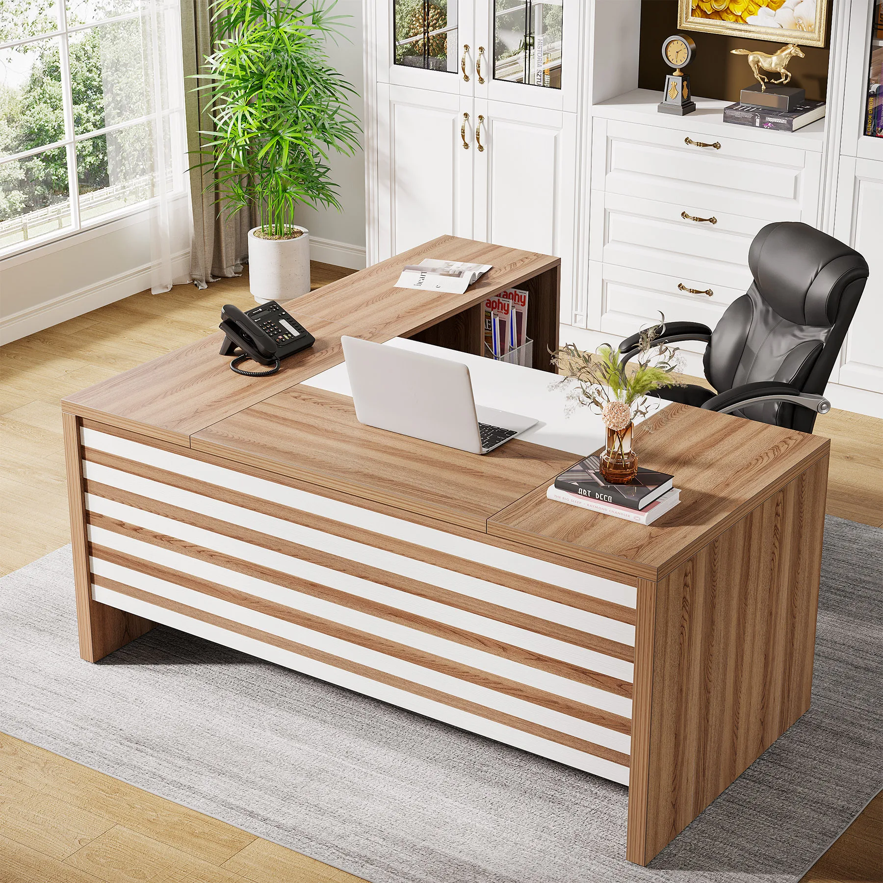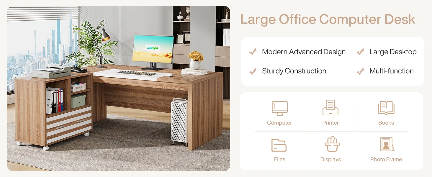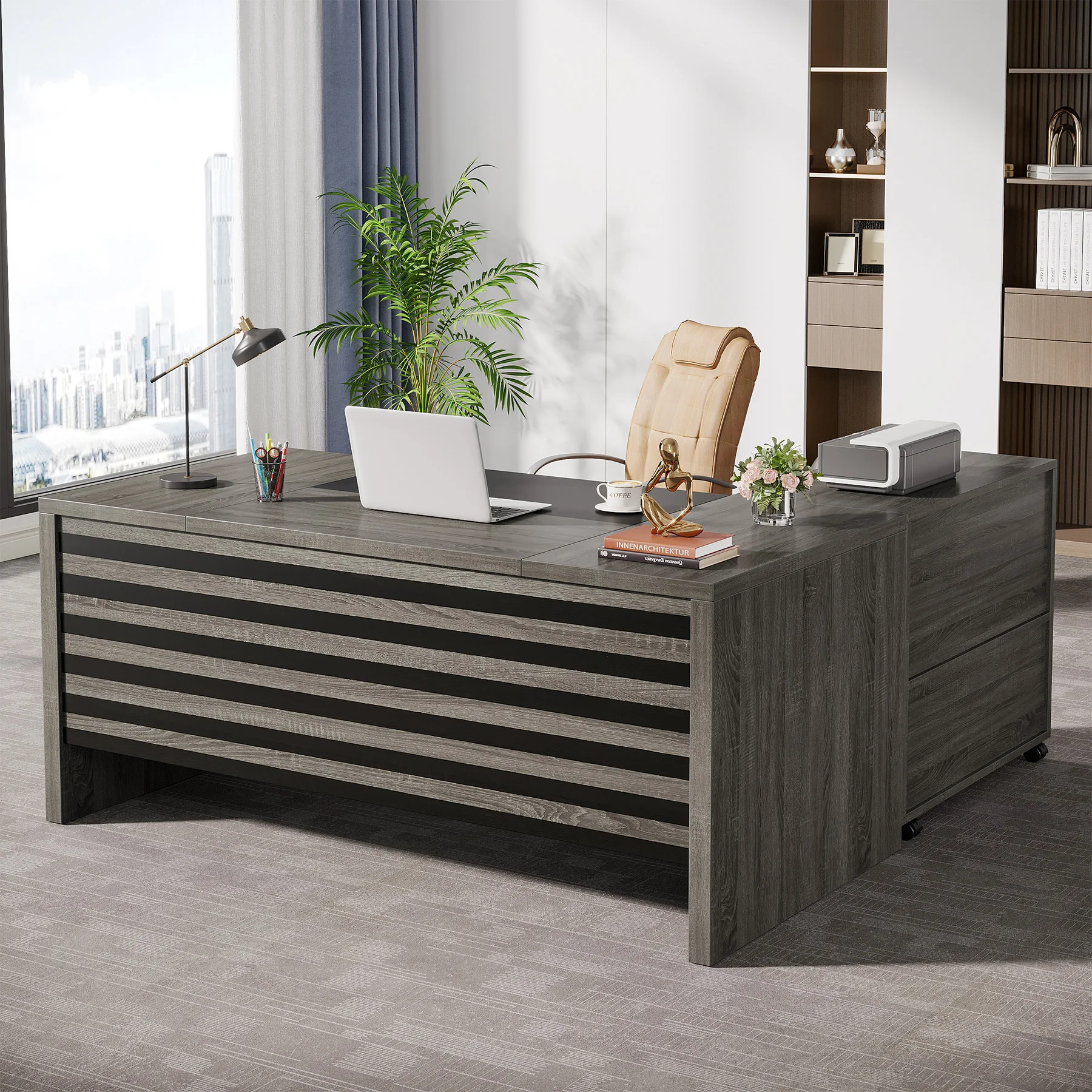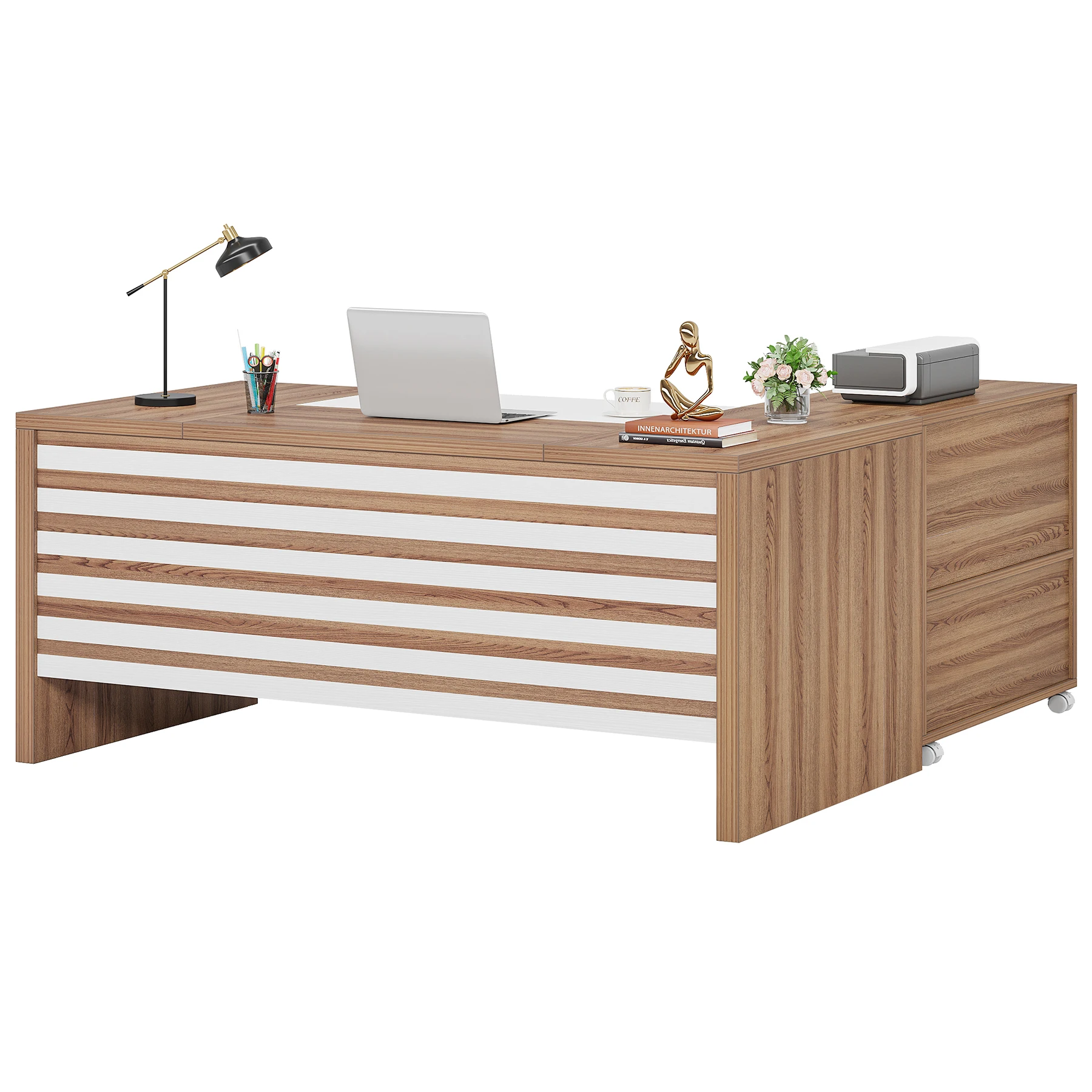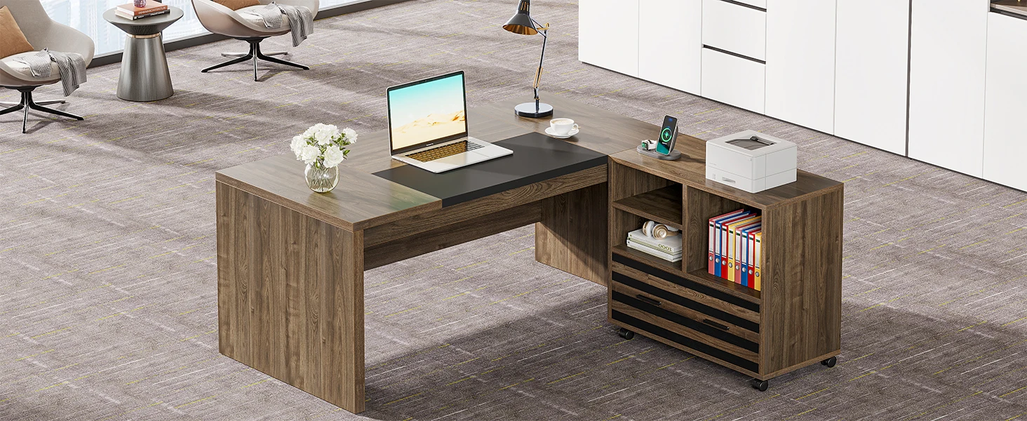 MonoWood 62.2" Executive Desk with Mobile File Cabinet, L-Shaped Office Desk with Storage Shelves, Large Computer Desk
