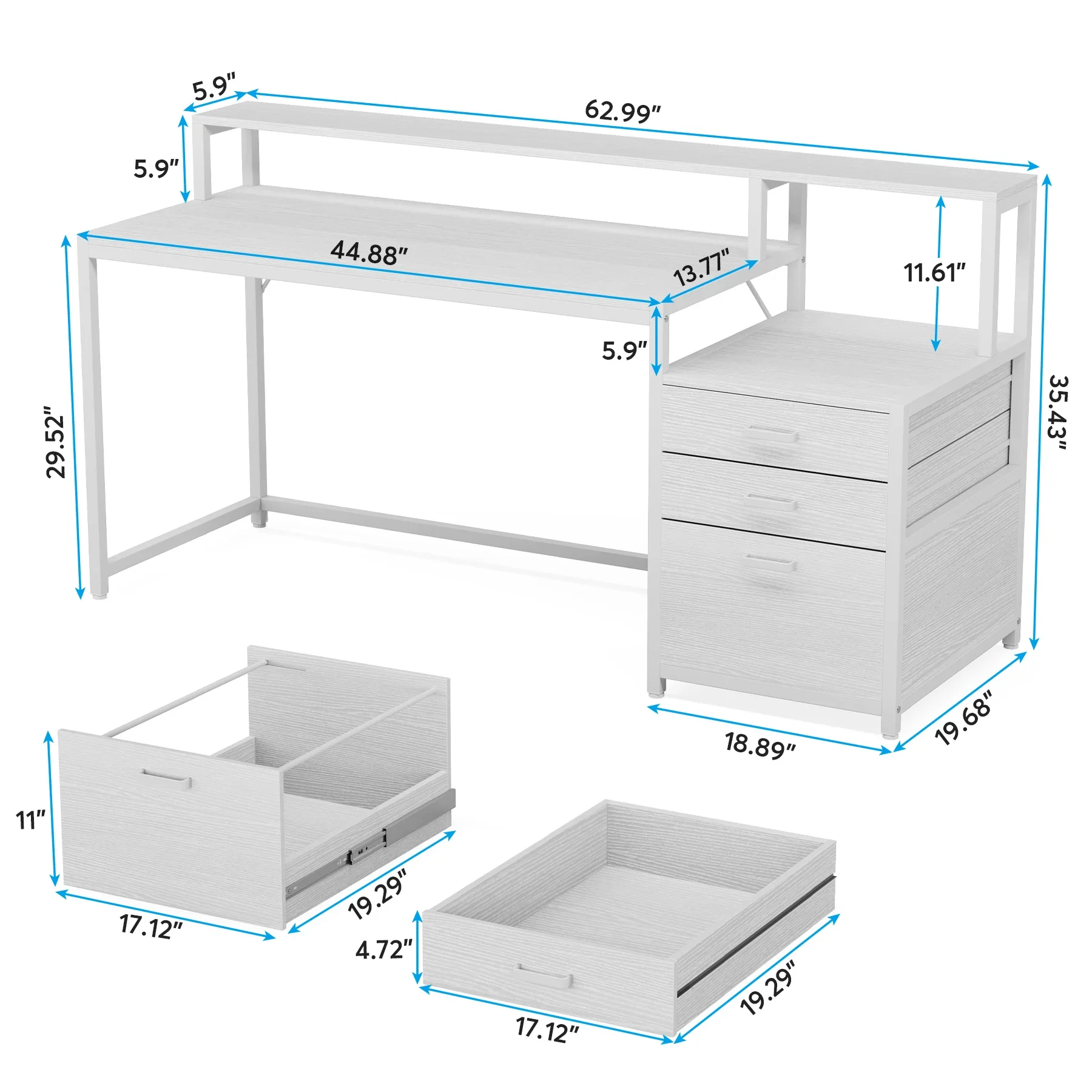 [TWO-TIER TABLETOPS]: Featuring with 63’’ long monitor riser and 45’’W X 19.7’’D desktop, this desk with drawers provides ample space for several monitors, laptops or other must-have office essentials, giving you spacious and free workstation space for your office activities, like working,studying, gaming, and etc.