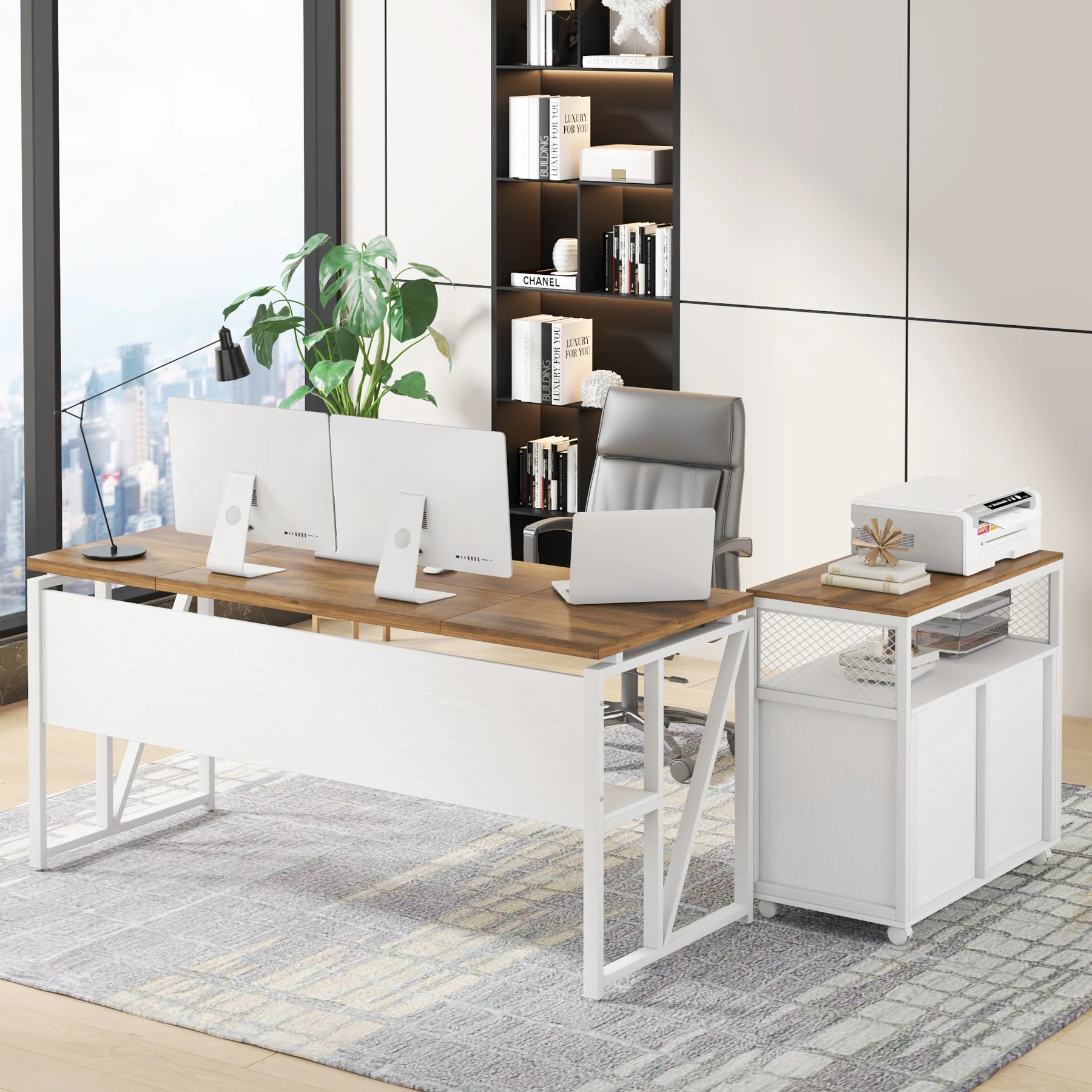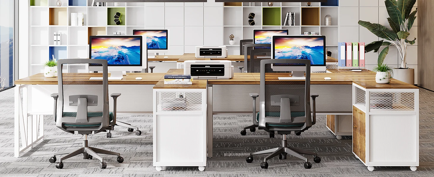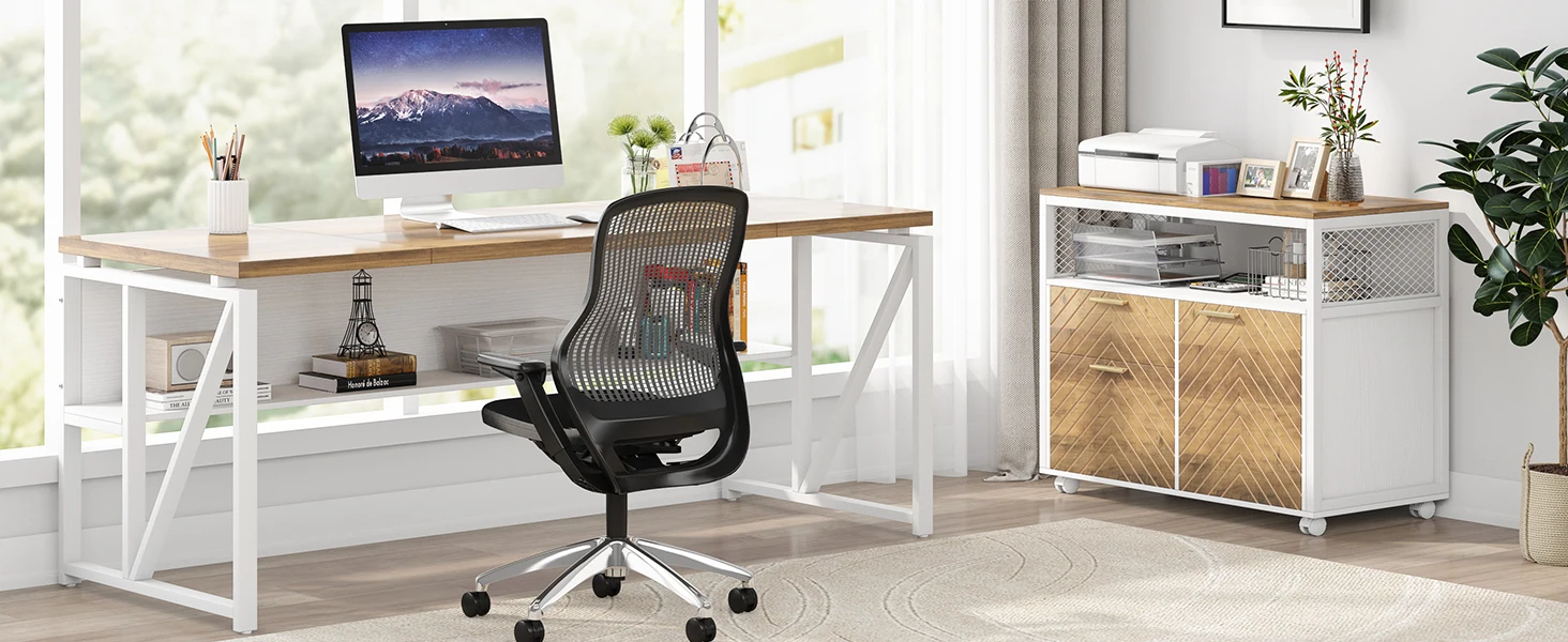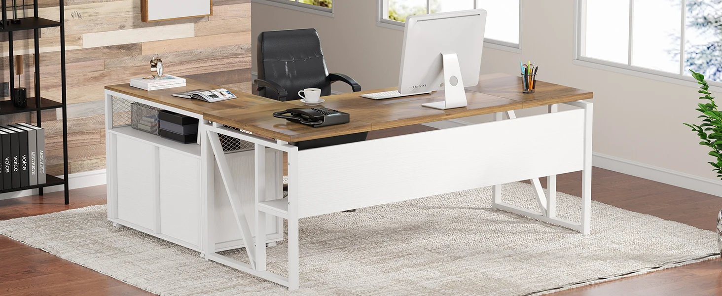 【Sturdy & Beautiful finish】:The office desk constructed of heavy-duty metal frame and thickened compressed board (1.2 inch) ensure durability and stability. The furniture set is a combination of vintage colors and black match any decor style.