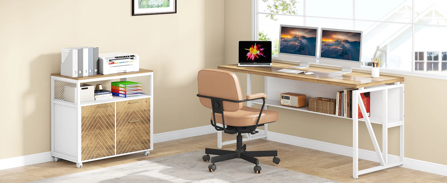 【Large 63-inch computer table】The large63" X 31" x 30”(L *W*H) desk top big enough for your laptop, second monitor, a lamp, and some writing space to spread out and get work done. A wide Storage shelf under the desktop, provide extra space for your books or office stuff