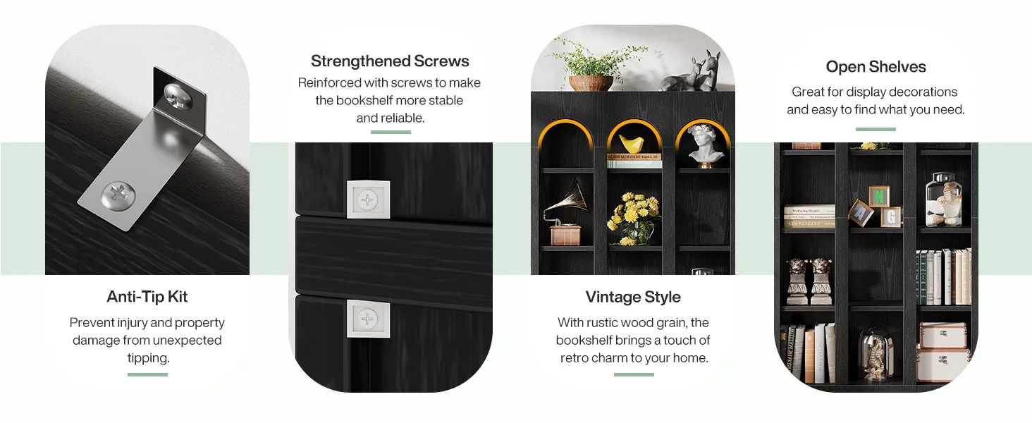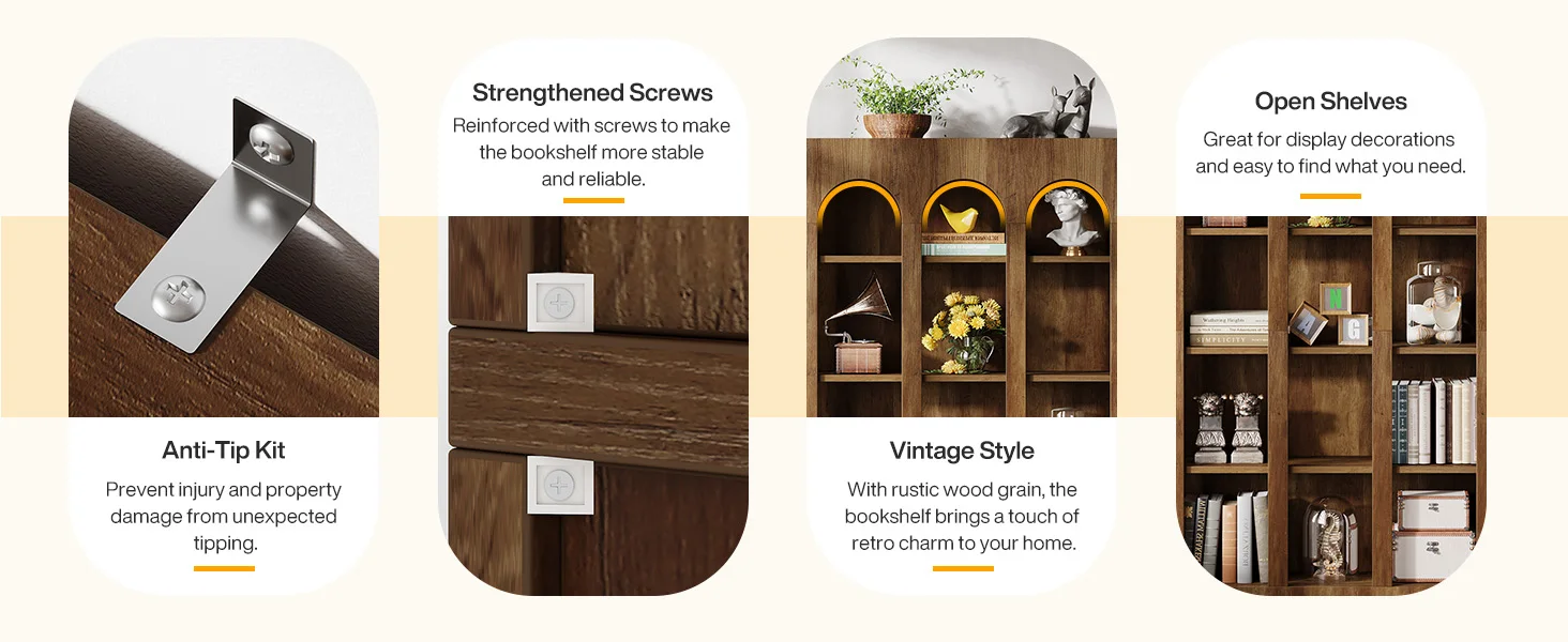 Stability & Safety: Made from high-quality MDF with reinforced support, this retro bookshelf ensures long-lasting durability. The solid base and included anti-tip kit provide added safety for households with kids and pets