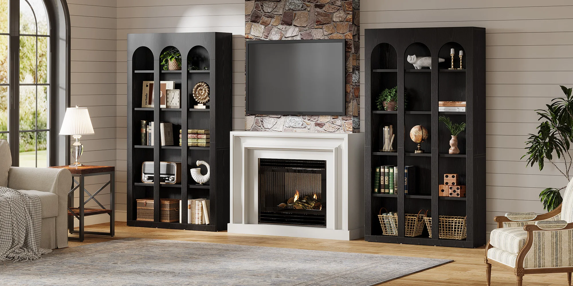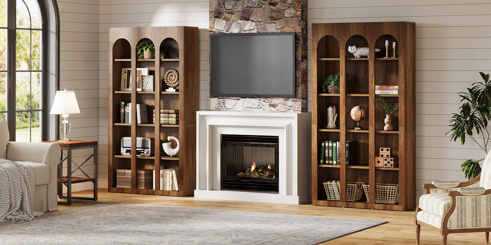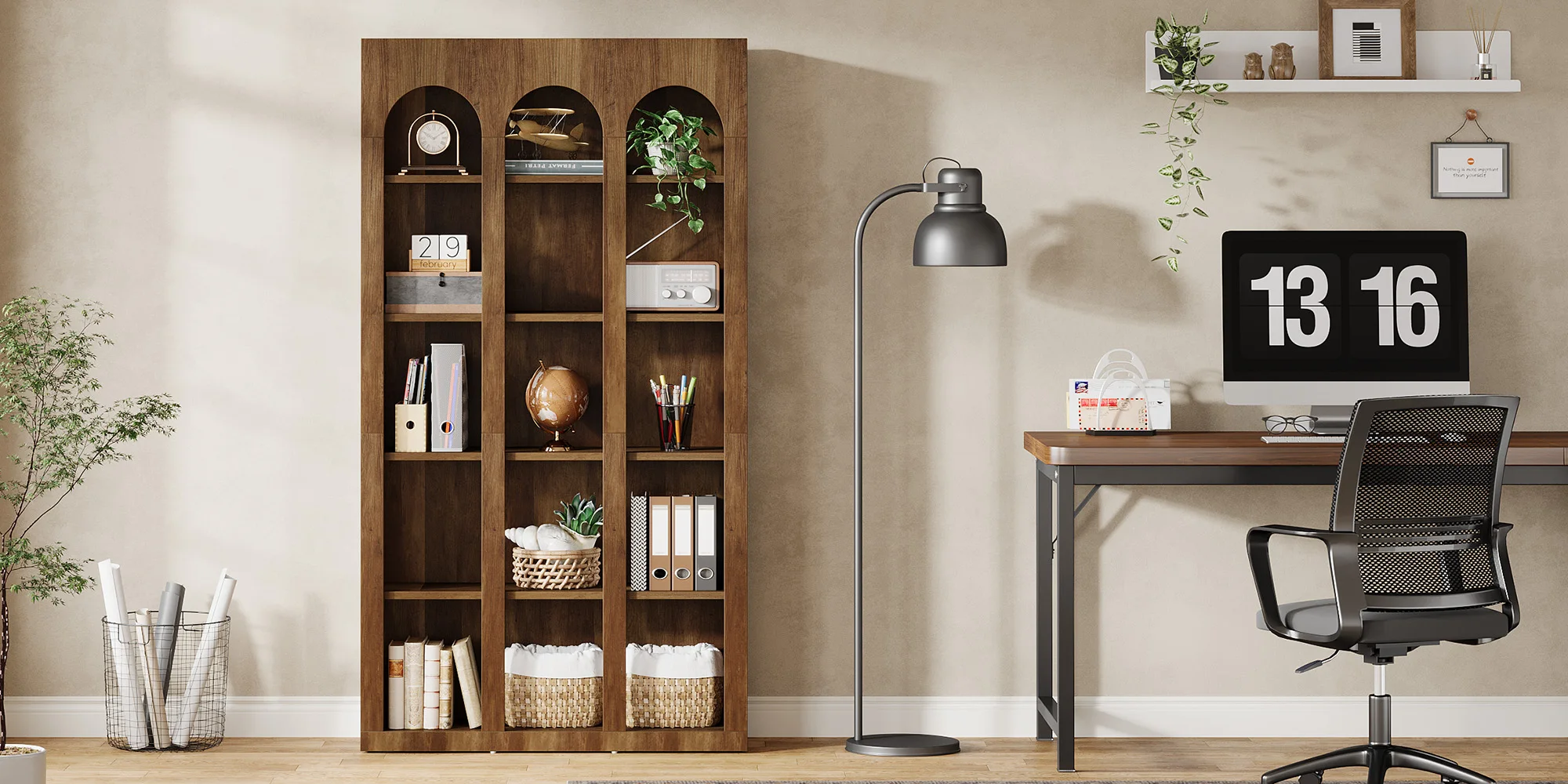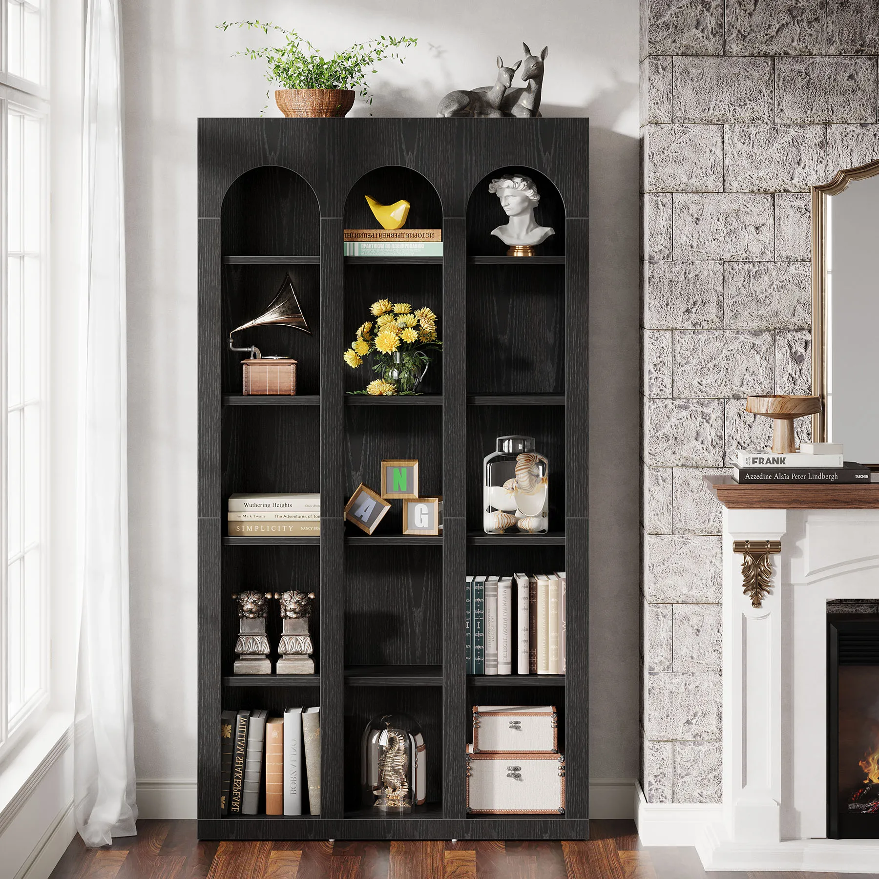 Vintage Charm: This beautifully arched bookcase features rich wood finishes and an authentic farmhouse style. The curved silhouette softens the angular lines of modern interiors, creating a harmonious balance and adding vintage character to any room