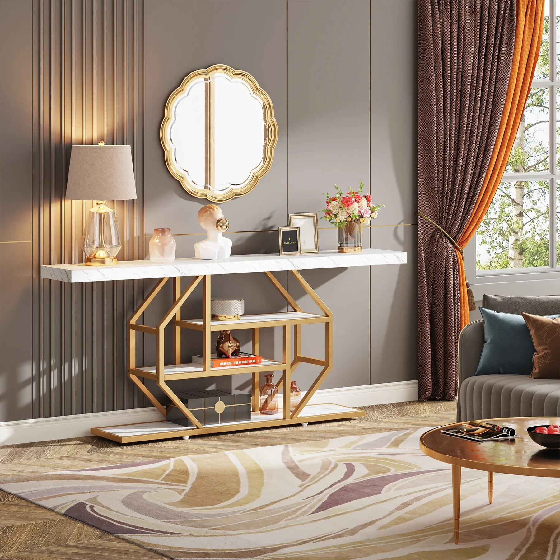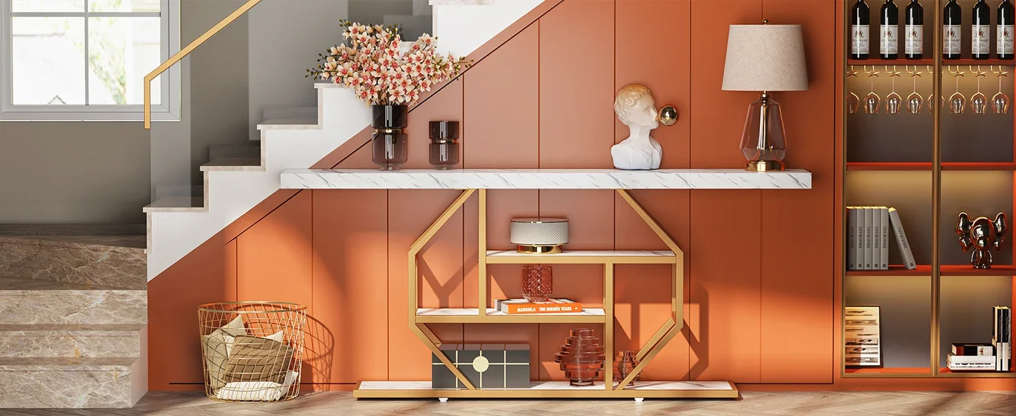 【Time for a New Console】Looking for a wonderful sofa table? Offer gorgeous style and storage all wrapped up in one with our gold console table. Defined by a faux marble veneer top with realistic-textured while sitting on an openwork frame base, this modern entryway table will set the tone in your home. Welcome the console into your home today!