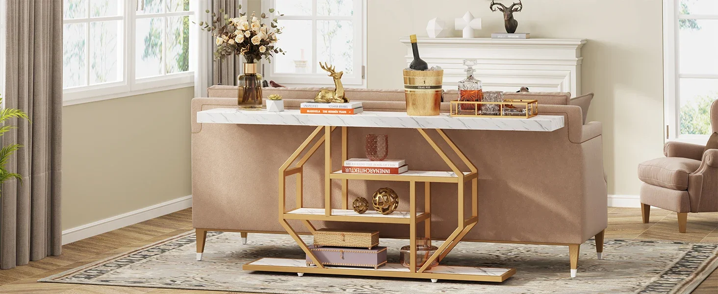 【 Set Up A Proudly Display】Our gold sofa table with a 70.9" extra-long tabletop welcomes any guest with beautiful flowers, your favorite photos, and other trinkets. And three staggered lower shelves perfectly show everything from decorative items and knick-knacks to books or fabric bins. Go ahead and fill it up with decor—it has you covered!