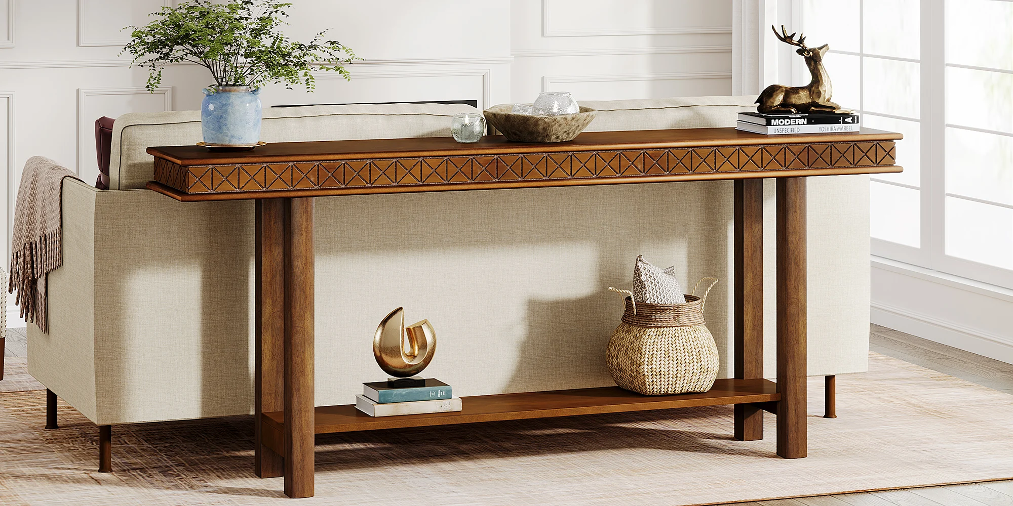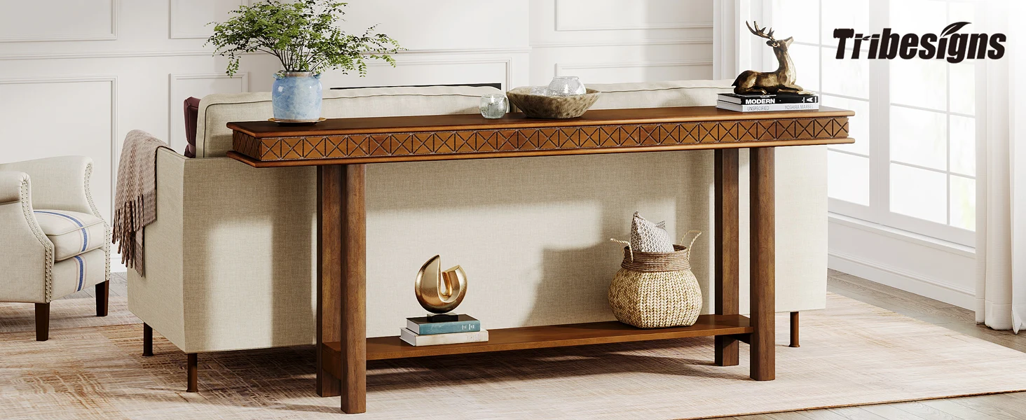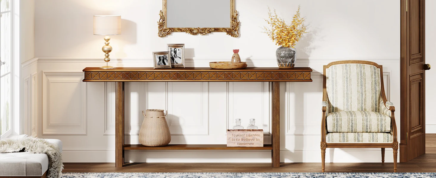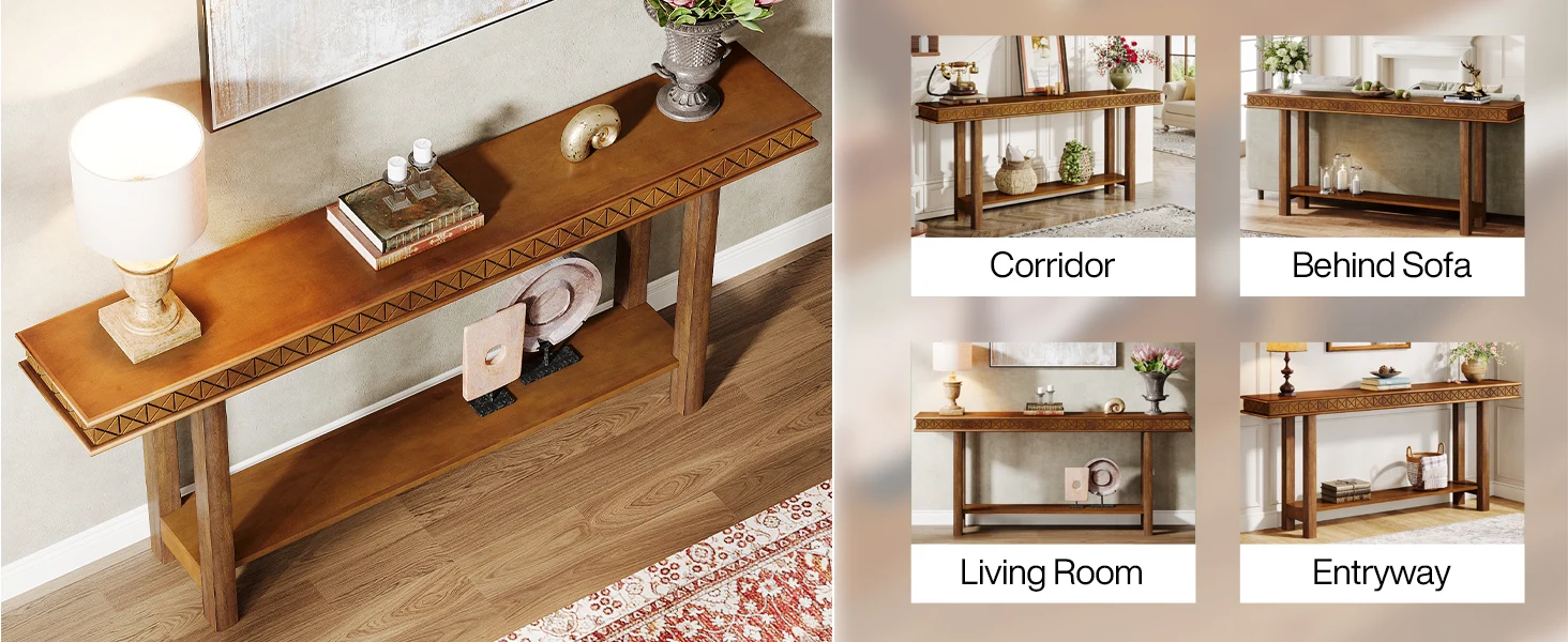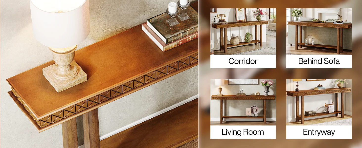 【CHARMING CONSOLE TABLE】 Warm wood tones combined with decorative edge designs naturally deliver this long sofa table’s minimalist aesthetics, bringing comfort and style to your home. Time to say goodbye to the small and messy one and bring a new entryway appearance with this extra-long console table.