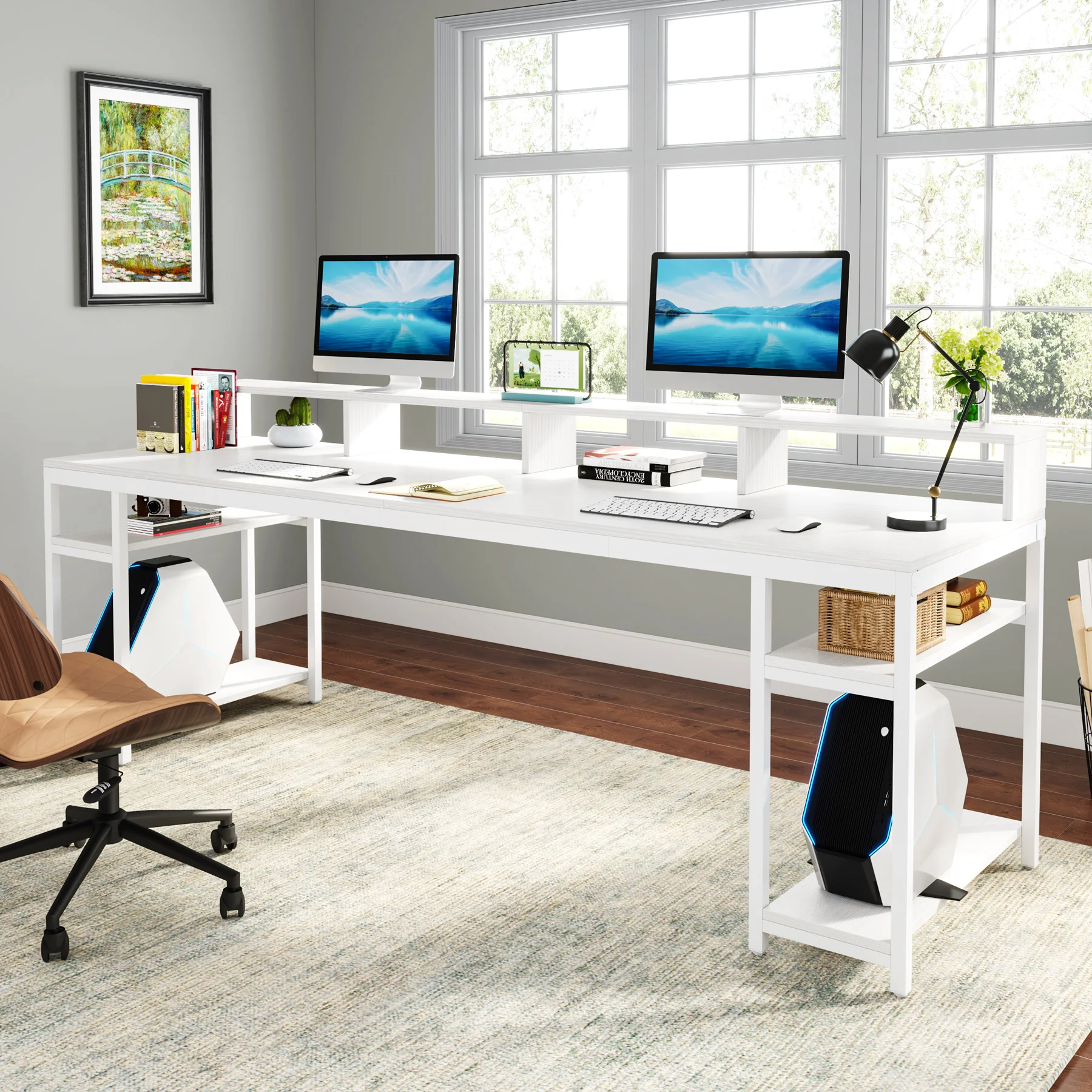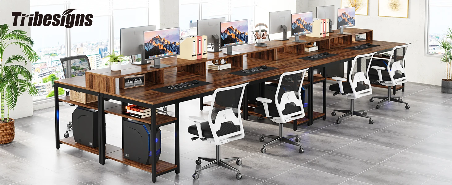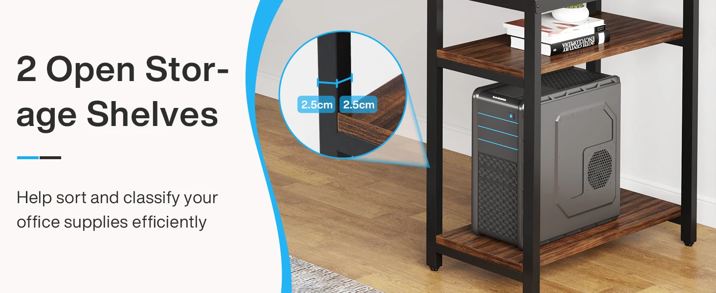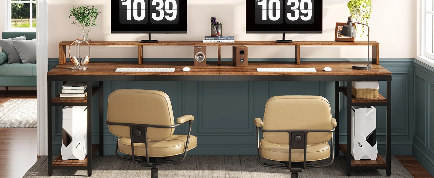 Ample Storage Solution - Each of the dual workspace comes equipped with a two-tier open storage shelf. This layout encourages a clean-desk approach and offers abundant under-desk storage and organization. The upper level can be used to store books, office supplies, and small decorations, with the lower level easily accommodating a CPU.