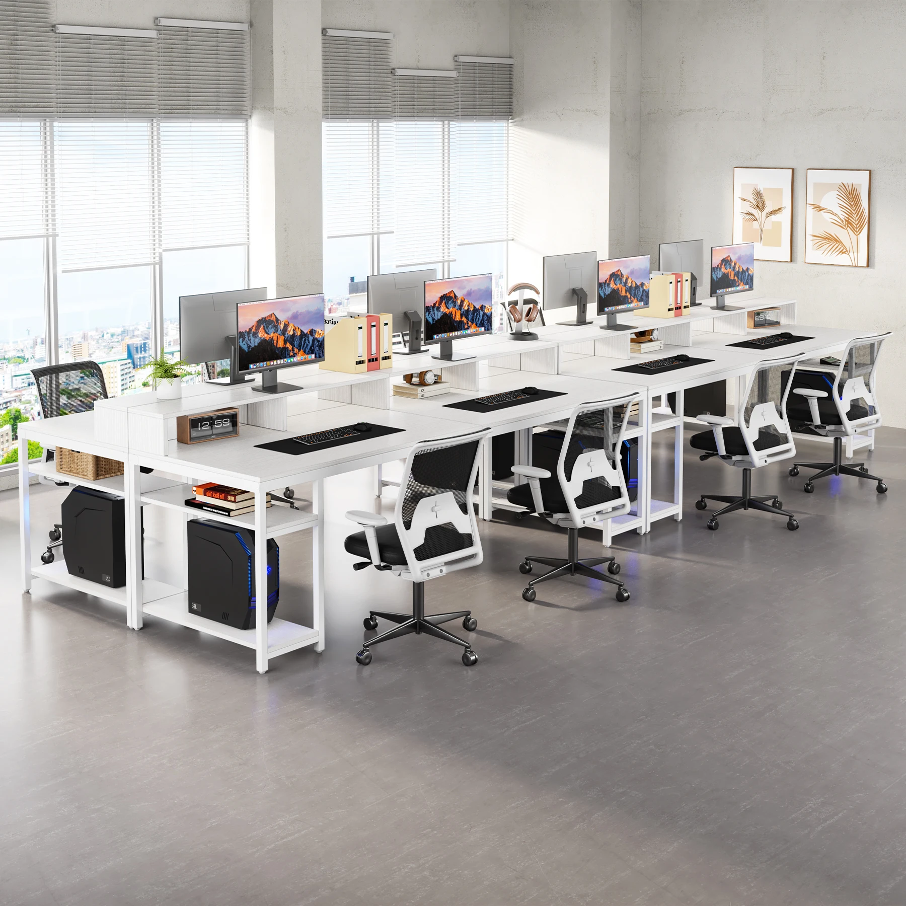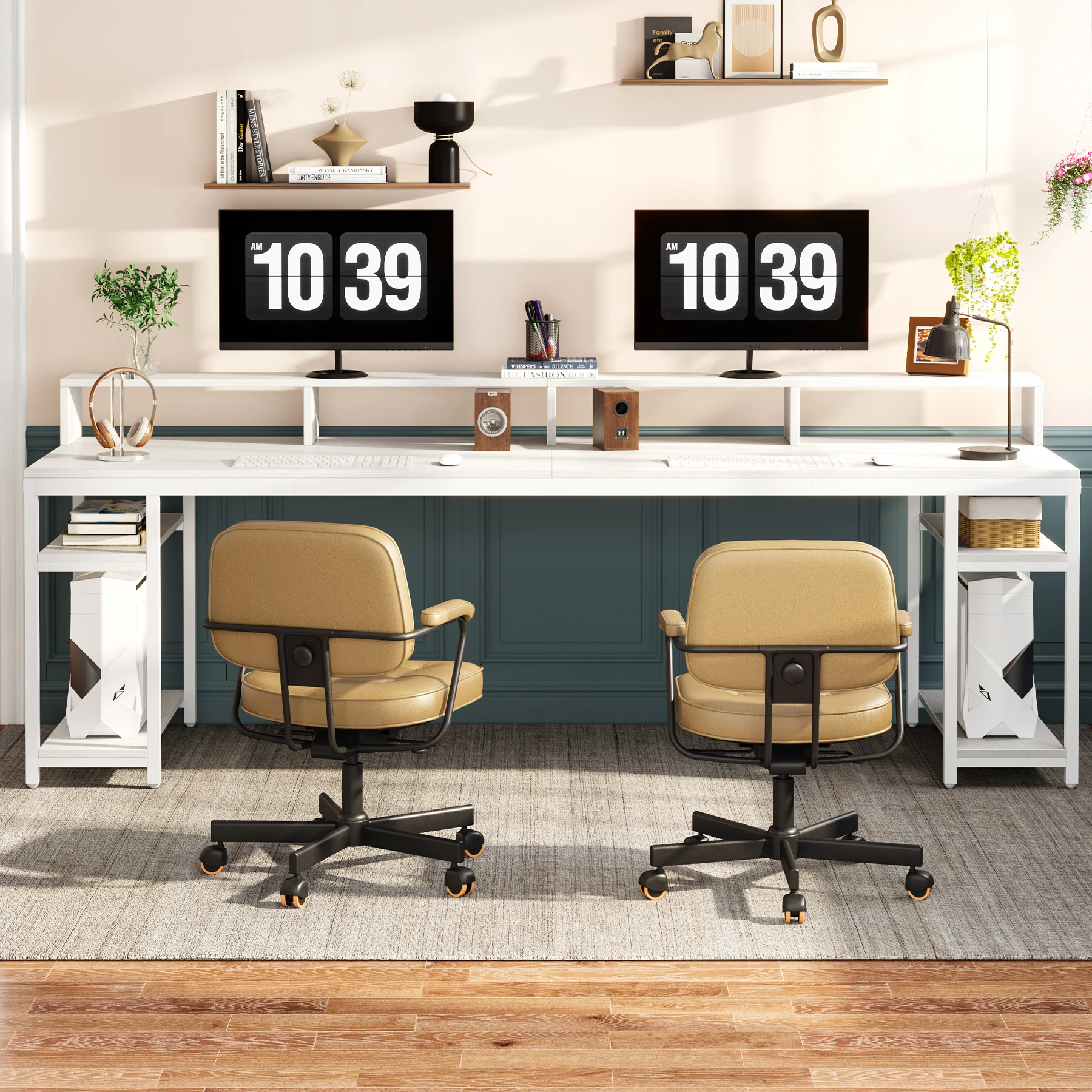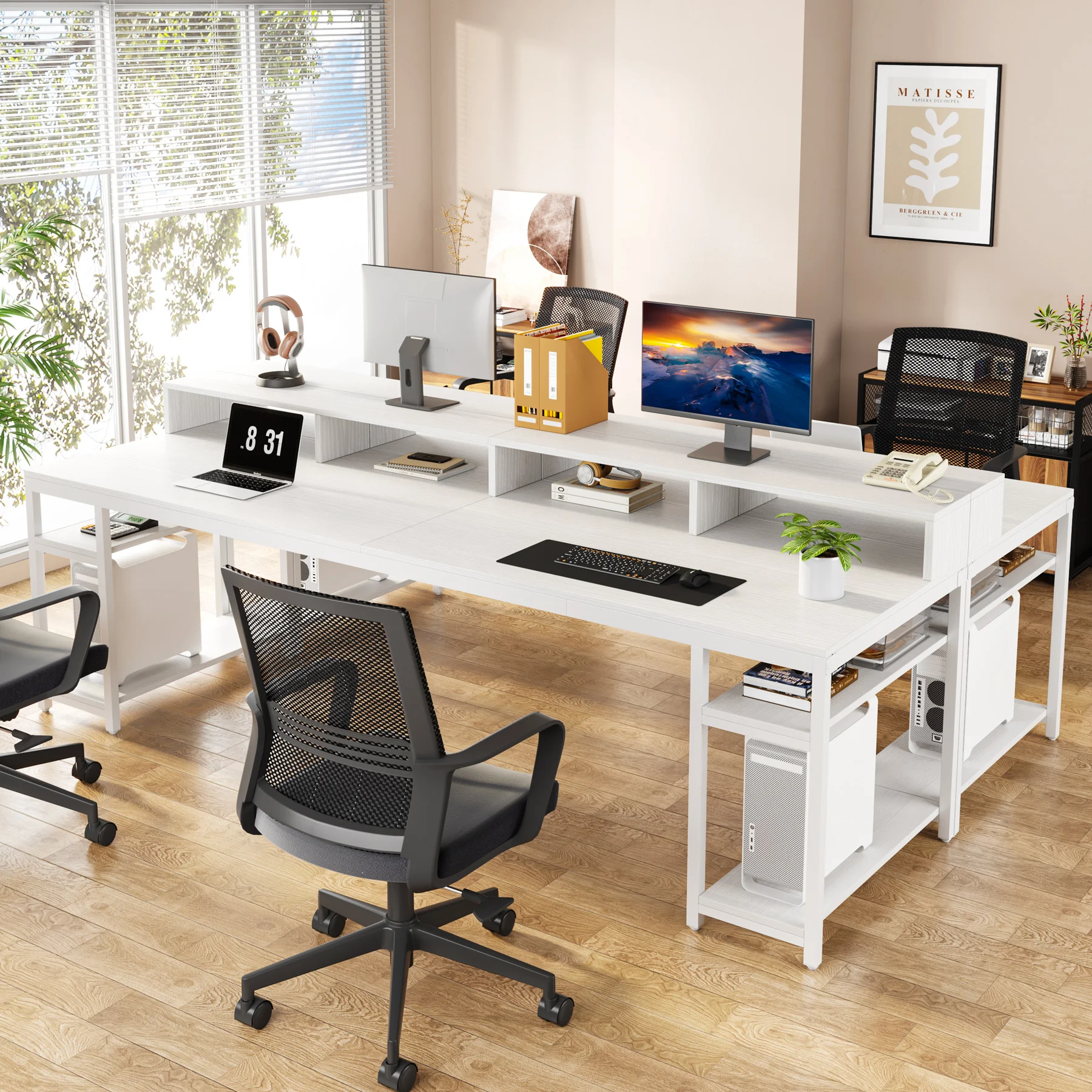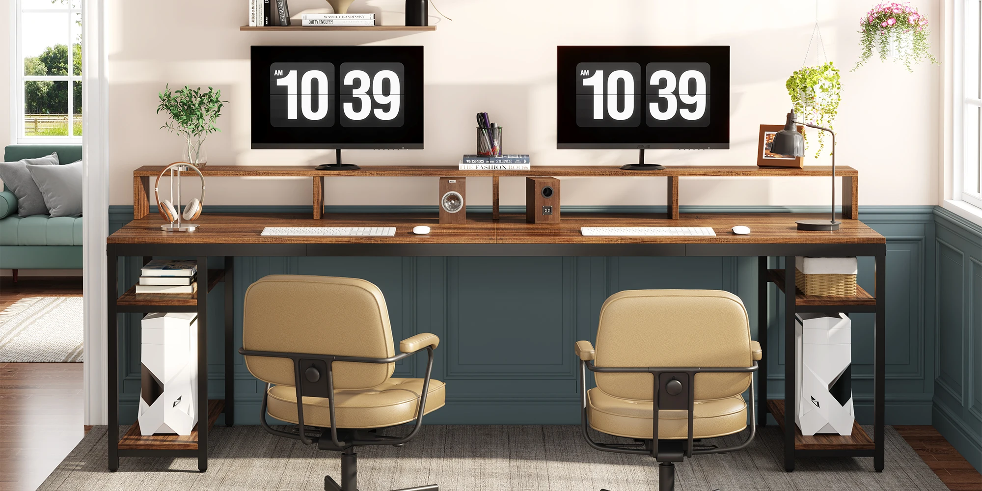 Ample Storage Solution - Each of the dual workspace comes equipped with a two-tier open storage shelf. This layout encourages a clean-desk approach and offers abundant under-desk storage and organization. The upper level can be used to store books, office supplies, and small decorations, with the lower level easily accommodating a CPU.