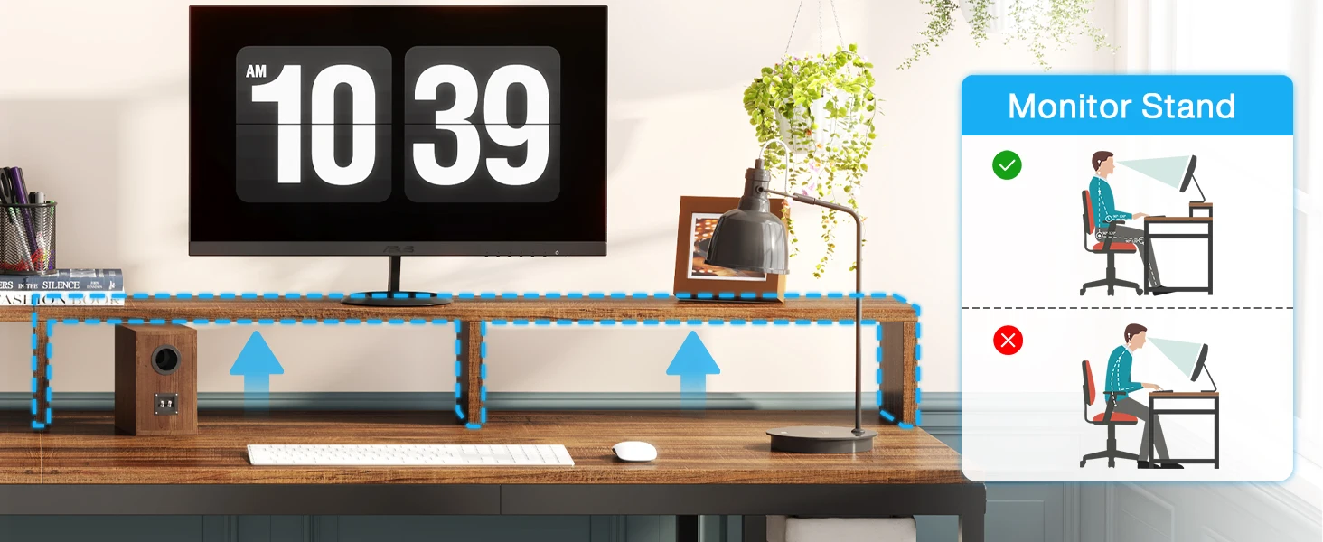 Ergonomic Monitor Stand - The elongated monitor stand, designed ergonomically, alleviates back and neck stress by securing a comfortable viewing height. It also capitalizes on desk space to optimize your workspace.