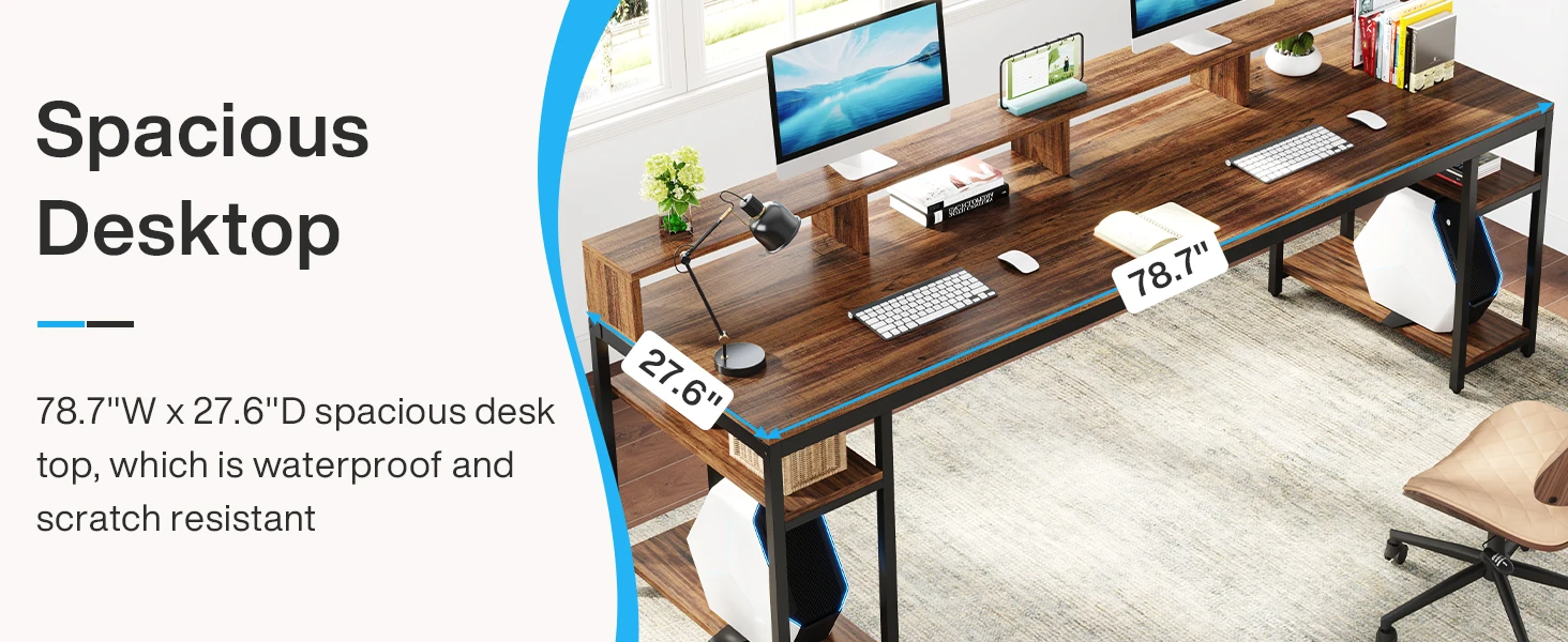 Double Desk Design - With a generous length of 78.74 inches and a width of 27.56 inches, this spacious double workstation desk easily accommodates large office machinery. Ideal for students, colleagues, and families, it comfortably seats two for seamless collaboration, gaming, or work without compromising individual space.