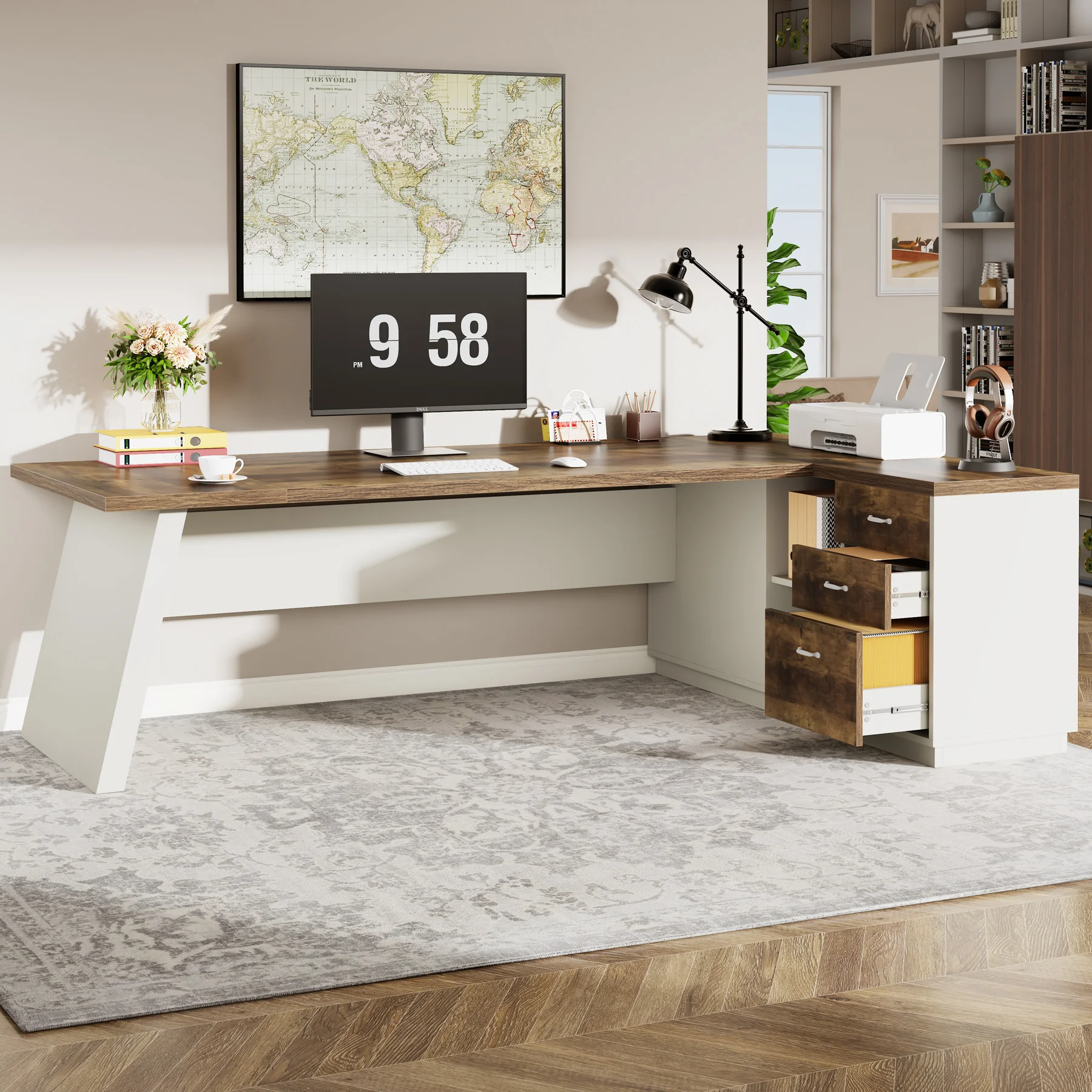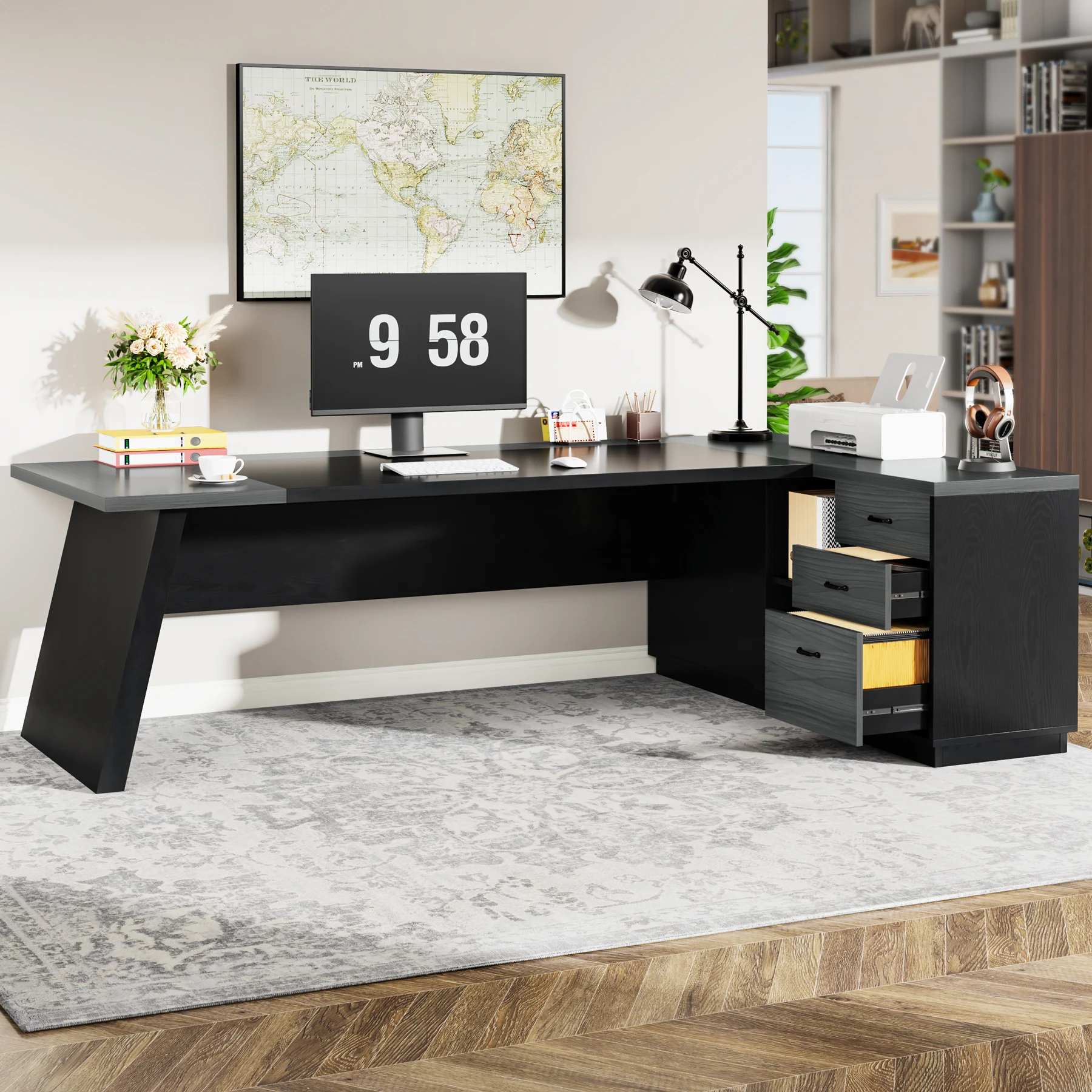 [Generous Storage]: Featuring two regular drawers, a lateral file drawer, and 4 open shelves, this executive desk ensures all your essential docs, stationery, and office supplies are within easy reach, promoting a well-organized work environment