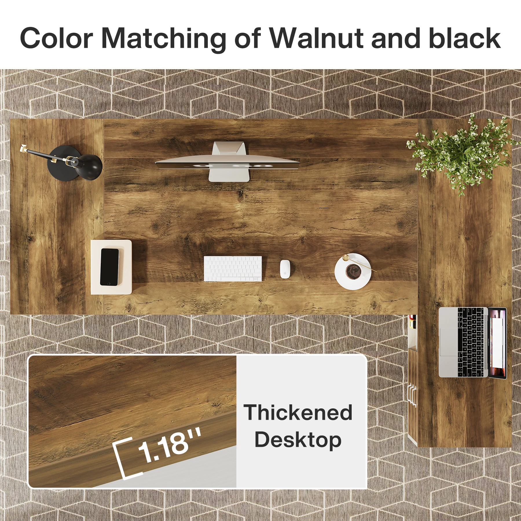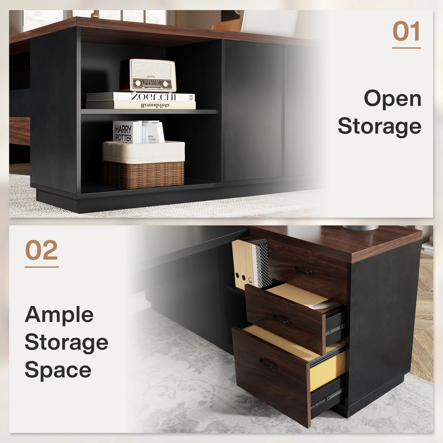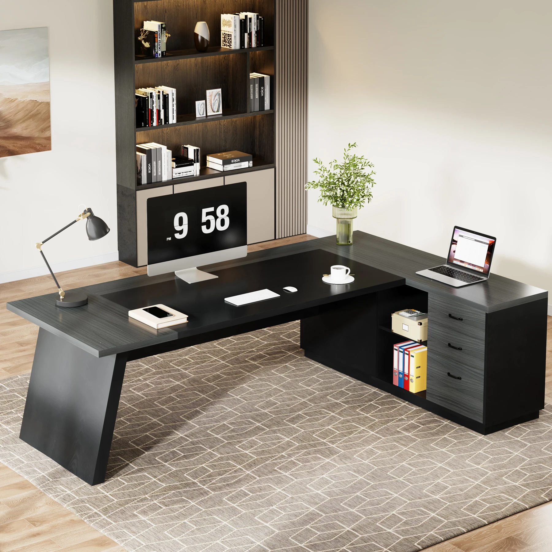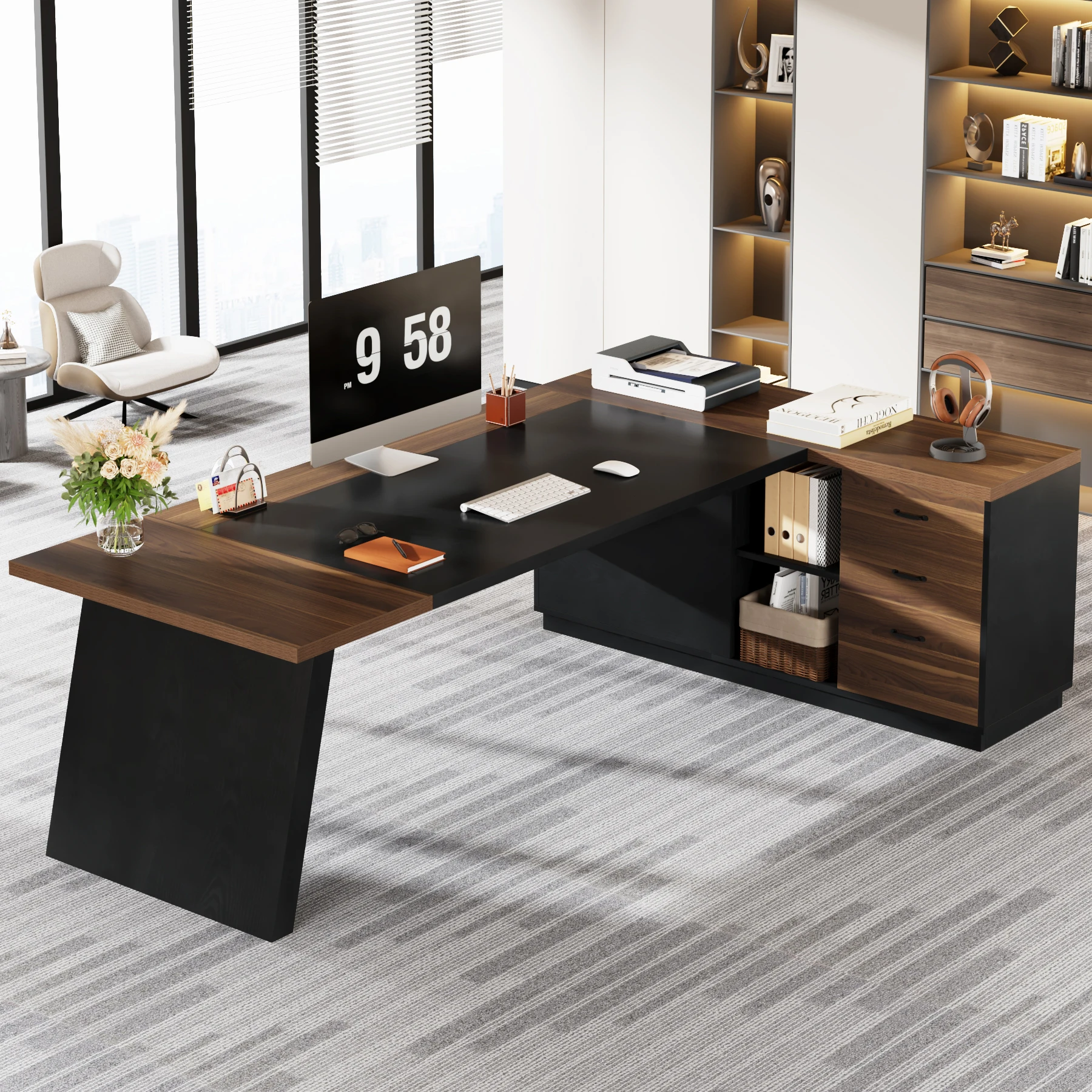 [Exquisite Finish]: The exquisite walnut finish combined with stylish black accents grant this executive office desk a classy touch that easily complements various office decors, adding a flair of sophistication to your workspace