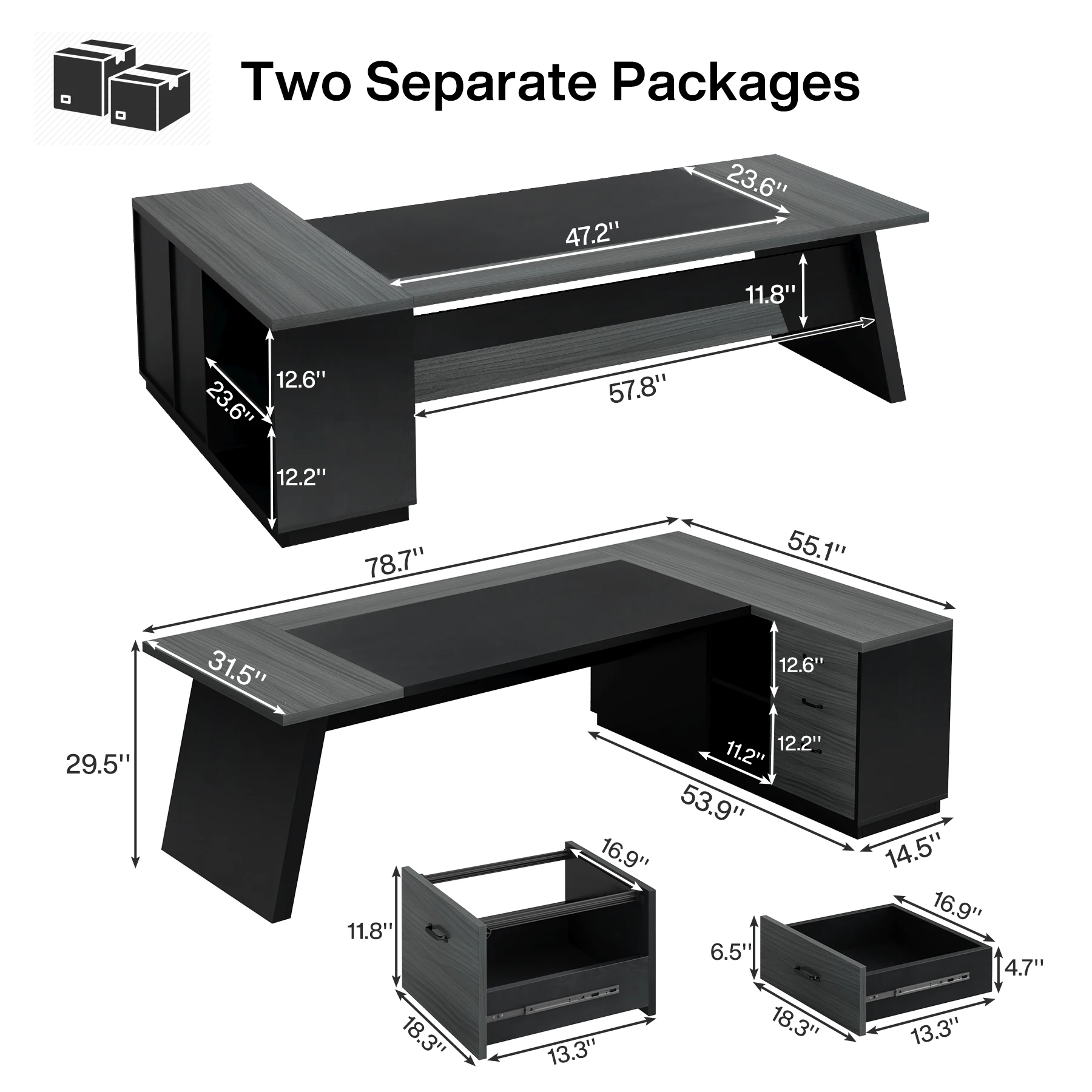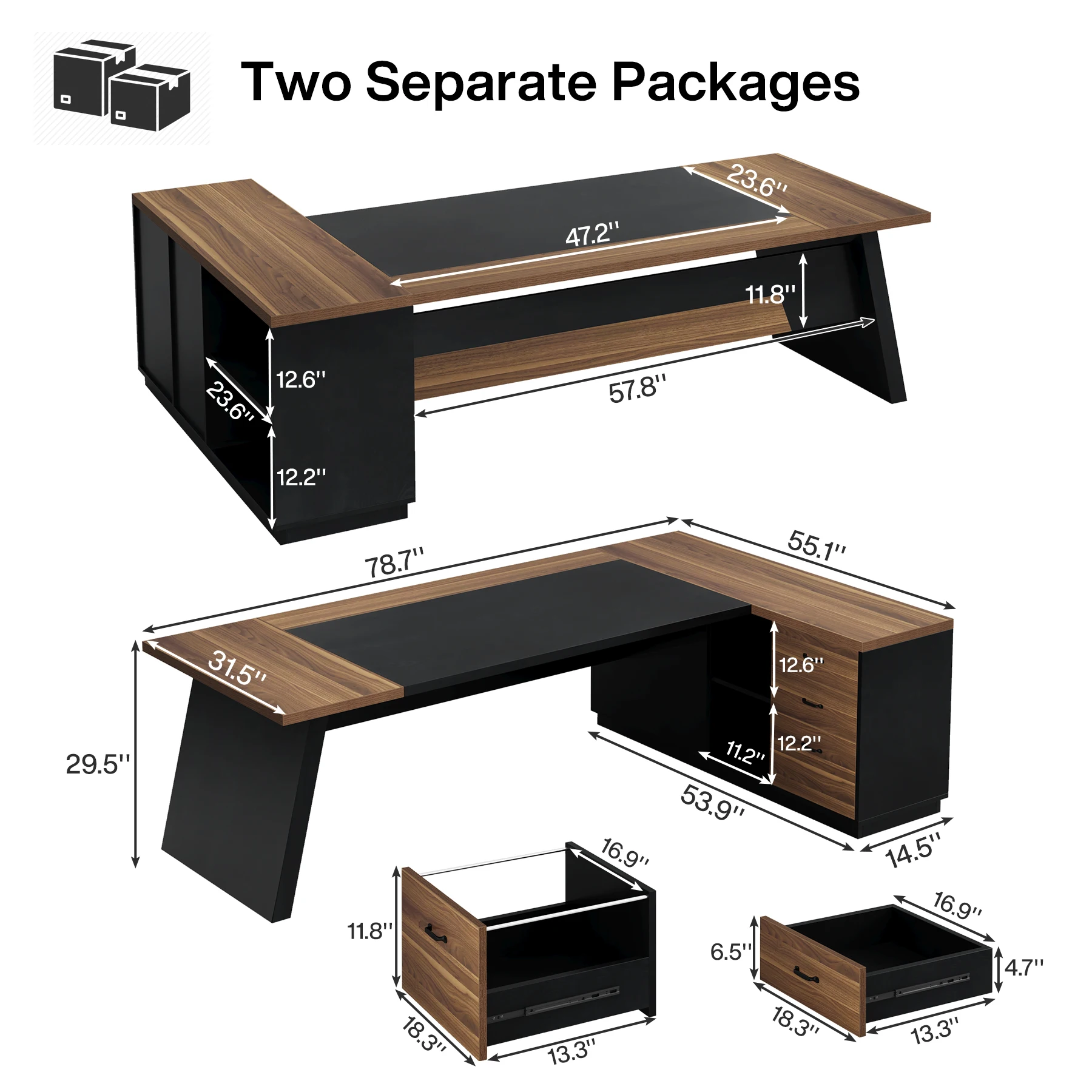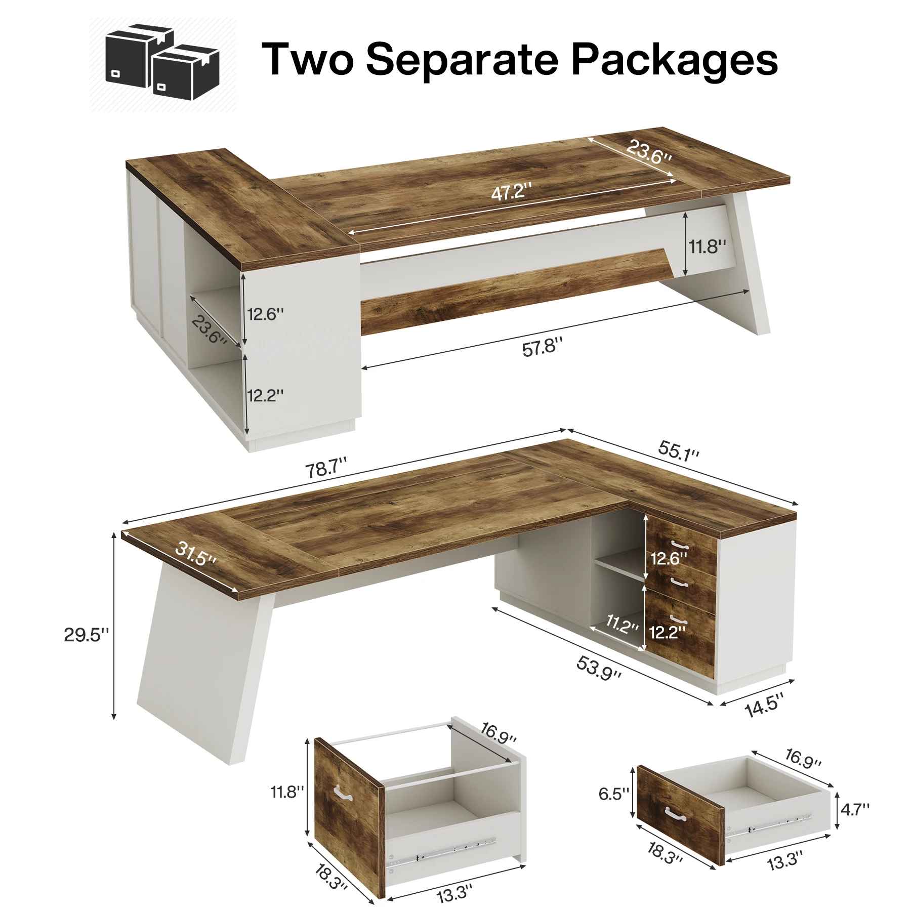 [Expansive Workspace]: Note: two separate packages. The Tribesigns l-shaped executive desk provides ample surface area (78.74" L x 55.11" W x 29.53" H) to cater to all your office needs, from multiple monitors to paperwork, offering you all the room you require to work efficiently