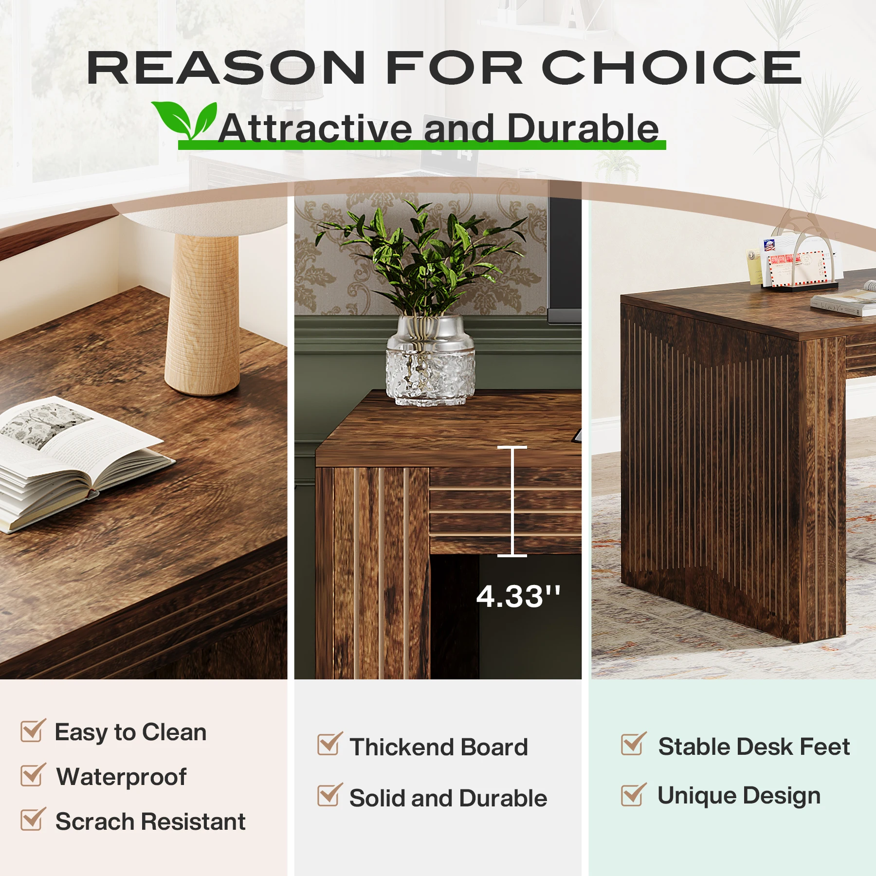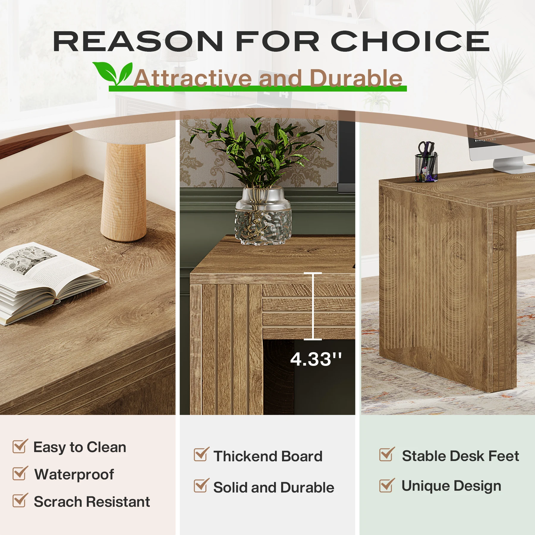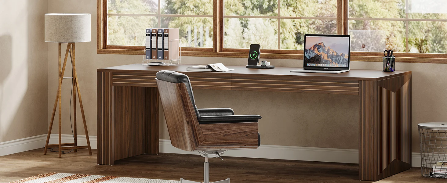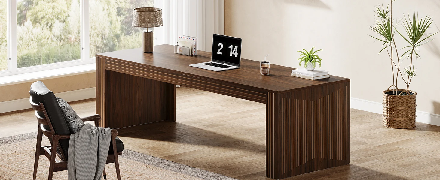 RELIABLE CONSTRUCTION: The large computer desk, made from thickened E0 board, offers lasting usability while preserving its elegant appearance even with prolonged use. Moreover, the adjustable foot pads stabilize the large office desk on uneven surfaces and prevent floor scratches