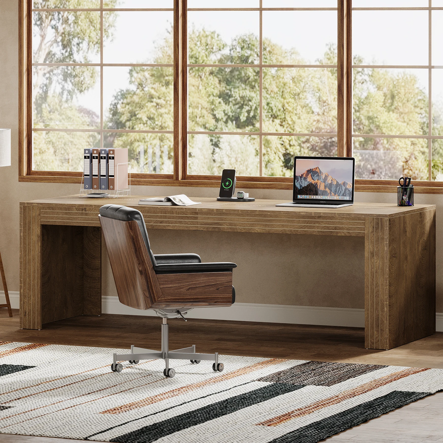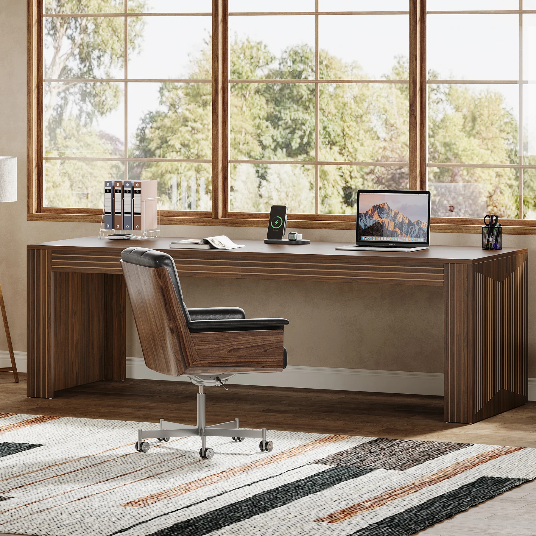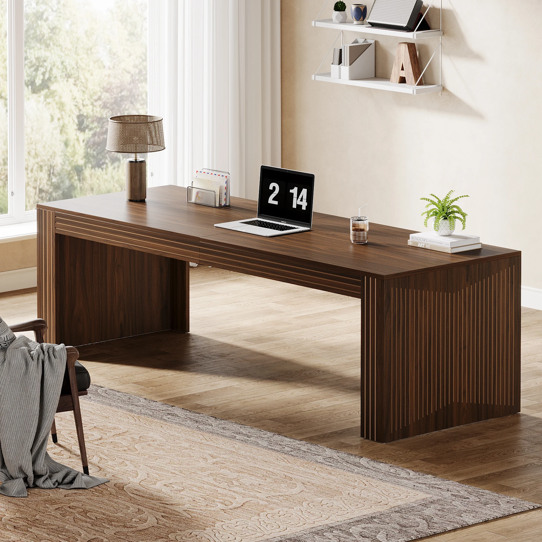 RELIABLE CONSTRUCTION: The large computer desk, made from thickened E0 board, offers lasting usability while preserving its elegant appearance even with prolonged use. Moreover, the adjustable foot pads stabilize the large office desk on uneven surfaces and prevent floor scratches