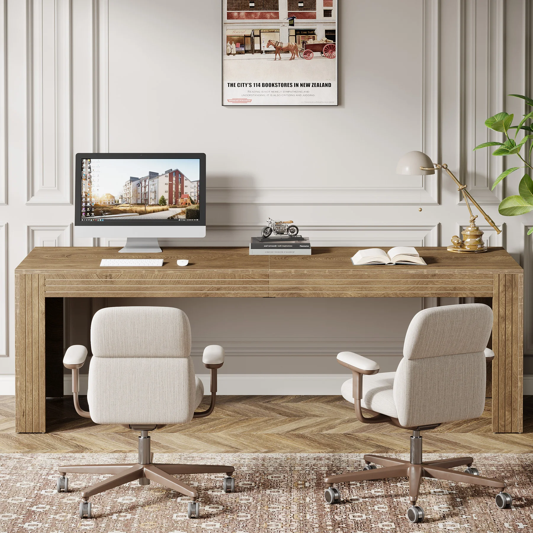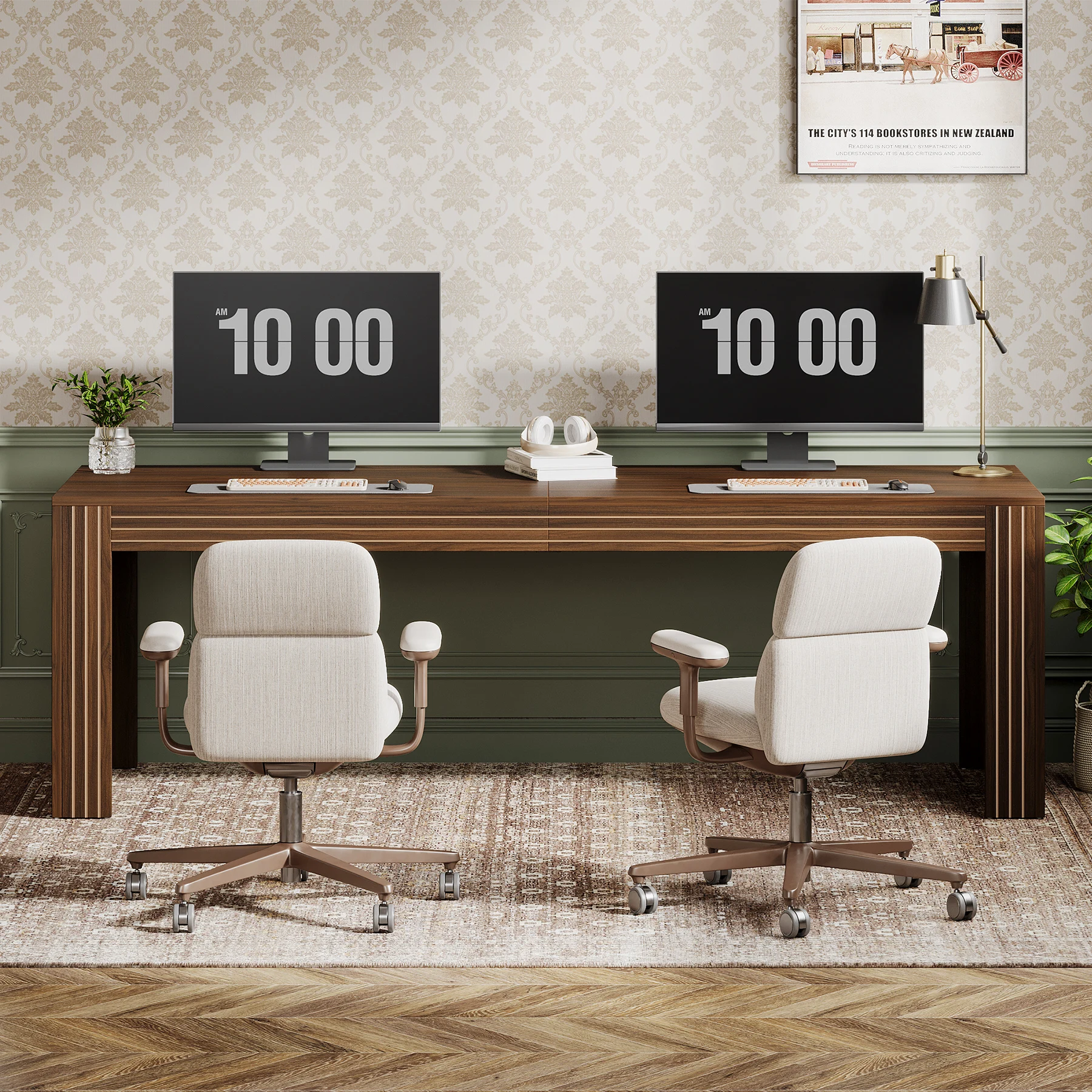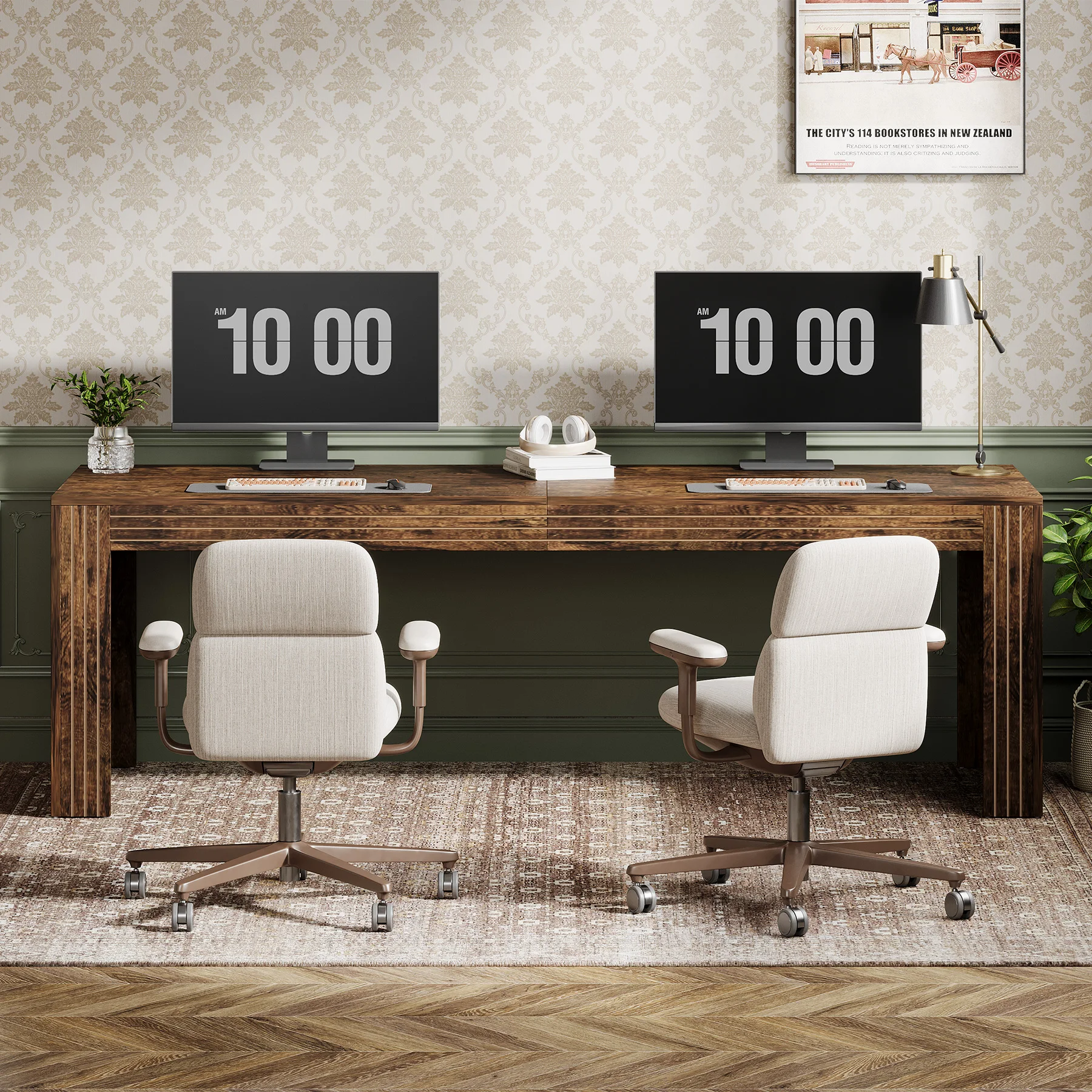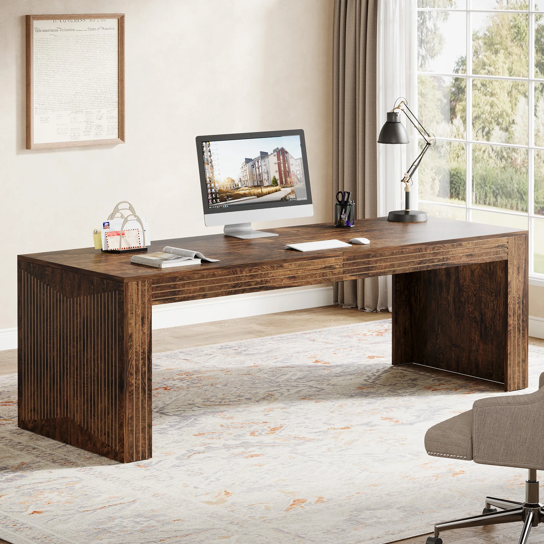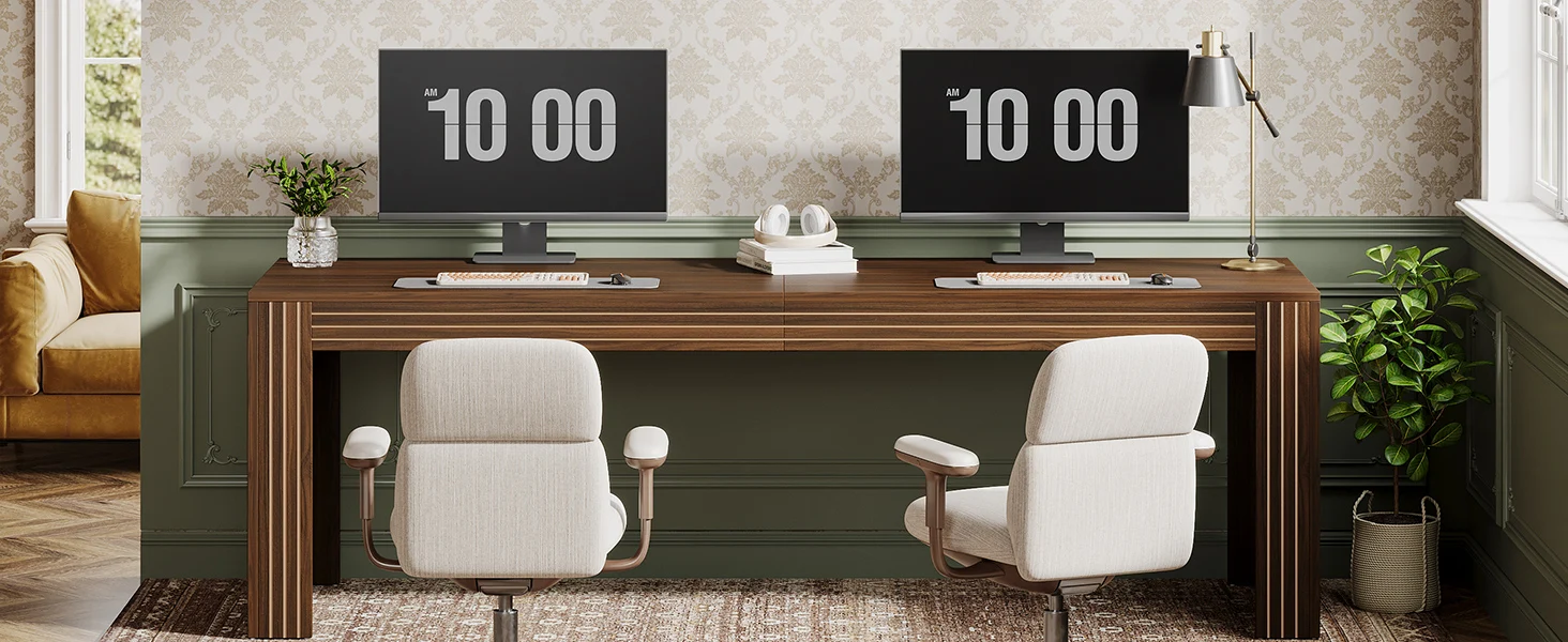 DOUBLE DESK DESIGN: The extra-long desk easily fits two monitors on one side, while still offering ample space for a computer, a printer, and assorted items on the other side. Also, it enables you to share your workspace with your partner or family members, without sacrificing personal space
