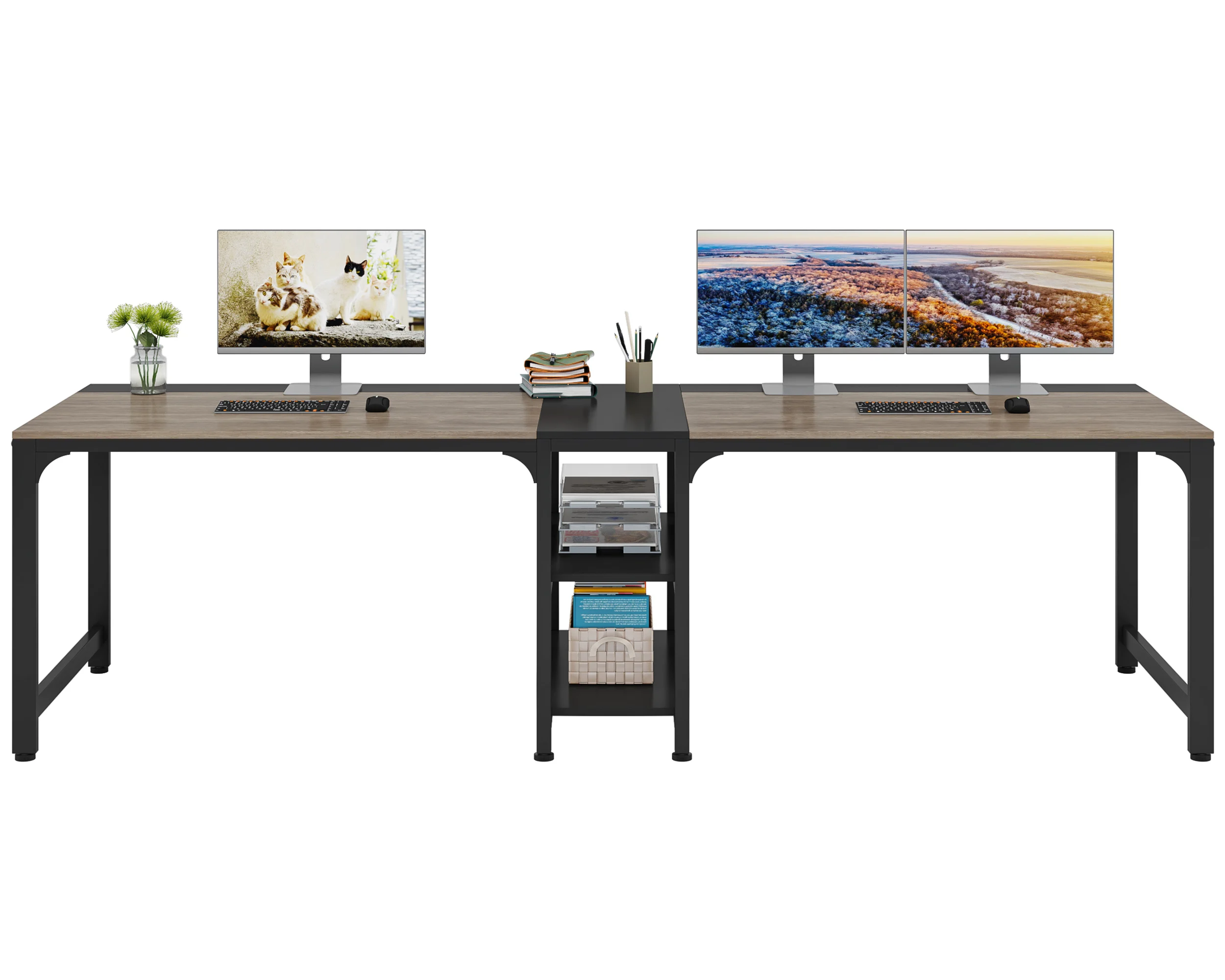 【Ample Work Area, Large Storage】: The double computer desk combines charming style and functional design, 90.55'' x 27.56'' tabletop provides the room you need for office essentials like your laptop, stacks of folders, and notepads. Attached with 2-tier storage shelves to put your printer, books, files, plants, and office supplies. Defining your space whatever you need.