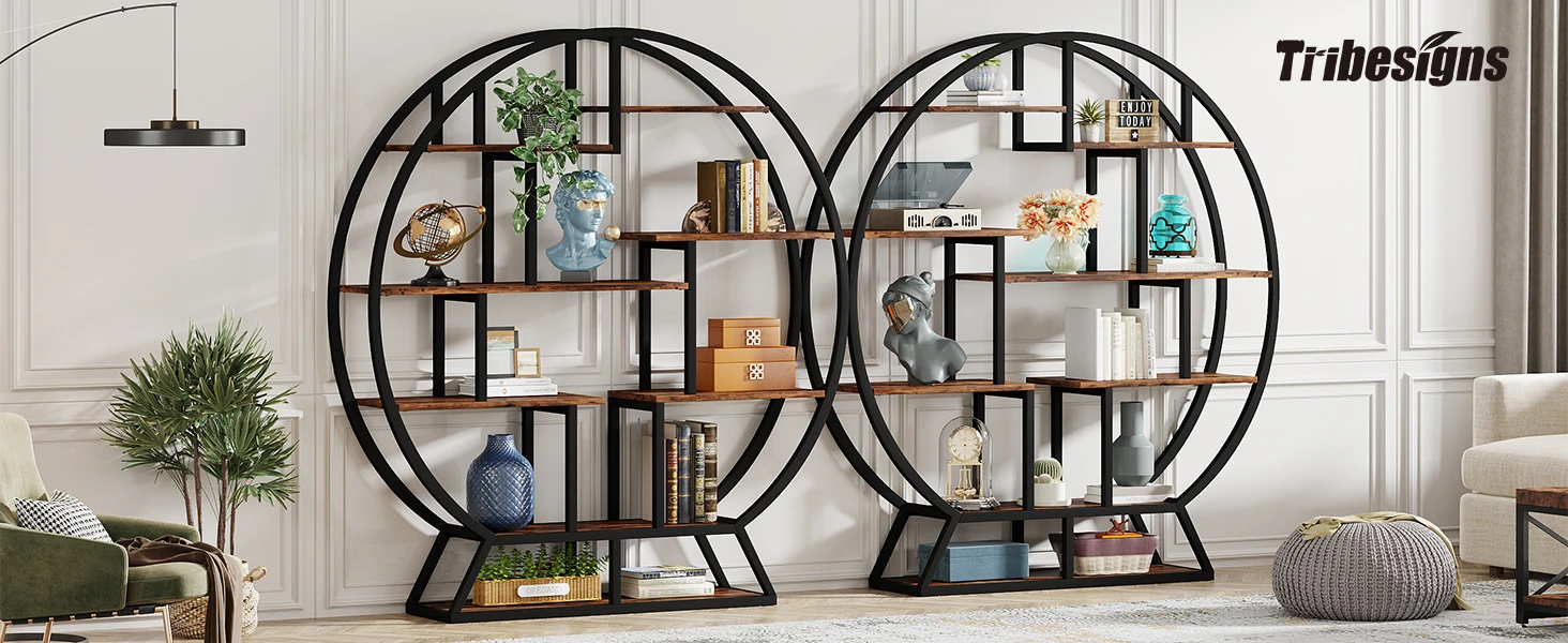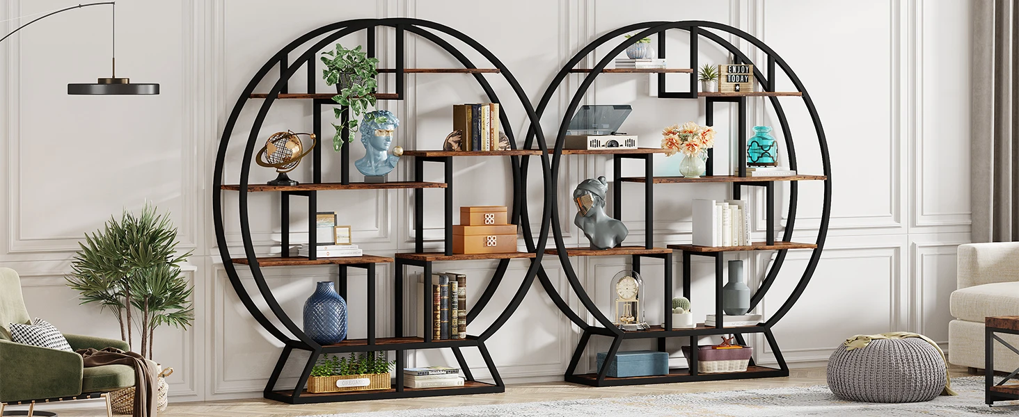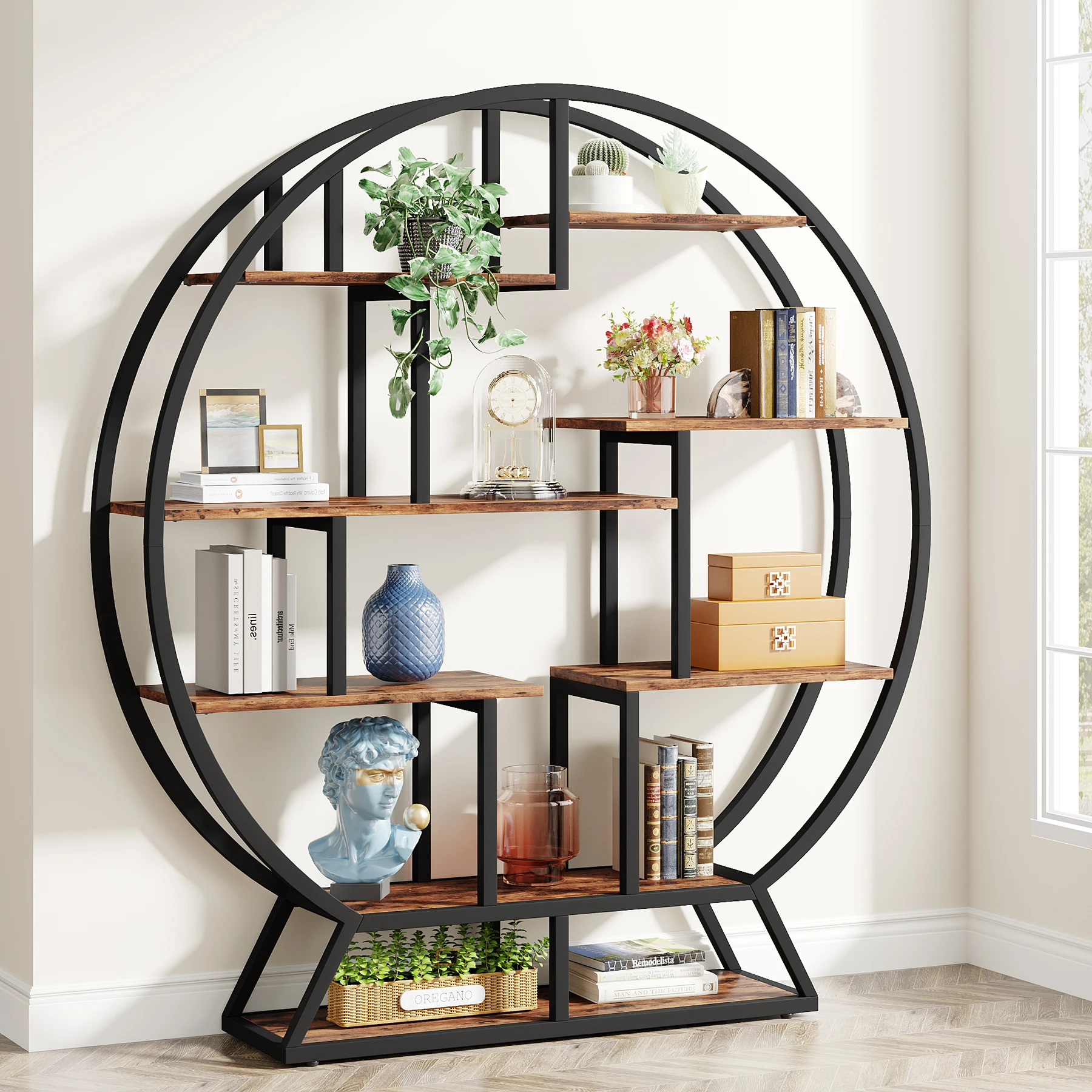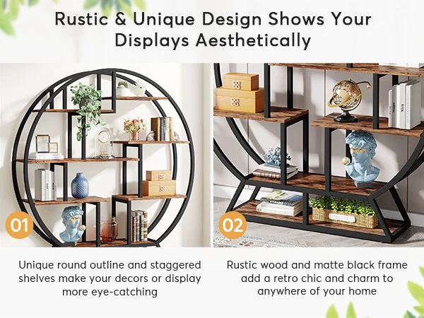 UNIQUE DESIGN & RETRO CHARM: Designed with round silhouette and staggered shelves, this industrial-inspired bookshelf creates an eye-catching display vignette and make a splash of your home decor. Finished in matte black and rustic brown, the etagere bookshelf adds the industrial refined sensation and endless charm to any space.