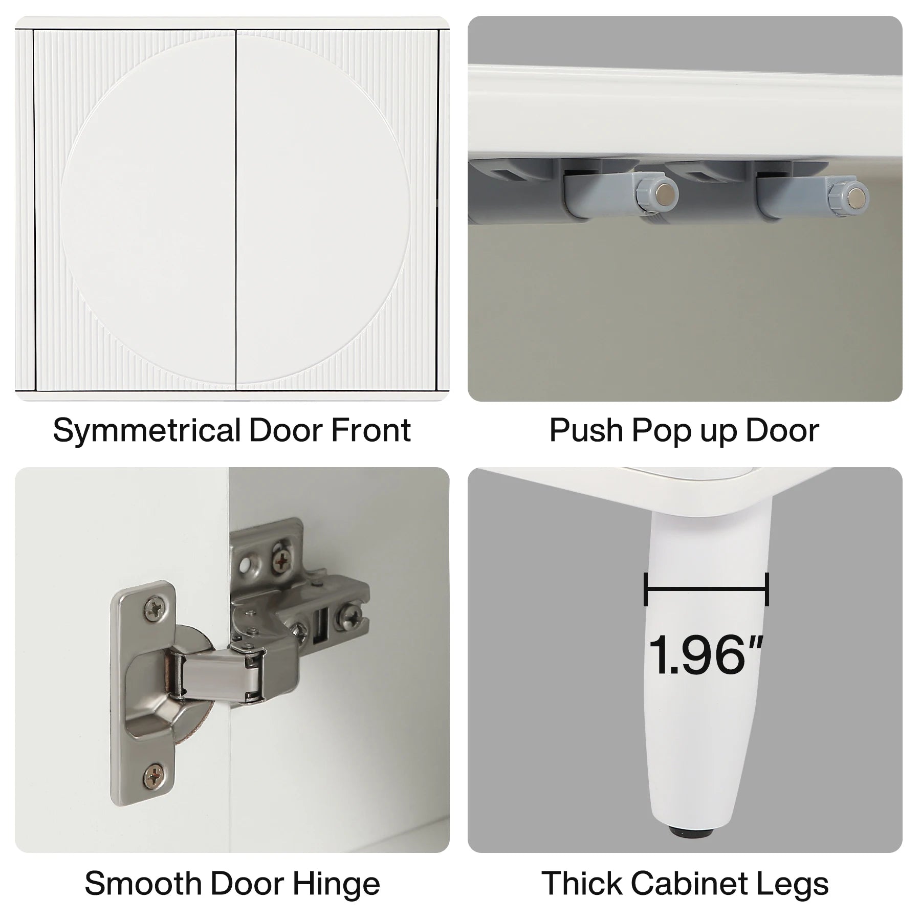 Stylish and Chic Style: Featuring bold details and white finish, this modern sideboard cabinet effortlessly combines timeless design with stunning contemporary flair. The door fronts are specially designed with a symmetrical semicircle pattern, adding a unique touch to its overall aesthetic. NOTE: Simply press on the door and have it spring open.