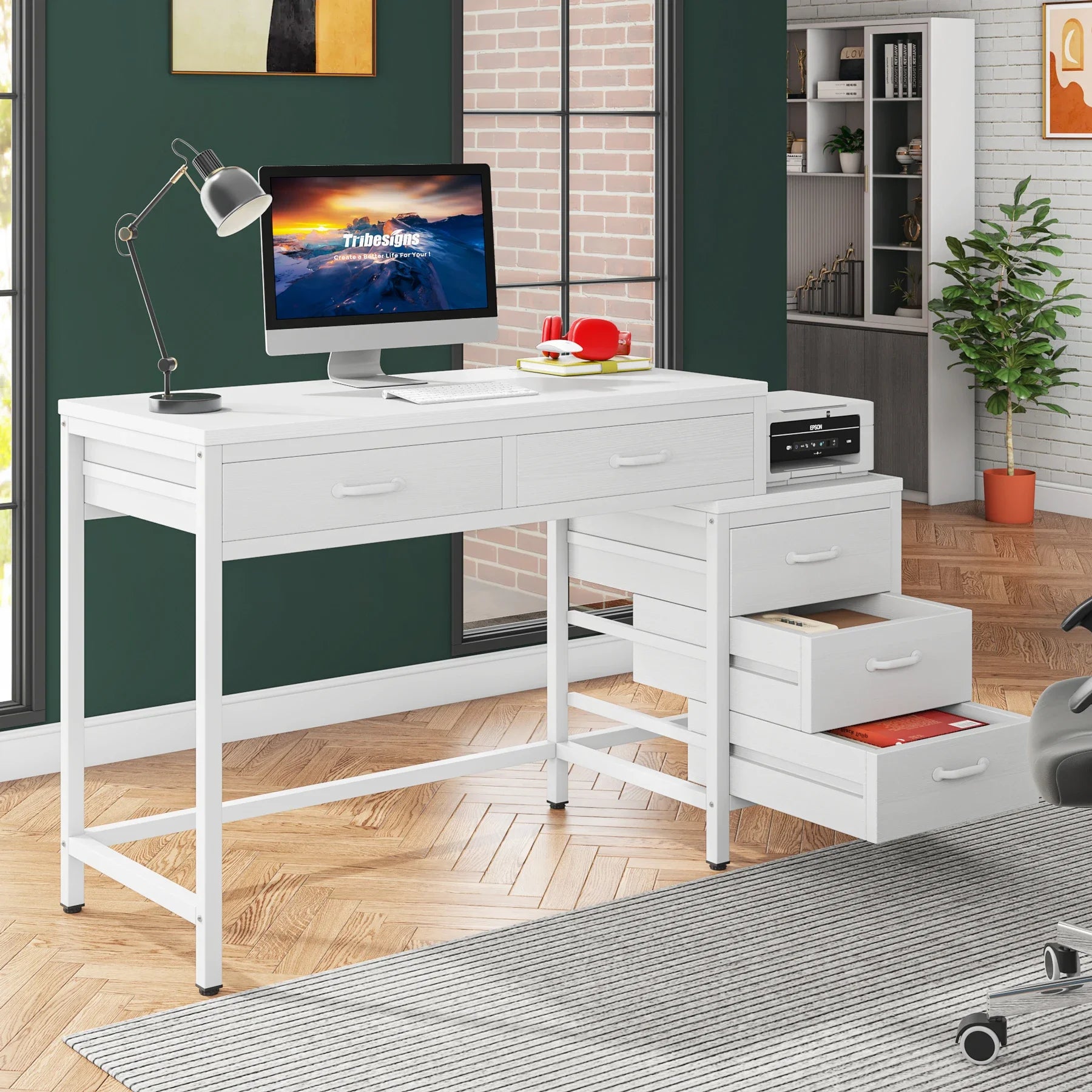 MonoWood Computer Desk with 5 Drawers, Home Office Desks with Reversible Drawer Cabinet Printer Stand, Industrial PC Desk