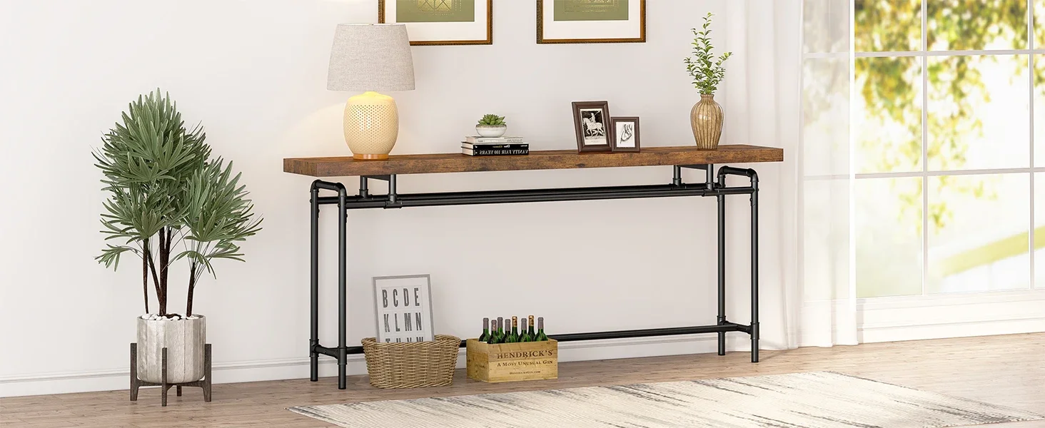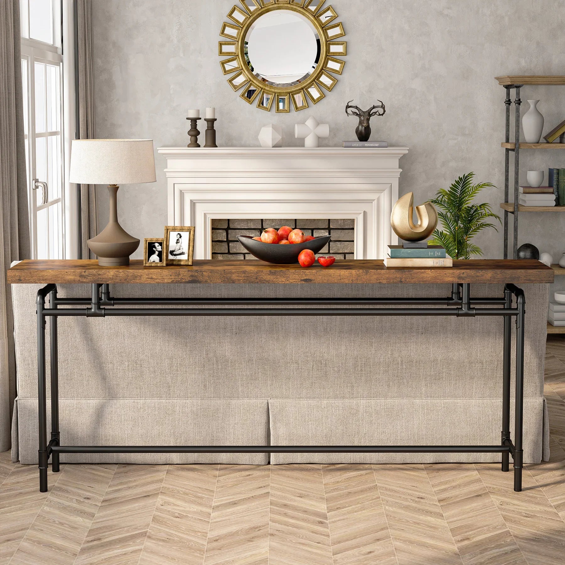 Minimalist Industrial Style: With its rustic brown tabletop and industrial metal legs, this console table offers a simple yet stylish design that complements any home decor. Its clean lines and water pipe-style steel legs create a new, unparalleled look that is both modern and functional. Measuring 70.9” W x 11.8” D x 31.4” H, it's the perfect size for any space.