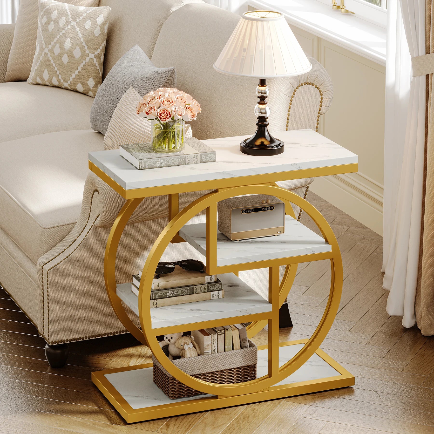 【Spacious 4-Tier Shelving】: This side table is designed with 4 expansive shelves, which provide abundant storage for all your essentials like books, lamps, plants, remotes and other small items. With this versatile piece, maintain an organized and clutter-free decor in your living room or bedroom.