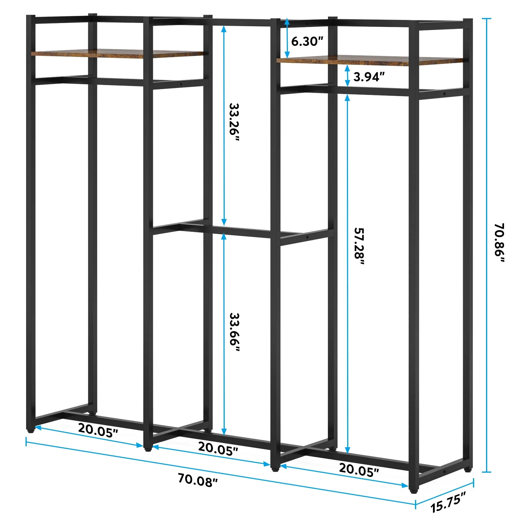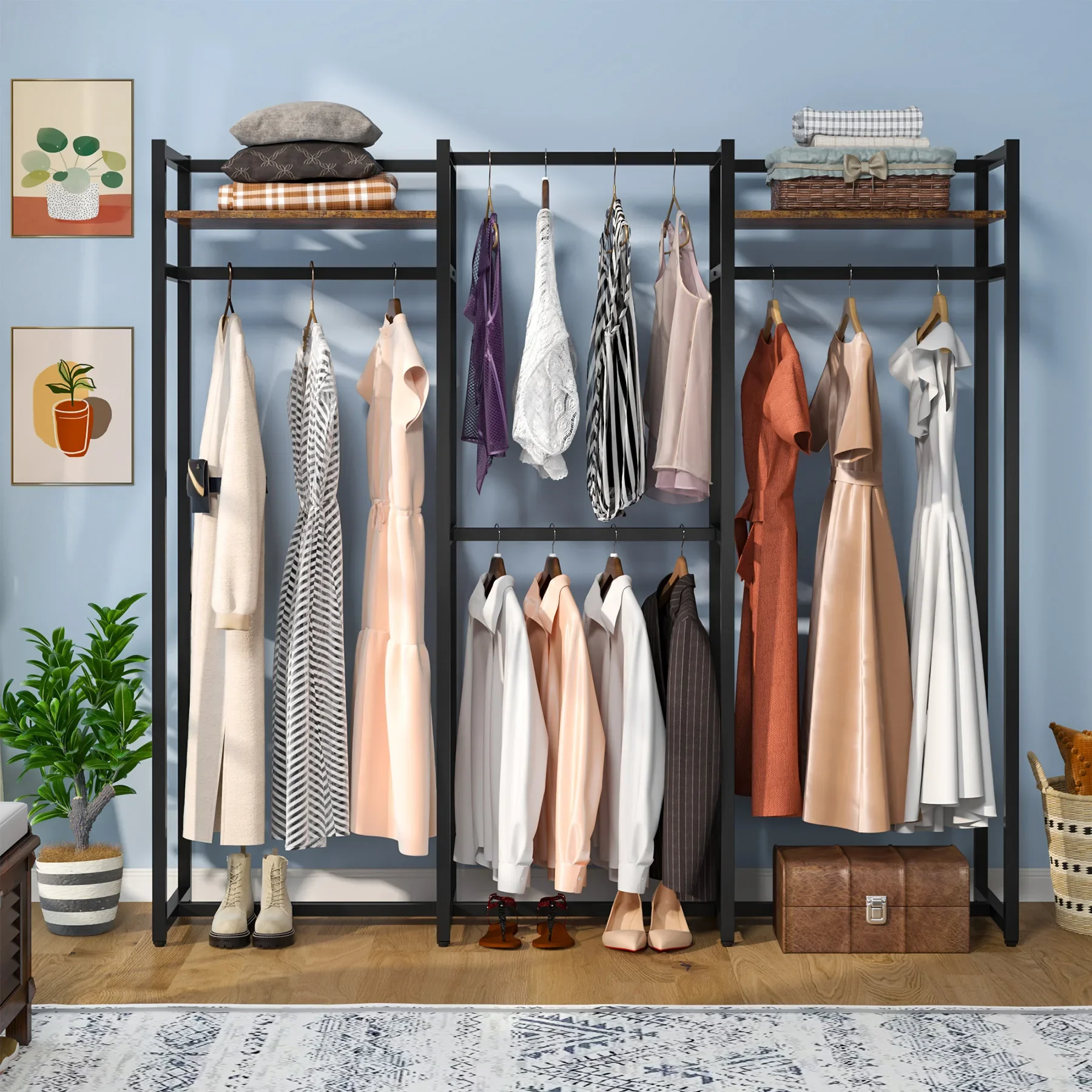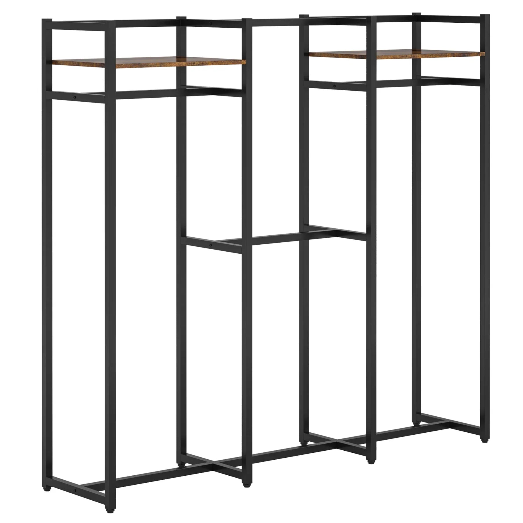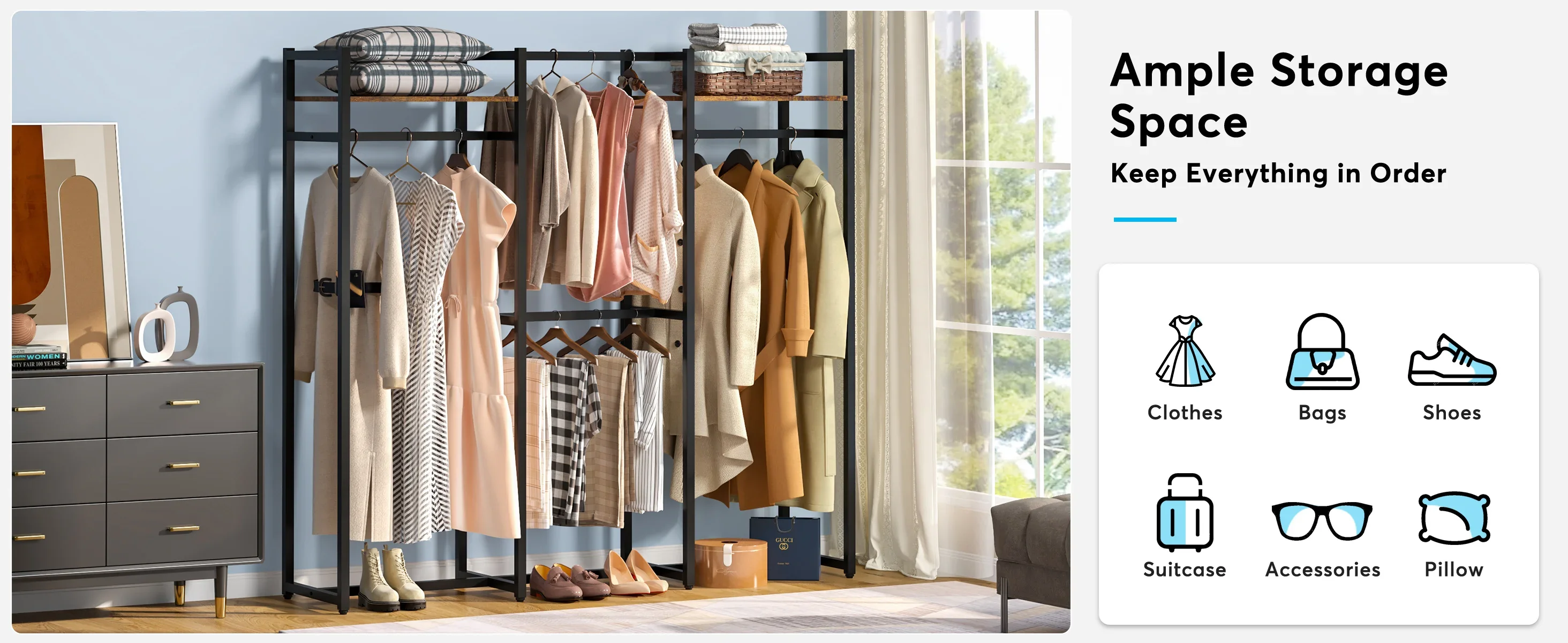 Large Storage Solution: 4 hanging rods accommodate both long and short garments. Every garment rod hold up 50 lb. 2 open shelves ensure you plenty of room to place clothes. And put large box or off-season clothes on the top for added storage.