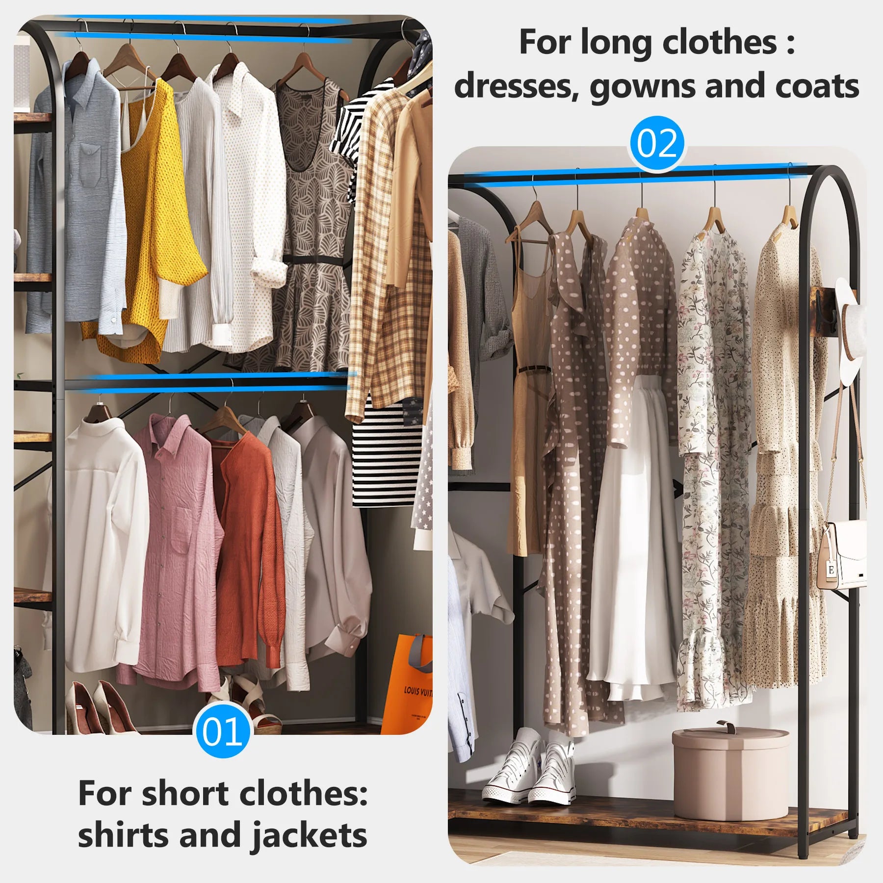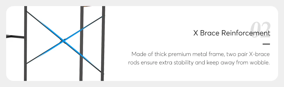 Constructed of a heavy-duty metal frame and E1 particle board, this clothing rack is both durable and long-lasting. - The double "X" crossbars at the back of the rack provide additional stability, and adjustable feet pads protect your floors from scratches. With a weight limit of up to 400 lbs, you can store all your clothes and accessories in one place without the fear of the heavy-duty clothes rack collapsing or tipping over.