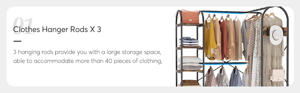 Our garment rack for hanging clothes provides ample clothing storage space, featuring built-in ultra-durable garment rods and shelving. - With three high-quality and sturdy garment rods and five sides and two large shelves, you'll have enough space to store clothes, shoes, and accessories to keep everything neat and organized. The side hooks make organizing and accessing your favorite items like keys, hats, and scarves a breeze.