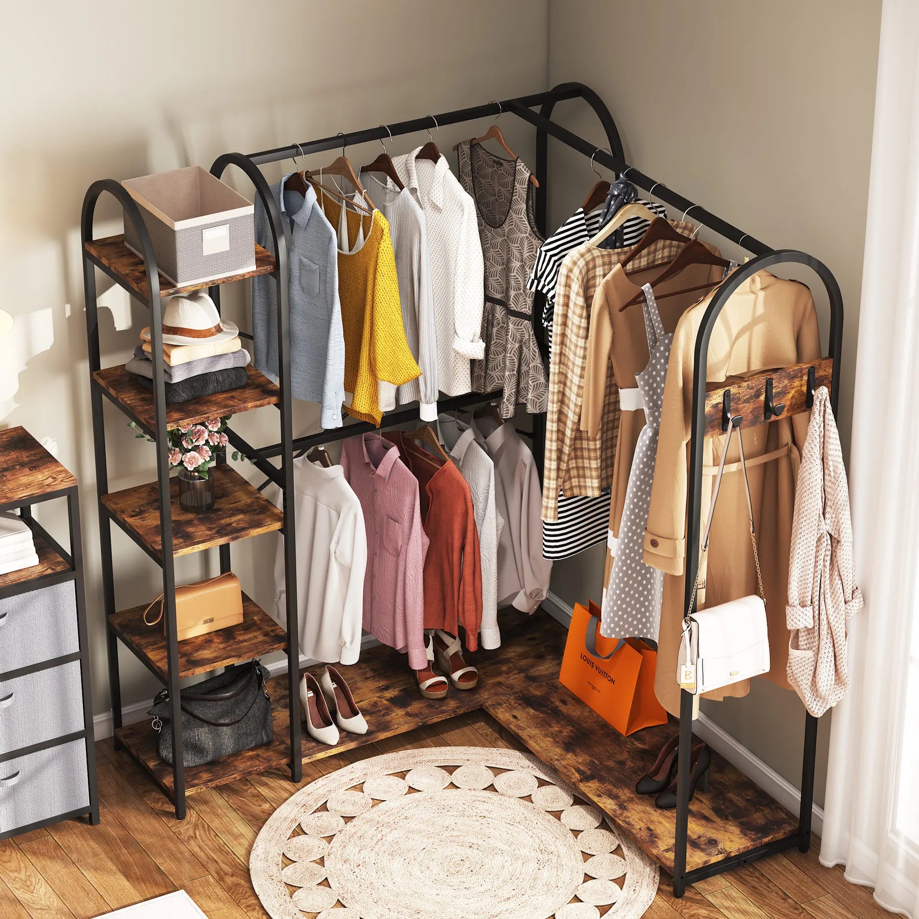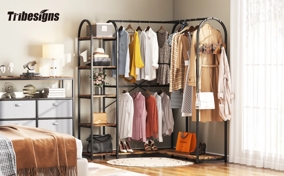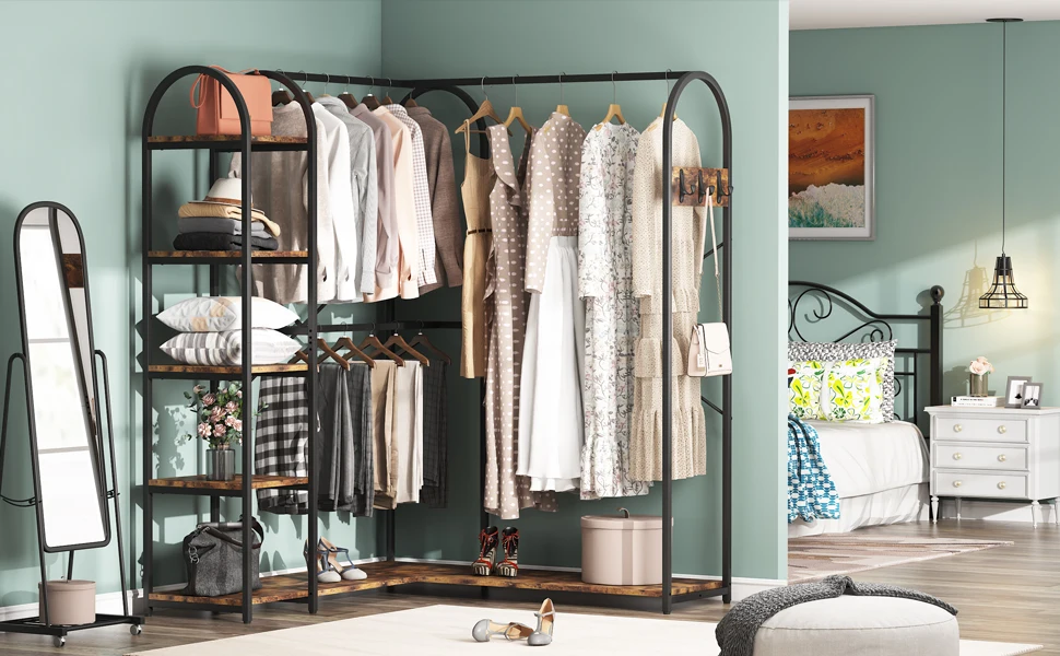 Featuring a smart L-shaped corner design, our clothes rack is the perfect solution for small spaces. - It's a fantastic way to save space while simultaneously giving your bedroom or closet a fresh, modern look. With the ability to fit snuggly in a corner, our L-shaped clothes rack will free up plenty of floor space for you to move around and navigate easily.