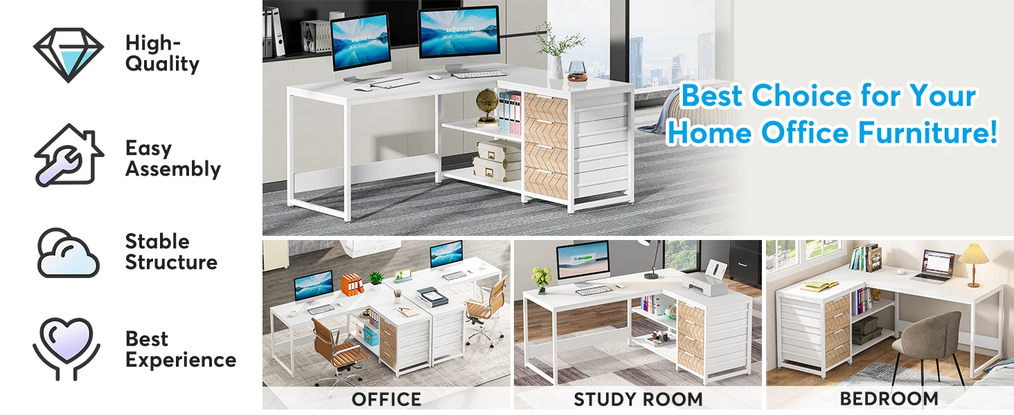 Sturdy & Durable Construction: This computer desk with drawers is constructed of high-quality E1 particle board with a sturdy metal frame to ensure durability and large weight capacity. Equipped with adjustable feet to keep this corner computer desk stable even on an uneven floor