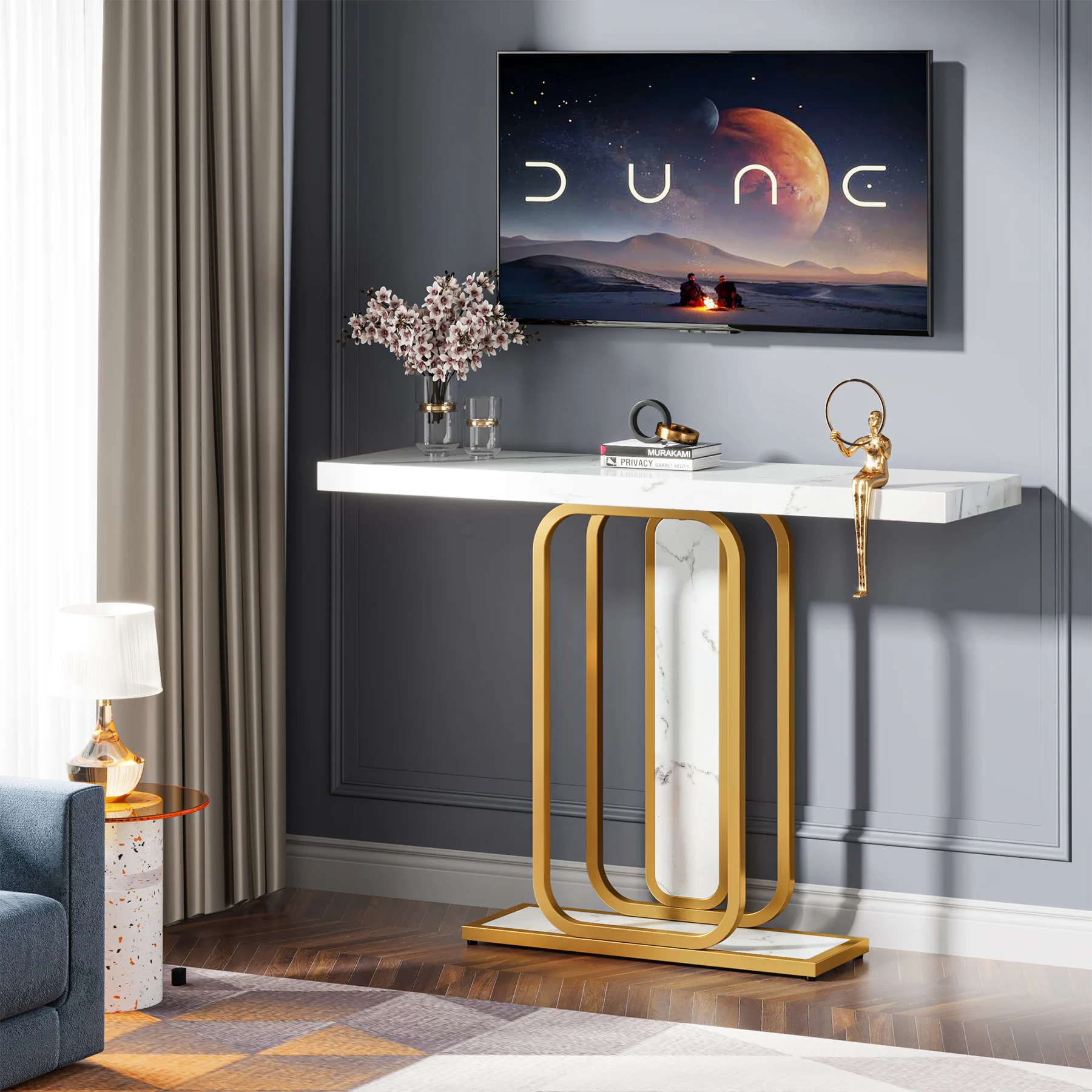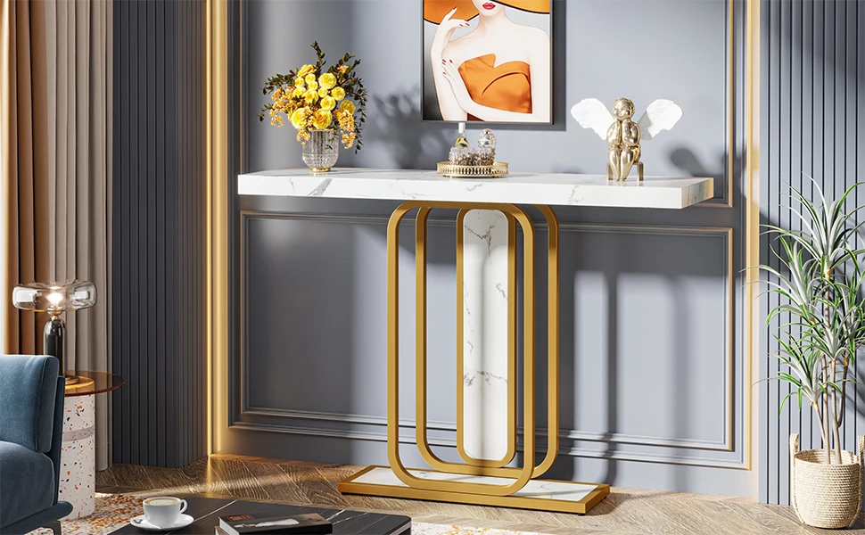 【Modern Entry Table with Lighting】:The sofa table features a faux marble white finish with gold metal frame that offers a unique and trendy aesthetic that can complement a variety of interior design styles, and makes an elegant and stylish statement in your home