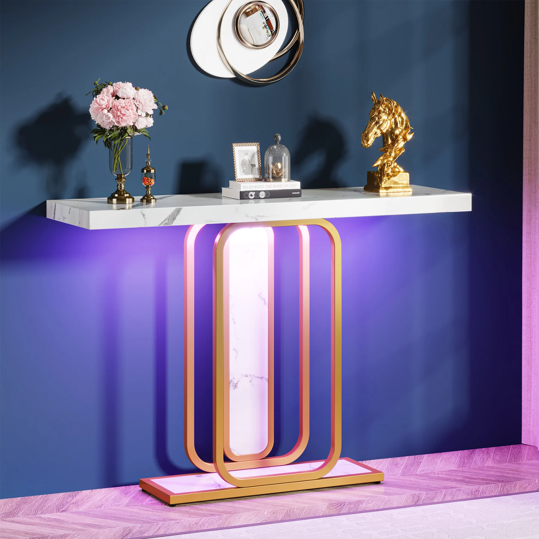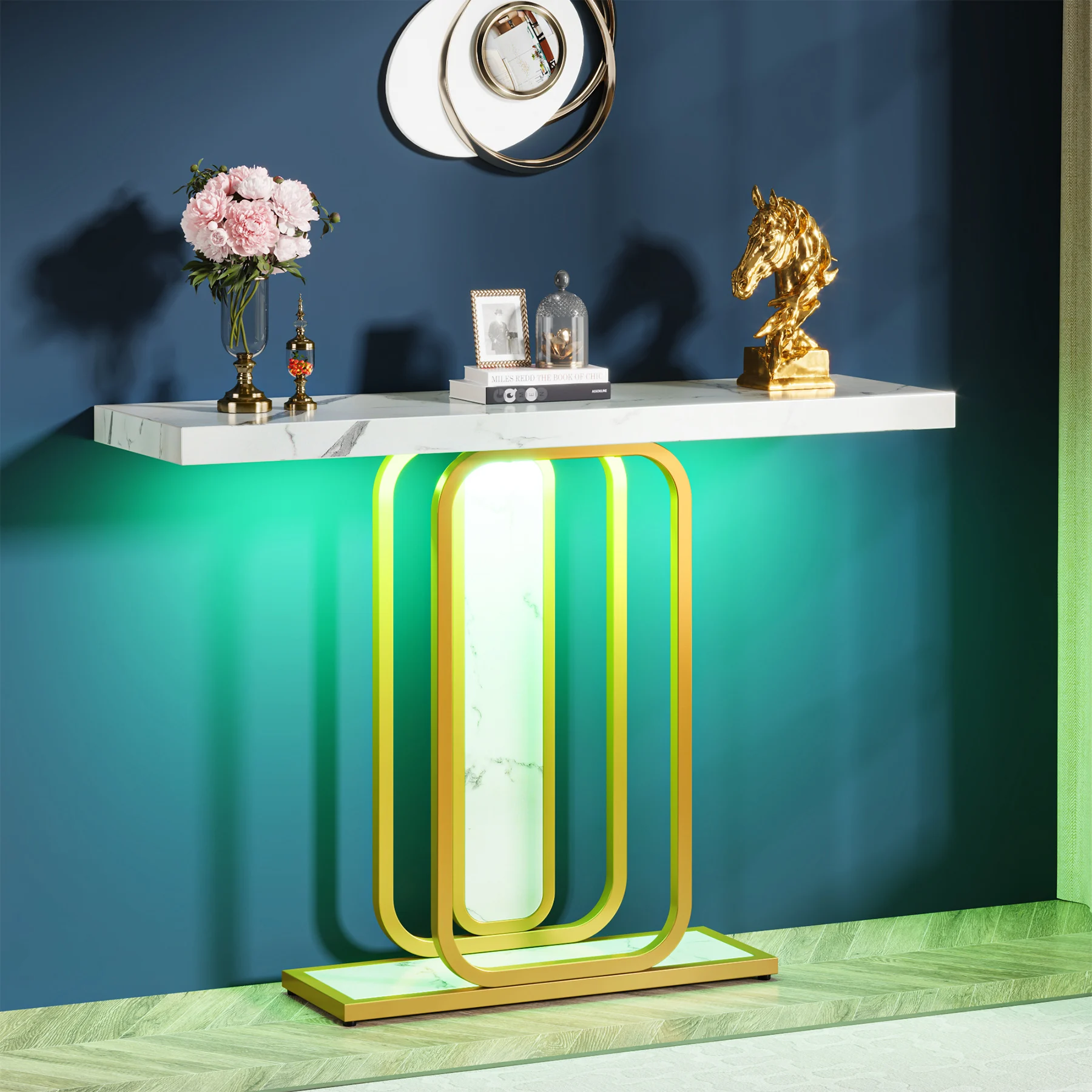 MonoWood Modern Gold White Console Table with LED Lights, Entryway Hallway Foyer Accent Table with Faux Marble Veneer
