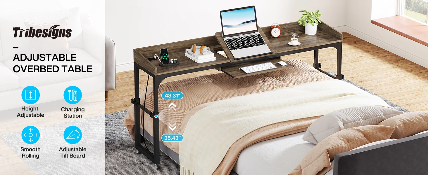 to accommodate your laptop, books, tablet, lamp, and other essentials.[Adjustable Tilt Board for Optimal Viewing]: This overbed desk features