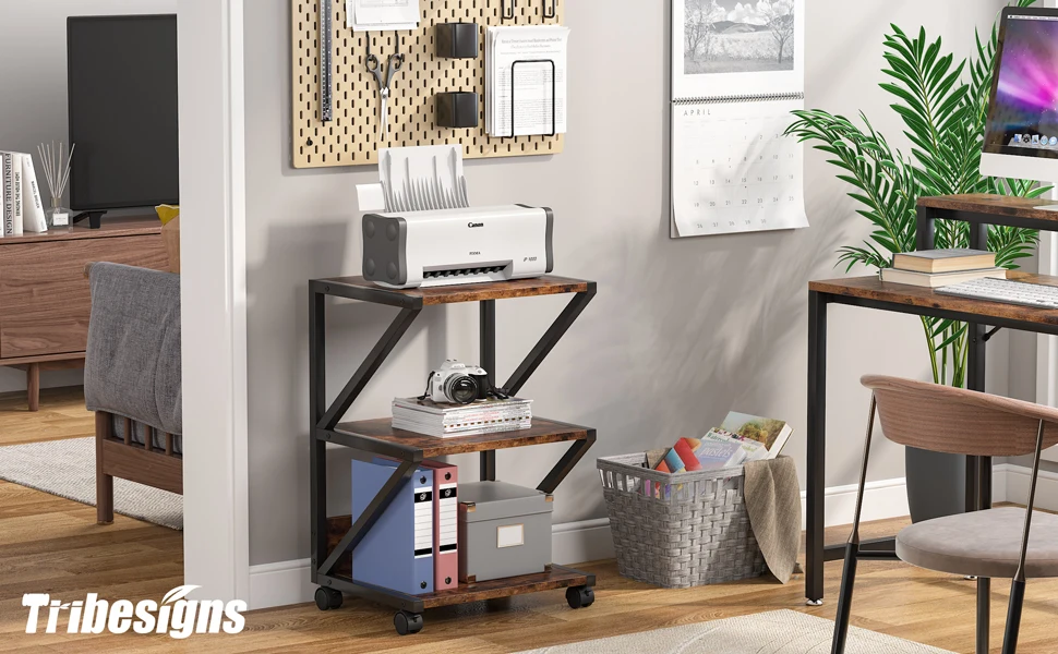 [Ample Storage]: Designed with 3 tier open shelves, the Tribesigns printer table can help you free up precious space on the desk. Put the printer, fax, scanner, and other office machines on the top, files, books, magazines, printer cartridges, and clips can be placed on the lower shelves.
