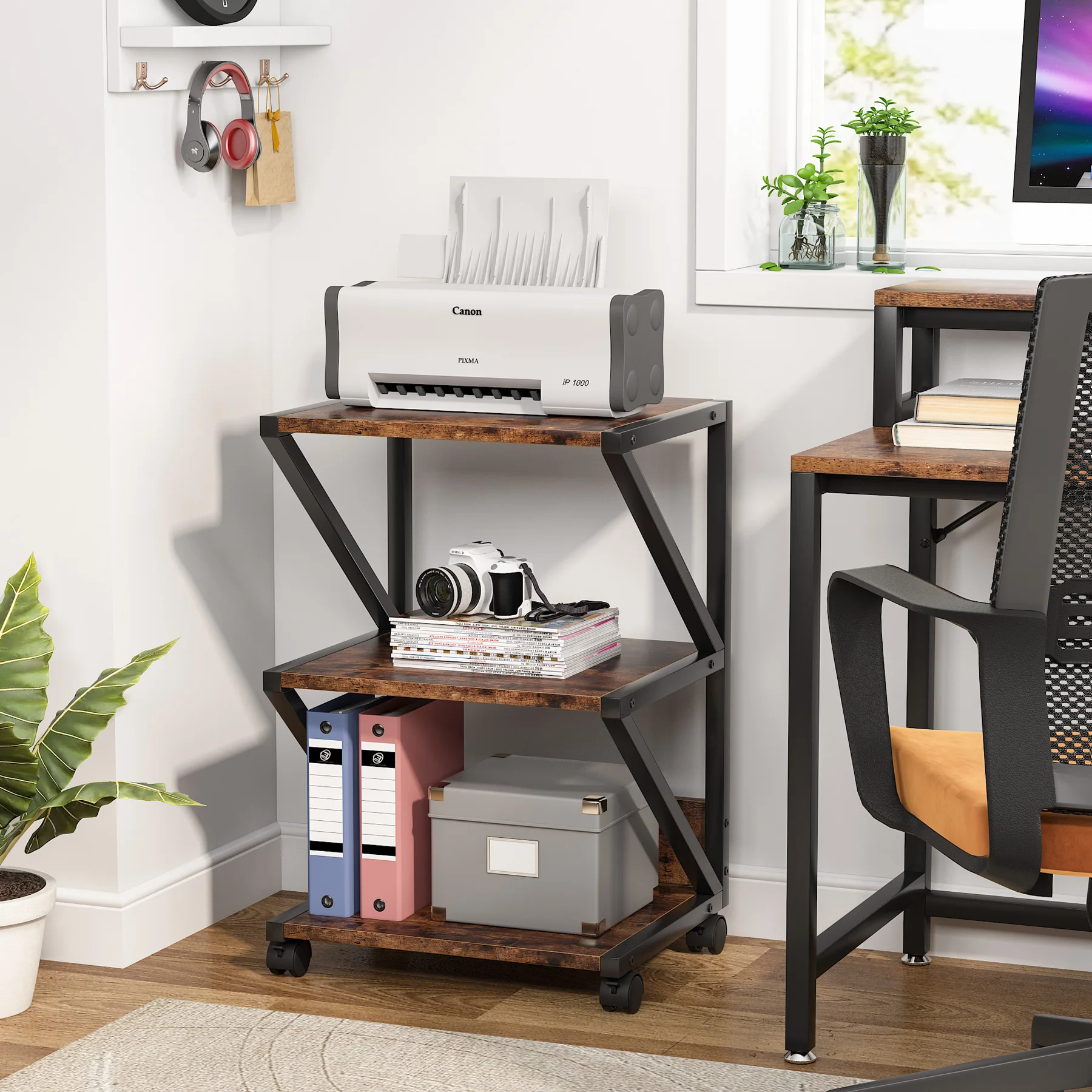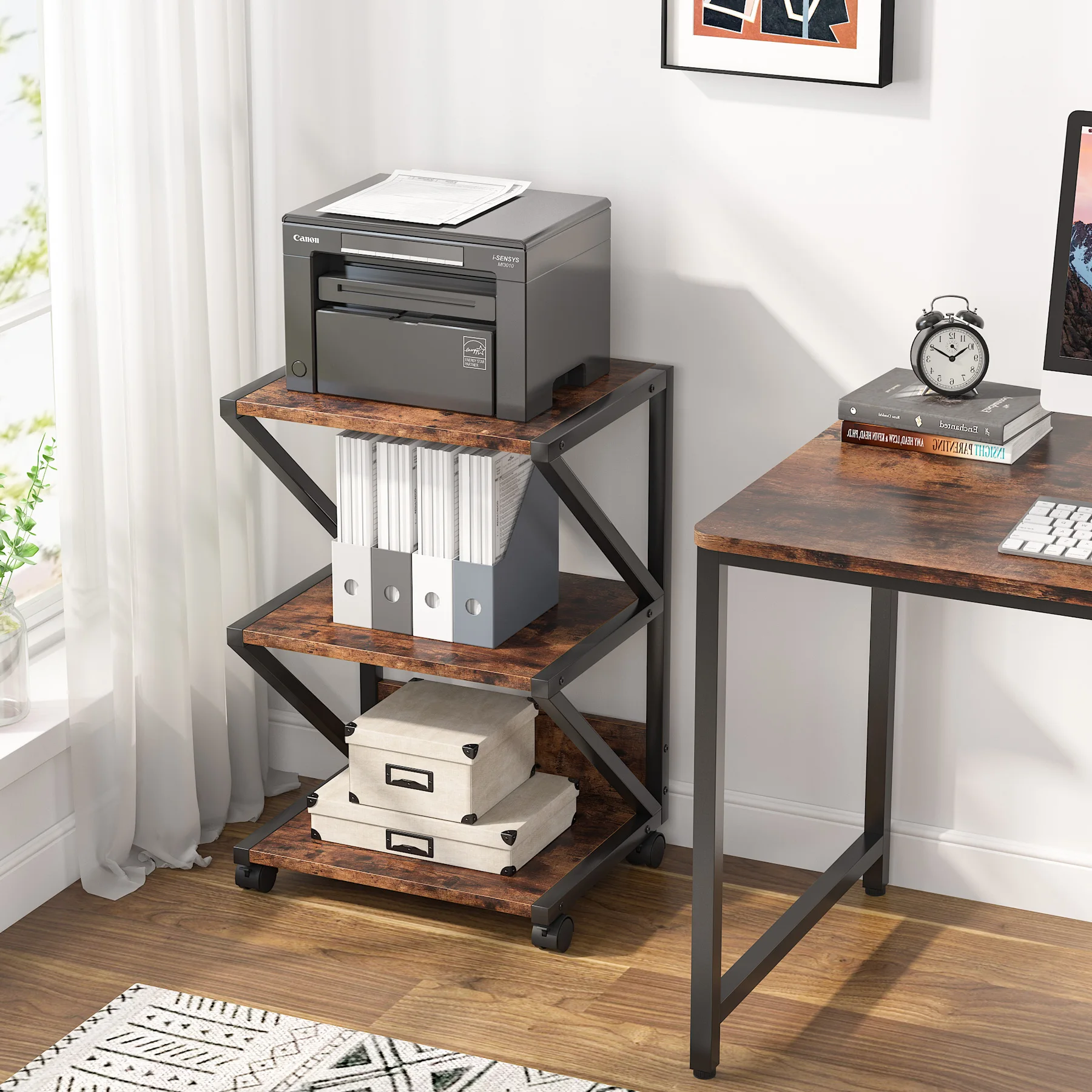[Multi-purpose]: Simple black lines fuse with rustic flair to give this printer stand a refreshed appearance that creates charming style to your home. It's not only a printer stand, but also a storage cart, side table, or kitchen cart.